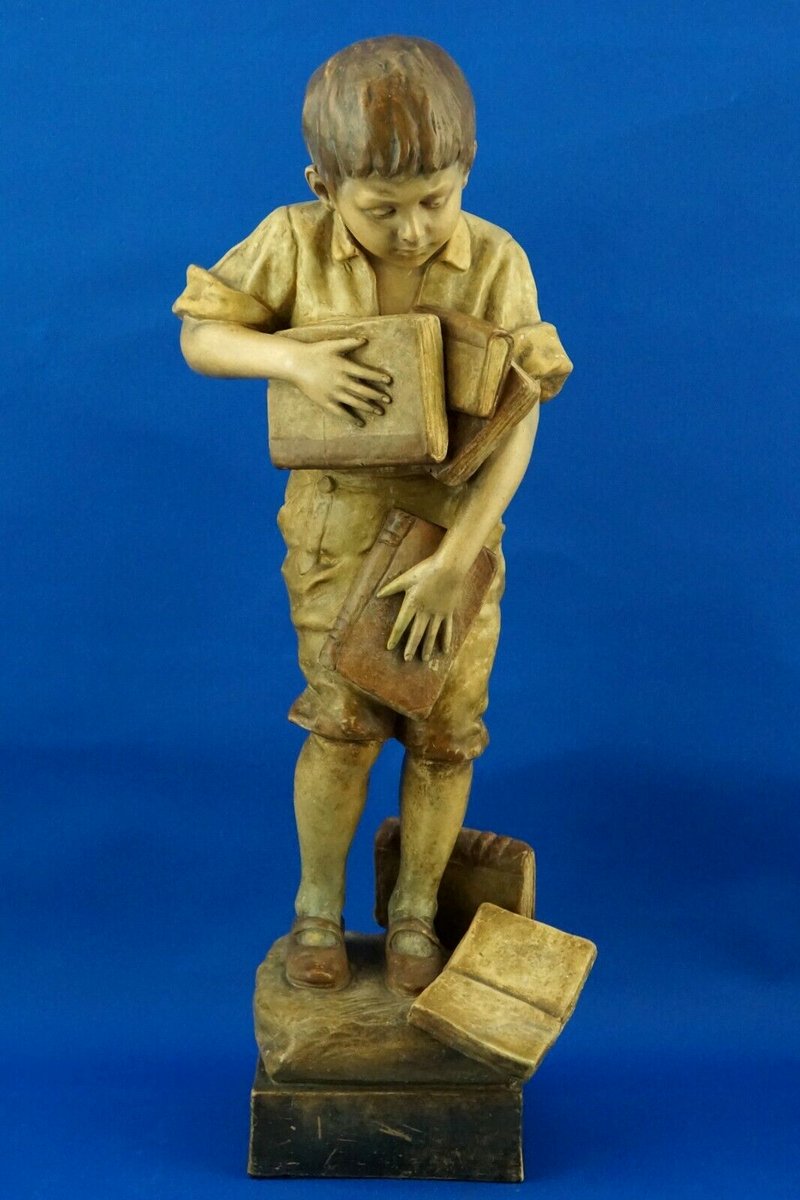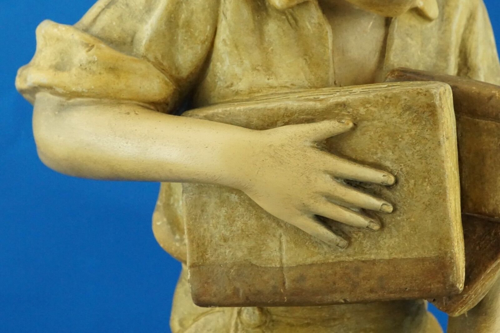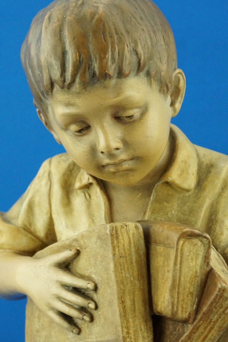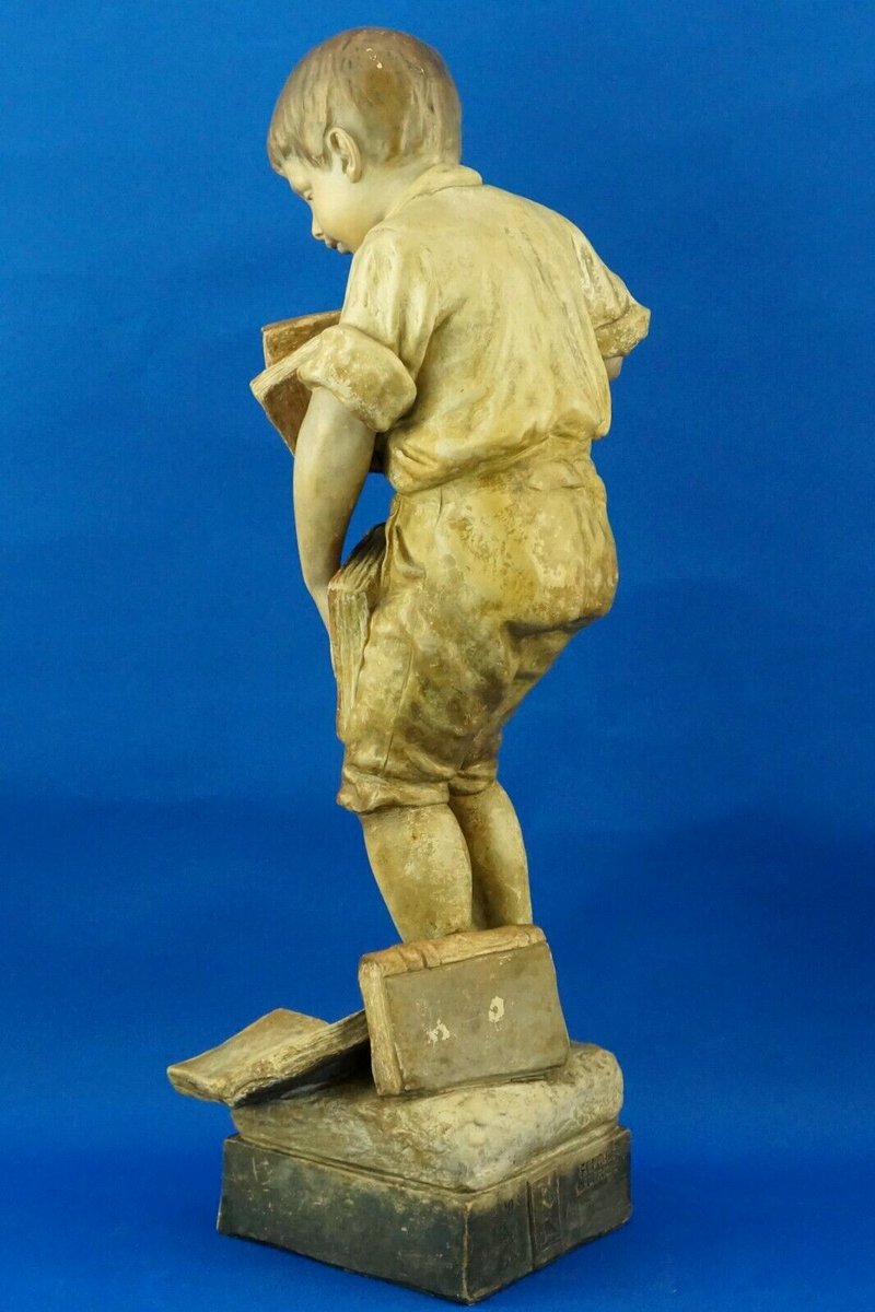19th Century Terracotta Sculpture Child with Books by Otto Petri for Goldscheider, Austria, 1800s