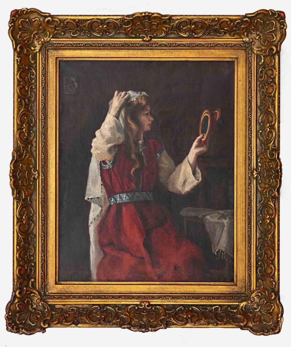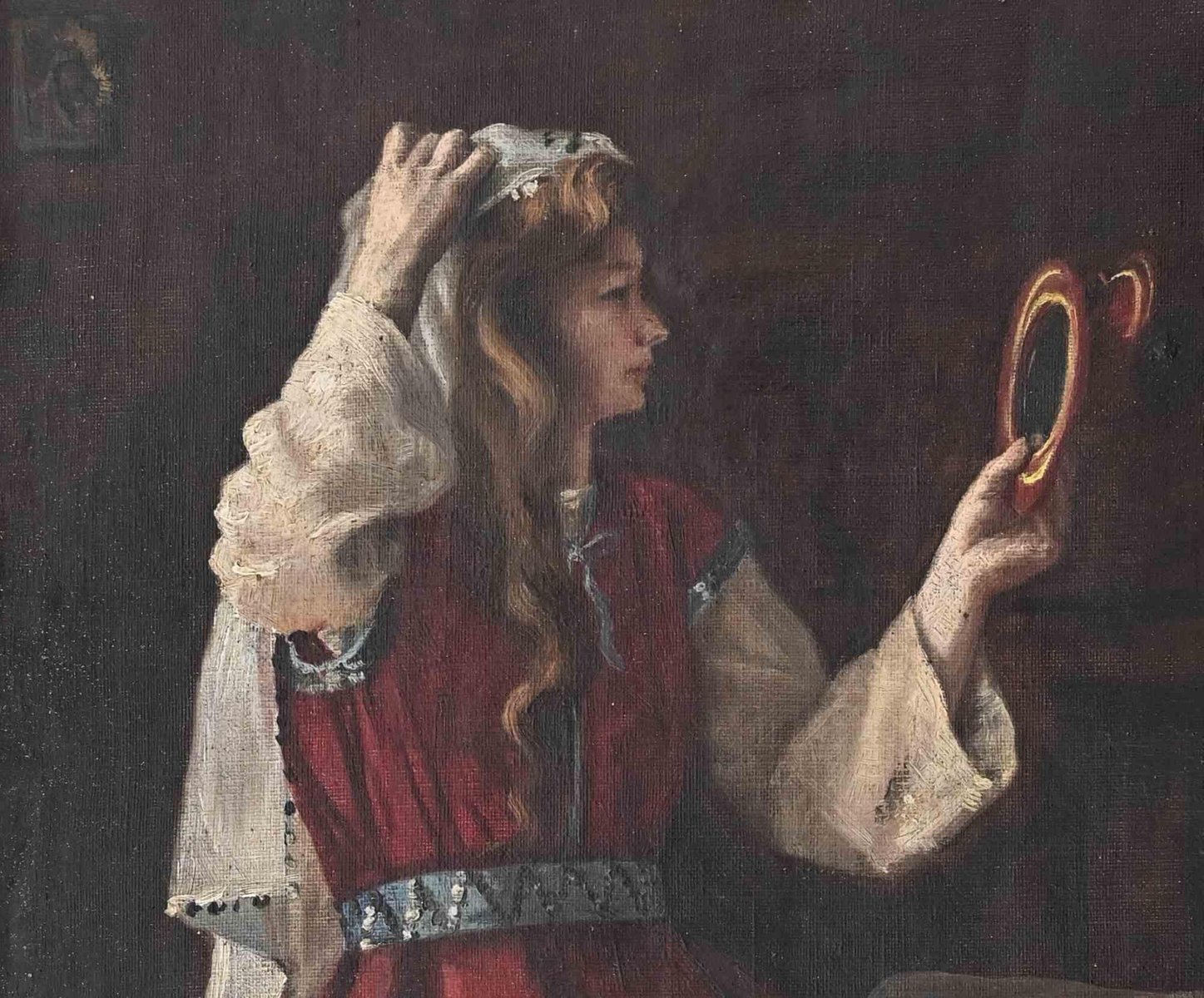 A Young Oriental Woman Looking at the Mirror, Oil on Canvas, 19th-Century