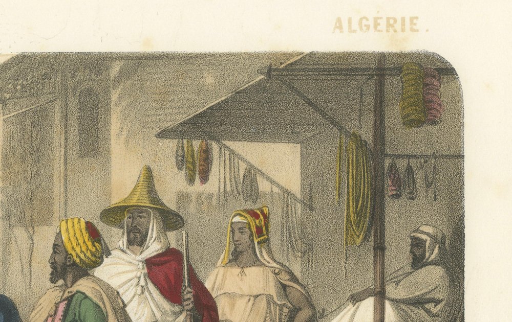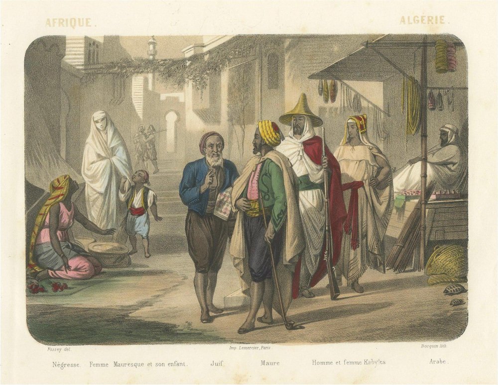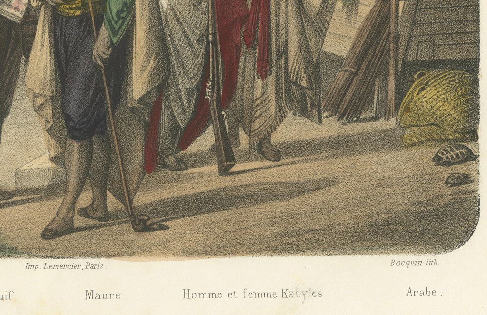 Algerian Street Scene – Moors, Kabyles, and a Moorish Woman with Child, c.1845 This beautifully hand-colored lithograph, titled “Afrique – Algérie,” is taken from Le Monde en Estampes: Types et Costumes des Principaux Peuples de l’Univers, published in Paris circa 1845–1850 by Amédée Bedelet. Drawn by Fossey, lithographed by J. Bocquin, and printed by Lemercier, this series is among the most refined mid-19th-century French works illustrating traditional costumes and cultural types from around the world. This plate presents a vivid street scene in Algiers, capturing the lively diversity of North African society during the early years of French colonial rule. The foreground features a Négresse seated on the ground, wearing a colorful draped garment, while a Femme Mauresque et son enfant (Moorish woman with her child) walk gracefully past her, both wrapped in white haiks, emblematic of modesty and local custom. To their right stands a Juif (Jewish man) in a blue tunic and cap, a representation of Algiers’ historic Jewish community. At the center, a Maure (Moor) wearing a broad straw hat and flowing robes converses with a Homme et femme Kabyles—figures from the Berber-speaking Kabyle people of the mountainous region east of Algiers. Their dress is distinctive: the man’s green jacket and striped cloak contrast with the woman’s white draped garments fastened with a fibula at the shoulder. To the far right, an Arabe reclines casually in a shaded market stall, surrounded by baskets, ropes, and wares, observing the activity of the marketplace. In the background, arched doorways and whitewashed buildings with latticed windows evoke the narrow streets of the Algiers Casbah. The play of light and shadow, together with the variety of garments, textures, and skin tones, gives the composition both depth and warmth. This image reflects the 19th-century French fascination with North Africa following the conquest of Algeria in 1830. It combines ethnographic observation with Orientalist idealization, portraying cultural difference through costume, posture, and setting. Lemercier’s lithography captures these details with clarity and refinement, while the subtle hand-coloring brings the scene vividly to life. Condition report: Good impression with bright original coloring. Some foxing and toning confined to the margins, image area clean and fresh. Wide borders preserved. Framing tips: Best displayed with an ivory or light sand-colored mat and a gilt or walnut frame. A darker wood frame such as mahogany or ebony will enhance the warm earth tones of the Algerian architecture and costumes. Technique: Hand-colored lithograph Maker: J. Bocquin after Fossey, printed by Lemercier, Paris, circa 1845