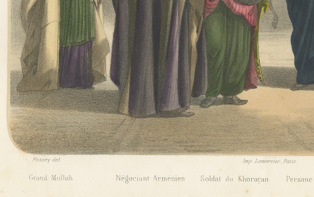 Persian and Armenian Figures – Asia Minor and Khorasan Costumes, c.1845 This magnificent hand-colored lithograph, titled “Asie – Turquie d’Asie,” is drawn from the renowned Parisian series *Le Monde en Estampes: Types et Costumes des Principaux Peuples de l’Univers*, published around 1845–1850 by Amédée Bedelet. The image was drawn by Fossey, lithographed by J. Bocquin, and printed by the master lithographer Lemercier in Paris. The series, accompanied by text by Élisabeth Müller, sought to document the diverse costumes and customs of peoples across the world, merging ethnographic observation with Romantic artistry. This striking composition offers a vivid tableau of Persian and Armenian life within the cultural sphere of Asia Minor. At the left stands a *Grand Mollah*, a dignified religious scholar in a flowing robe of cream and green, his beard and turban signifying authority and learning. Beside him, a richly dressed *Négociant Arménien* (Armenian merchant) converses with a *Soldat du Khorassan*, whose vibrant garments of red and green and ornate shield mark his status as a soldier from northeastern Persia. In the center, a *Persane, costume de ville* walks with elegant poise, her long indigo cloak and white face veil reflecting the modest yet refined urban attire of 19th-century Persian women. A small child follows at her side, adding a touch of intimacy to the grand Oriental setting. To the right, a *Marchand Persan* (Persian merchant) sits cross-legged on a richly woven carpet, offering tea and goods for trade, his striped robes and turban rendered in striking tones of red, blue, and gold. Behind him, horsemen and veiled women animate the courtyard scene, framed by crenellated city walls and domed architecture suggestive of Isfahan or Tehran. The composition captures the exotic splendor and social diversity of Persian life as imagined through mid-19th-century French eyes, balancing ethnographic authenticity with the romantic Orientalism that fascinated European audiences. Lemercier’s lithography achieves remarkable depth and texture, while the delicate hand-coloring accentuates the opulence of textiles and the atmosphere of warmth and dignity. Plates such as this from *Le Monde en Estampes* are admired for their beauty and documentary value, offering a window into 19th-century perceptions of the East and its cultural richness. Condition report: Fair to good condition with foxing and light age toning primarily in the margins. The image area remains clean and vibrant, colors bright and unfaded. Framing tips: Best suited to a cream or soft sand-colored mat and a gilt or rosewood frame. The warm palette of the print also pairs elegantly with a deep blue or burgundy mat for a more dramatic display. Technique: Hand-colored lithograph Maker: J. Bocquin after Fossey, printed by Lemercier, Paris, circa 1845