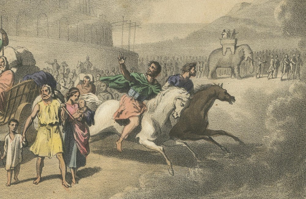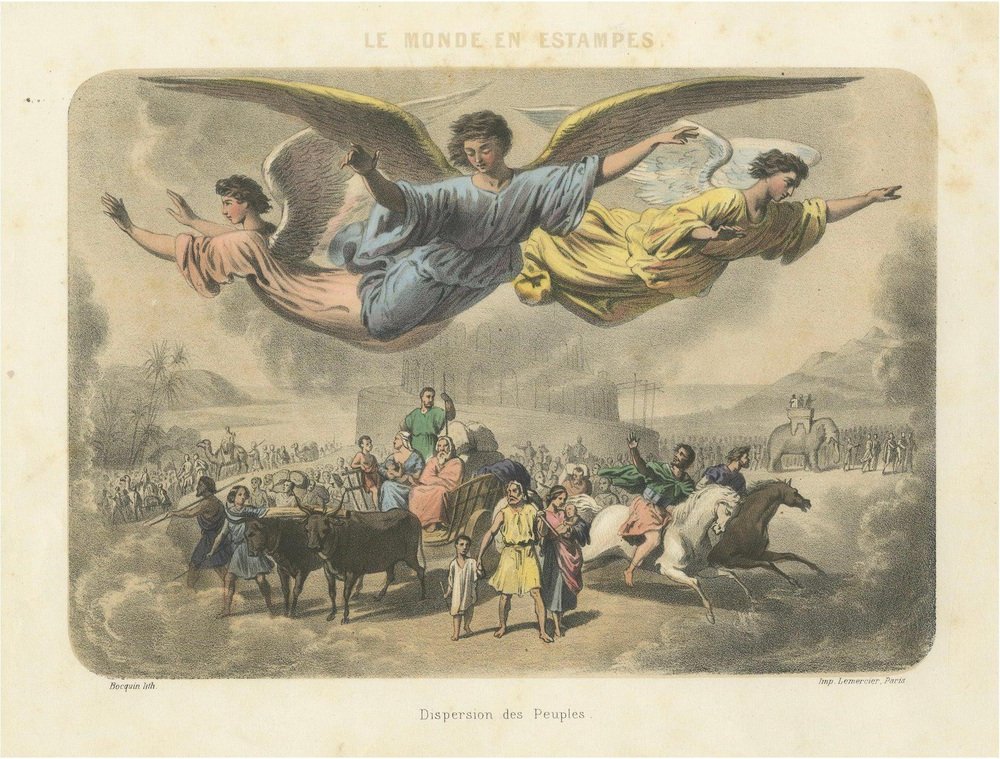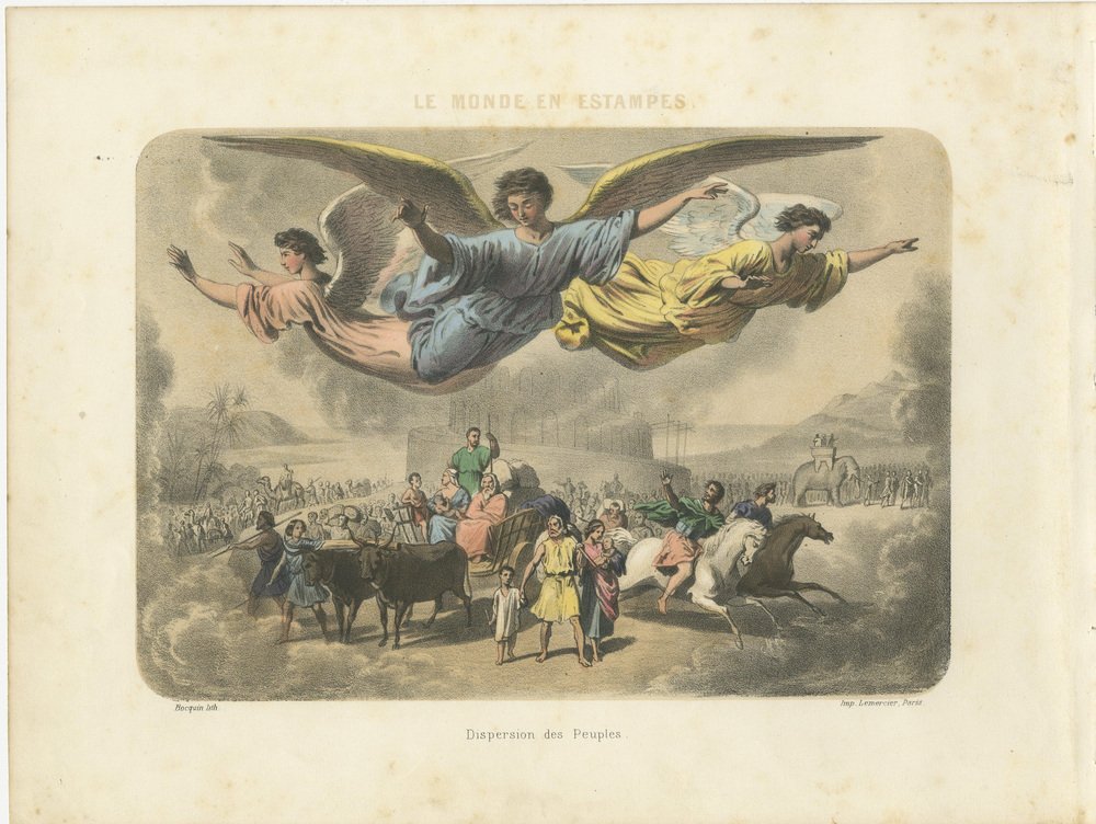 Dispersion des Peuples – Allegorical Lithograph from Le Monde en Estampes, c.1845 This beautiful mid-19th-century hand-colored lithograph, titled “Dispersion des Peuples,” serves as the grand allegorical frontispiece to the French publication Le Monde en Estampes: Types et Costumes des Principaux Peuples de l’Univers, printed in Paris around 1845–1850. The image was lithographed by J. Bocquin after designs by the celebrated artists Maurice Leloir and Jean-Baptiste Fossey, and printed by the prestigious Imprimerie Lemercier. The accompanying text of the book was written by Élisabeth Müller and published by Amédée Bedelet, Libraire-Éditeur, 20 rue des Grands-Augustins, Paris. This composition represents the “Dispersion of the Peoples,” a symbolic and dramatic scene echoing the biblical or mythic theme of humanity spreading across the world after the confusion of tongues at the Tower of Babel. Three large winged angels dominate the heavens, gliding across the sky with outstretched arms, their robes flowing in tones of blue, rose, and gold. They appear as divine messengers or allegories of destiny, guiding and overseeing the migration of humankind below. Beneath them unfolds a dynamic landscape teeming with people and animals on the move—figures of different origins leading oxen and carts, families walking together, and riders on horseback. The setting, suffused with dust and motion, evokes both the hardship and hope of humanity’s journey toward dispersion and discovery. The scene harmonizes Romantic allegory with ethnographic curiosity, prefiguring the plates that follow in the series depicting the costumes and cultures of nations around the globe. The detailed drawing, refined coloring, and delicate lithographic shading are typical of Lemercier’s Paris workshop, renowned for its high-quality chromolithographic productions during the golden age of French lithography. As a frontispiece to Le Monde en Estampes, this plate occupies a unique place in the collection: it introduces the viewer to the philosophical idea underlying the entire series—the unity of humankind through its diversity. A splendid combination of art, mythology, and early anthropological interest, this print exemplifies the spirit of mid-19th-century European humanism and visual culture. Condition report: Good condition for age with mild foxing, light toning mainly to margins, and some faint spotting on the upper and right edges. The impression is strong with vibrant, well-preserved color. Paper retains full margins. Framing tips: This print displays beautifully when matted with an off-white or ivory mount and framed in a gold or walnut wooden frame to complement the warm tones of the lithograph. For a more dramatic presentation, a dark charcoal or olive mat may enhance the ethereal presence of the angelic figures. Technique: Hand-colored lithograph Maker: J. Bocquin (after Leloir & Fossey), printed by Lemercier, Paris, circa 1845