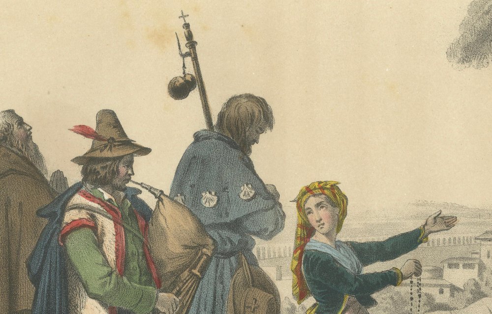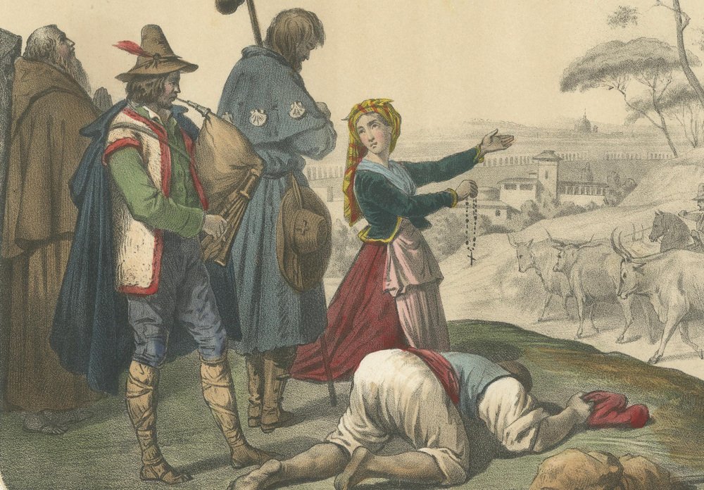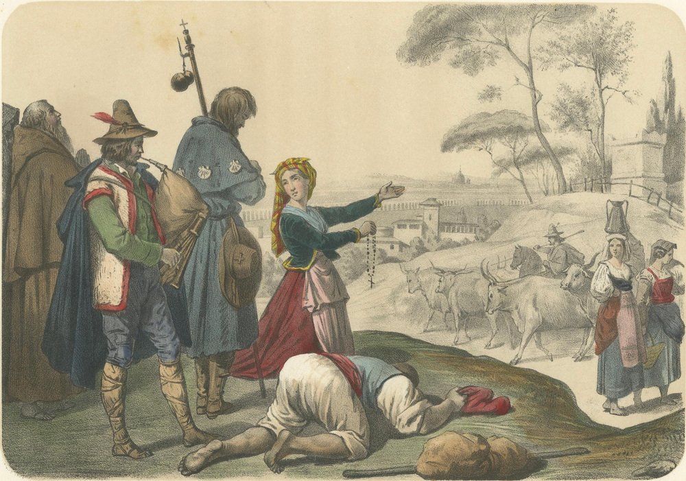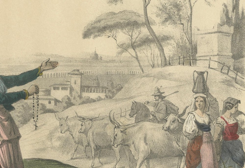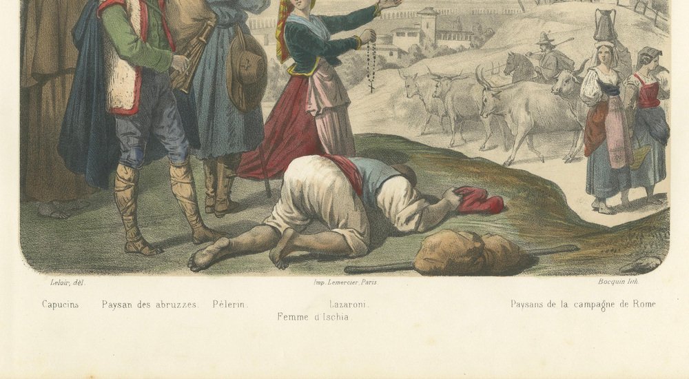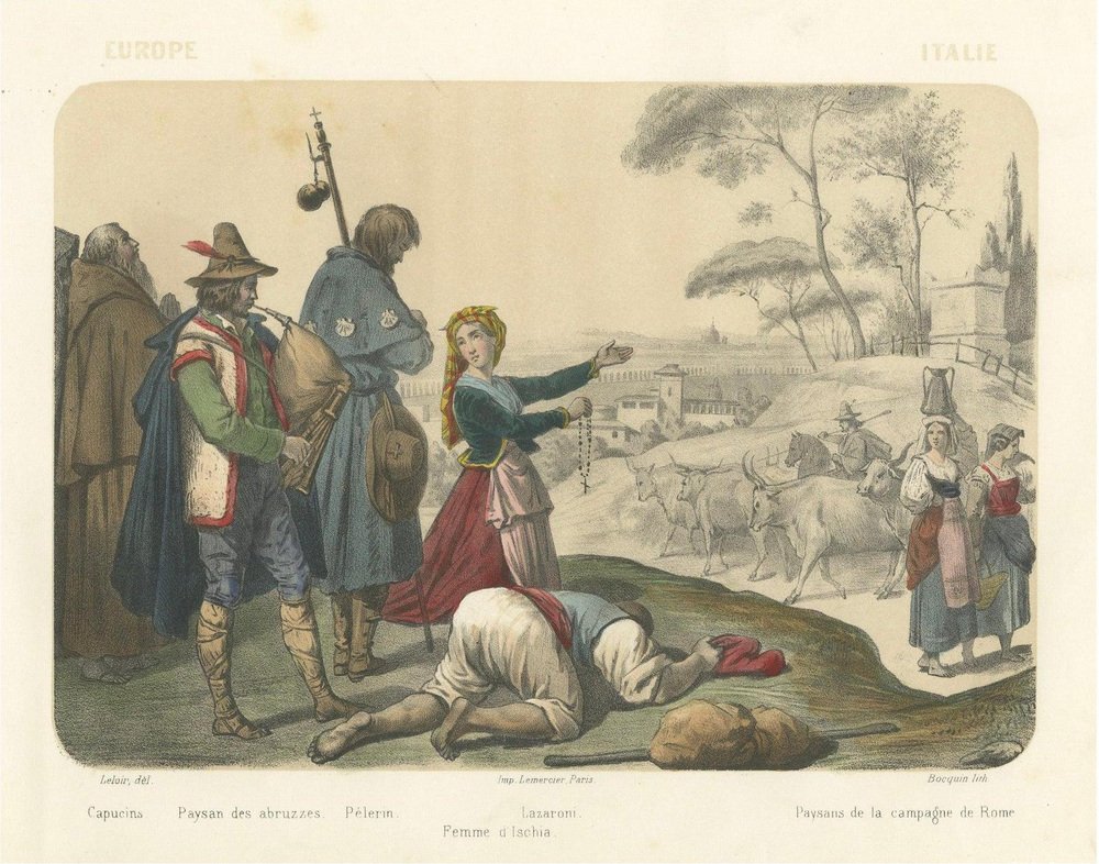 Italian Regional Costumes – Peasants of Rome and Abruzzo, Femme d’Ischia, c.1845 This richly detailed hand-colored lithograph, titled “Europe – Italie,” comes from the celebrated French series Le Monde en Estampes: Types et Costumes des Principaux Peuples de l’Univers, published in Paris around 1845–1850. The composition was drawn by Leloir, lithographed by J. Bocquin, and printed by the renowned Imprimerie Lemercier for publisher Amédée Bedelet. The series, with text by Élisabeth Müller, sought to depict the diverse costumes and customs of people across the world with both ethnographic precision and Romantic sensibility. This plate presents a vivid tableau of Italian life, featuring figures from various regions and social conditions. In the foreground, a humble Lazzaroni (street beggar of Naples) lies prostrate, his cap discarded beside him, while a woman identified as Femme d’Ischia turns toward him in compassionate gesture, holding a rosary—an emblem of faith and charity central to Italian popular devotion. To the left, a Paysan des Abruzzes (peasant from the Abruzzo region) stands proudly with his traditional fur-trimmed vest and rustic gaiters, playing the bagpipe, while a Capucin monk and a Pèlerin (pilgrim) pass solemnly behind him, their attire marked by the scallop-shell badges of devotion. In the background, framed by elegant pine trees and rolling hills, oxen draw carts along a rural road, where two paysannes de la campagne de Rome converse in colorful dress. Their clothing—white blouses, wide skirts, and headscarves—reflects the practical yet graceful style of Roman countrywomen. Beyond them, a faint skyline suggests the domes and distant walls of Rome, situating the scene in the pastoral outskirts of the Eternal City. The composition captures the coexistence of piety, poverty, and rural vigor that characterized mid-19th-century Italy. Its nuanced balance between documentary realism and poetic atmosphere typifies the Romantic ethnographic art of the period. Each costume is rendered with care, the hand coloring emphasizing rich earthy tones, deep blues, and muted reds, highlighting the varied texture of fabrics and regional styles. Plates like this from Le Monde en Estampes hold enduring value as both historical documents and works of art, portraying Italy’s cultural diversity before modern unification. Condition report: Good impression with vivid original coloring. Some minor foxing and light toning confined to margins, image clean and bright with full borders. Framing tips: Beautifully suited to an off-white or cream mat within a gilt or walnut frame. Alternatively, a dark olive or mahogany wood frame enhances the earthy palette and classical Italian atmosphere of the composition. Technique: Hand-colored lithograph Maker: J. Bocquin after Leloir, printed by Lemercier, Paris, circa 1845