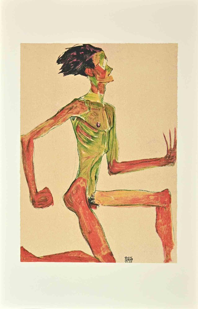 After Schiele, Kneeling Male Nude in Profile, Lithograph, 2007