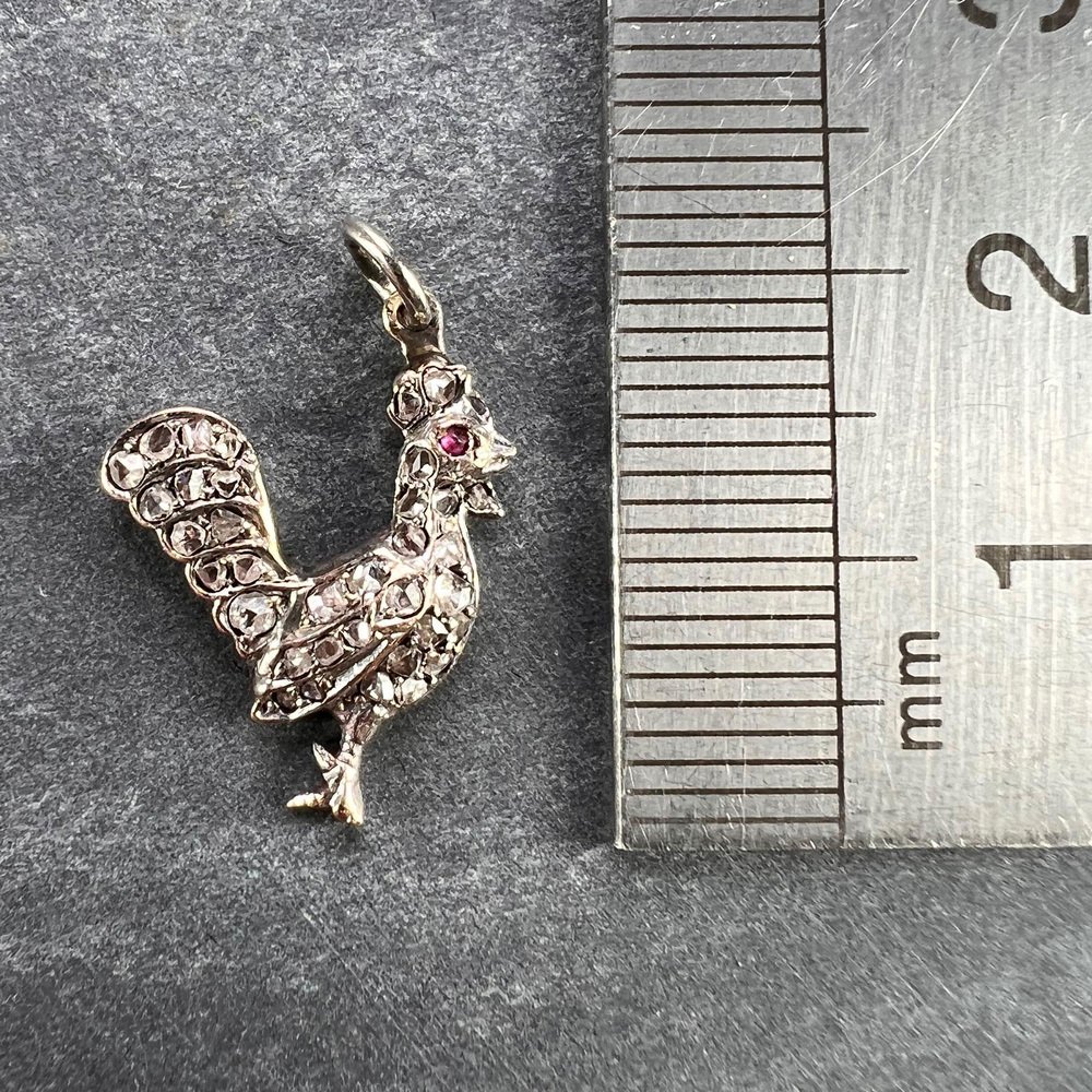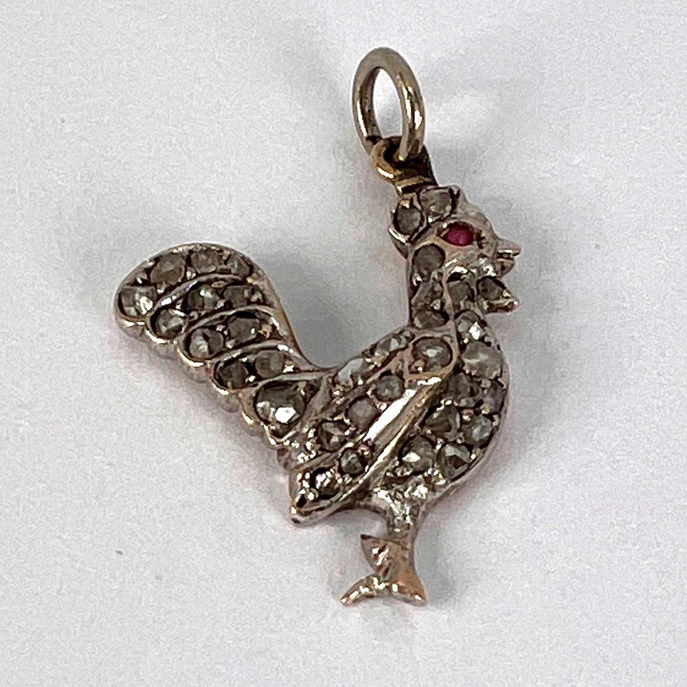Antique 18k Rose Gold Silver Ruby Diamond Rooster Charm Pendant, 1890s