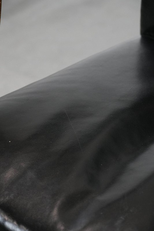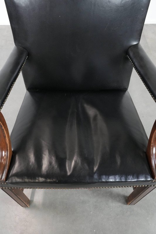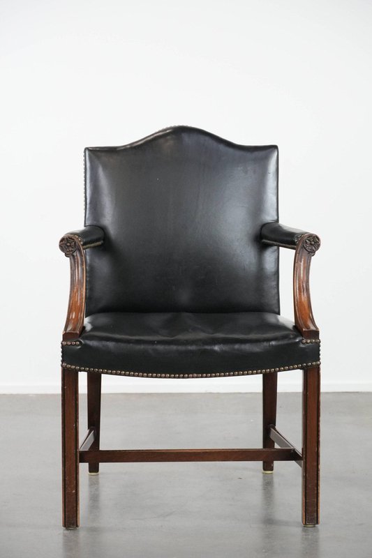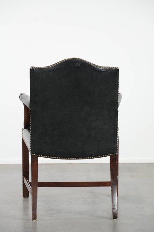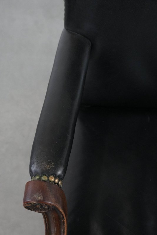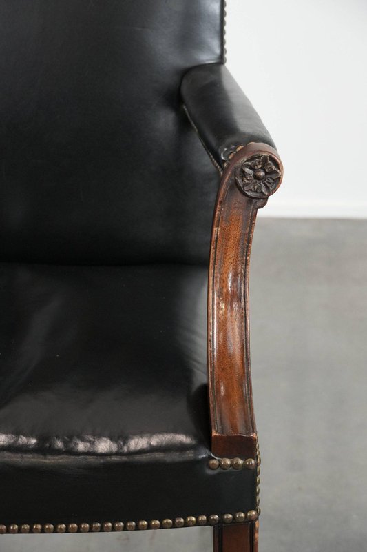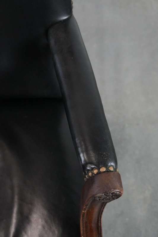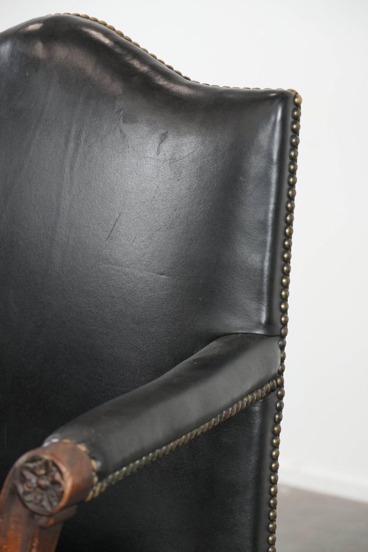 Antique English Gainsborough Chair in Wood and Black Cowhide