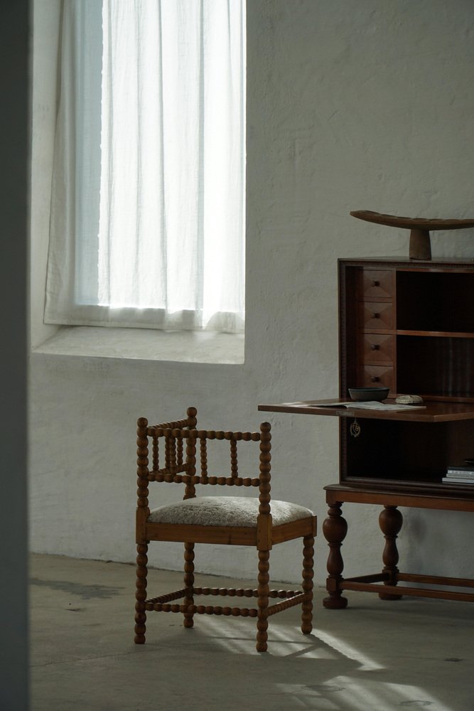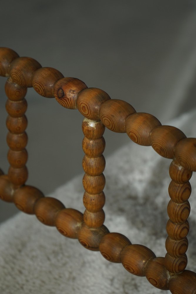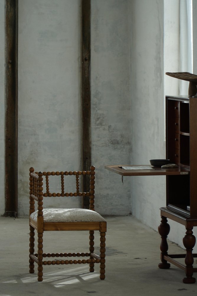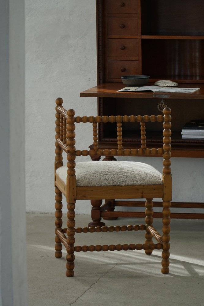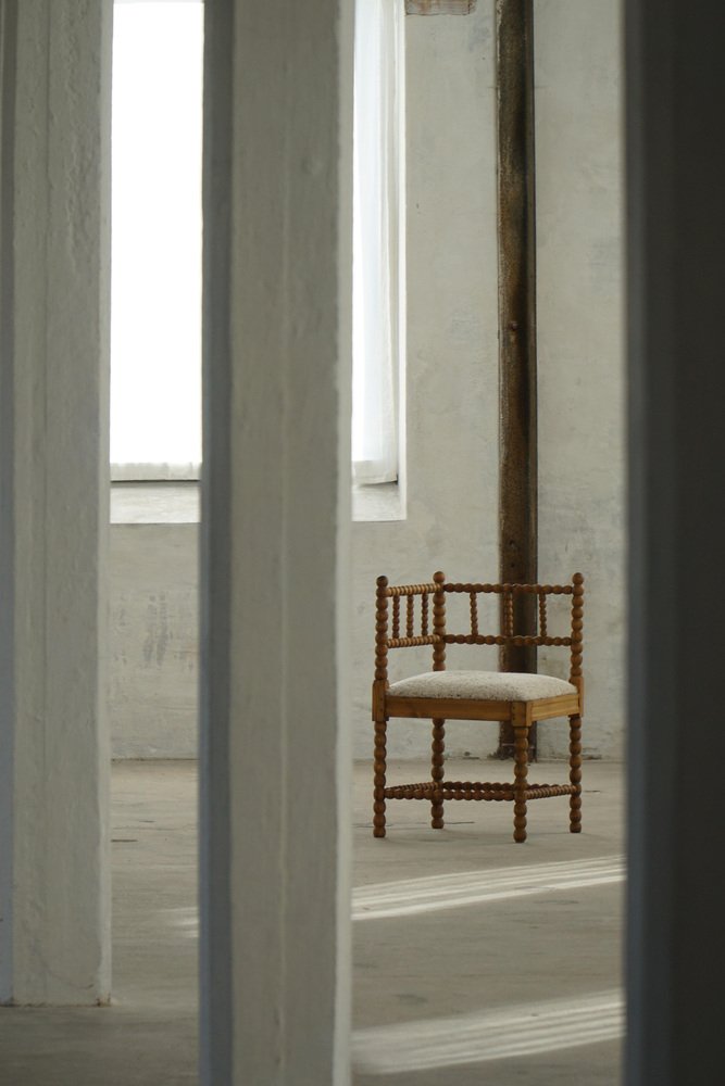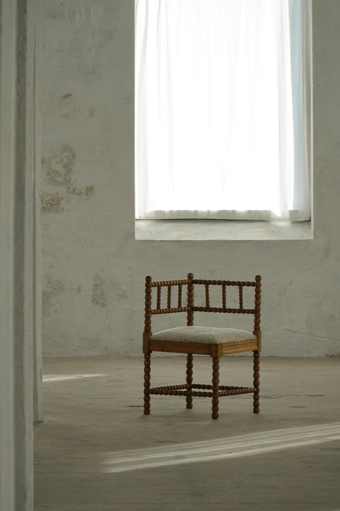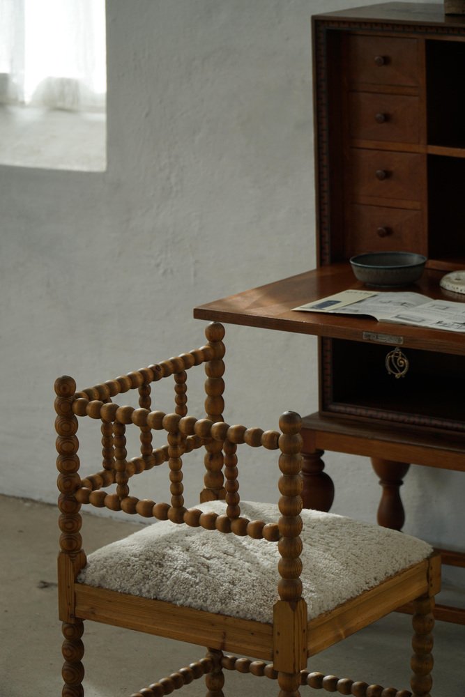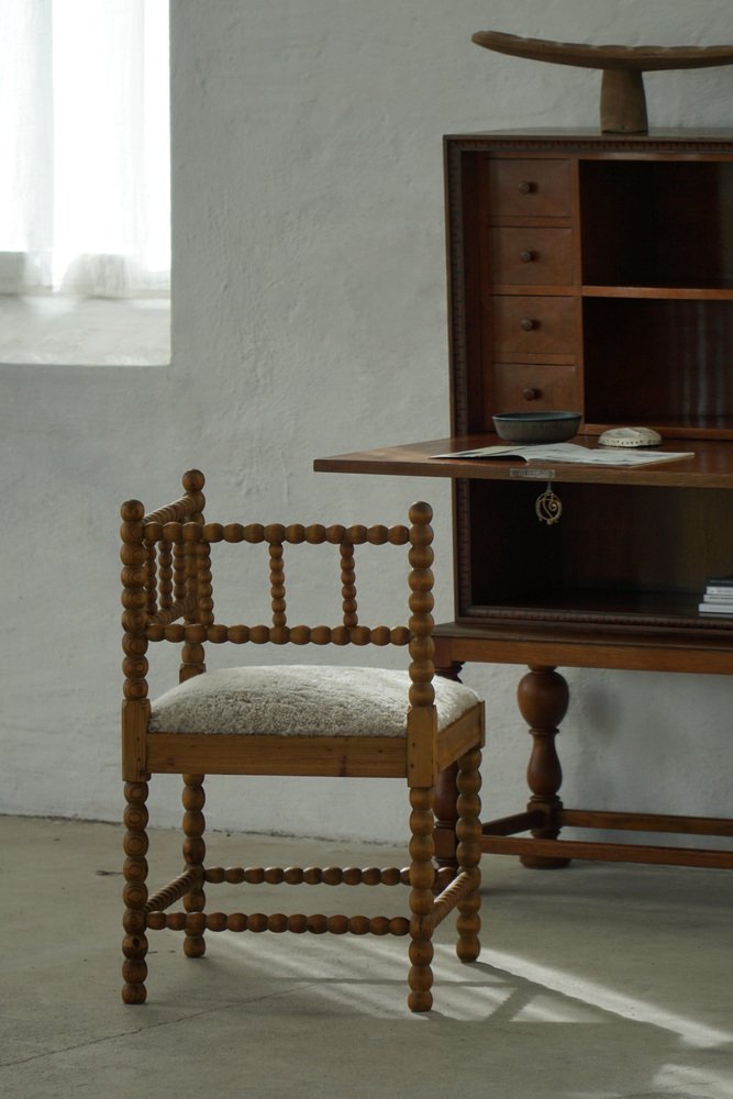 Antique French Hand-Crafted Bobbin Corner Chair with Lambswool, 1920s