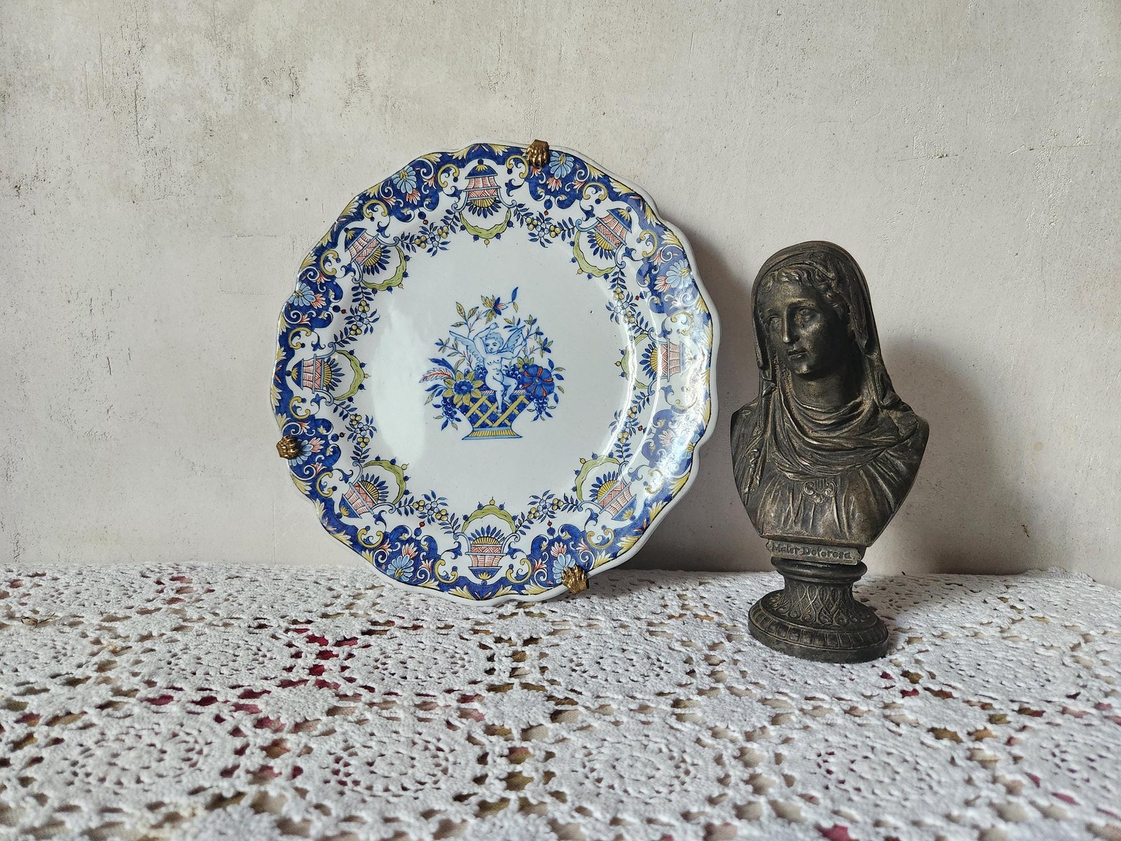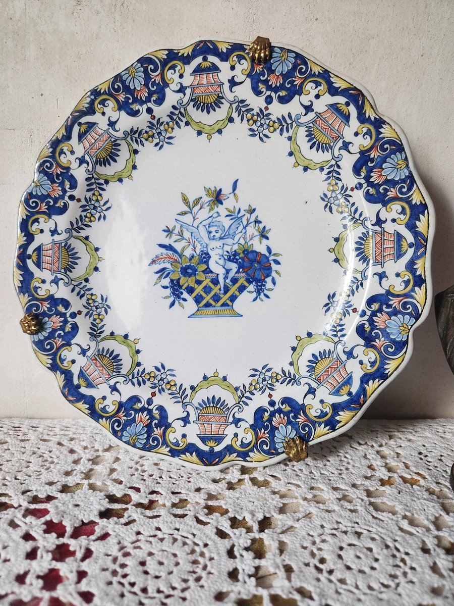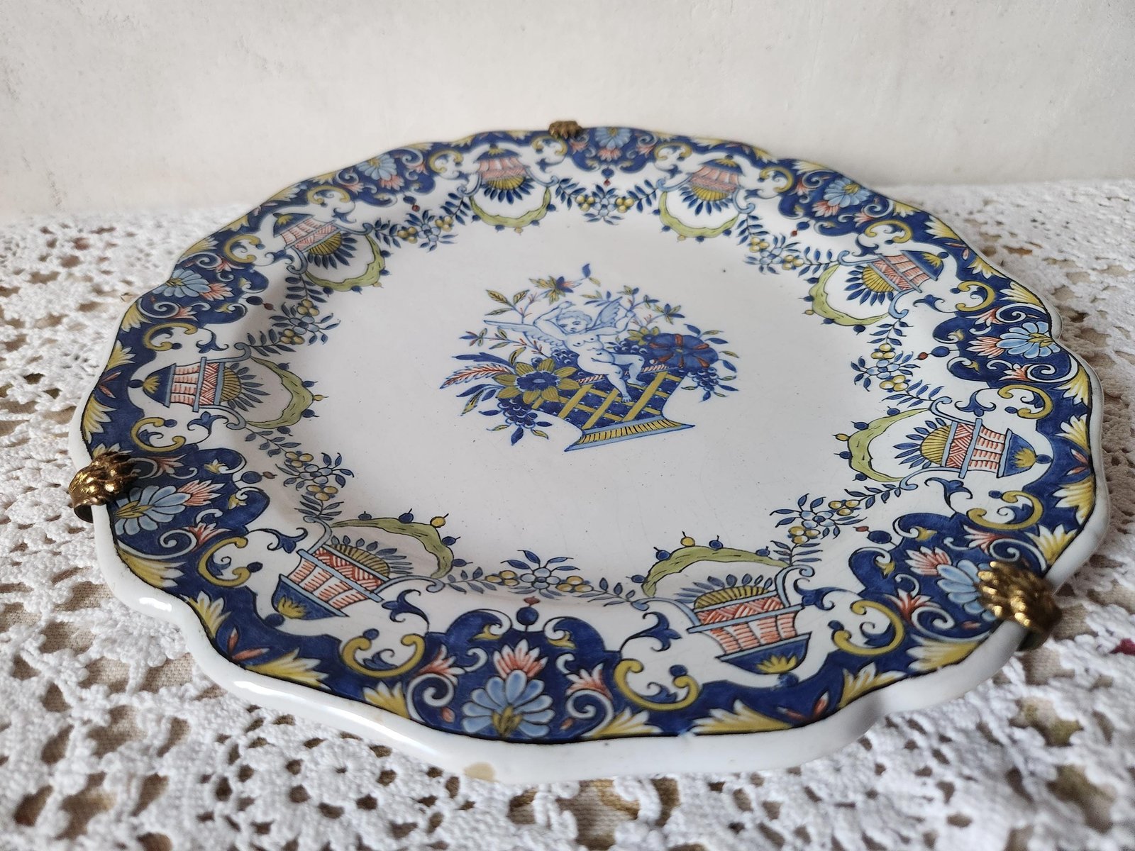 Antique French Quimper Plate with Cherub and Floral Decor and Lion Claw Brass Hanger, 19th Century