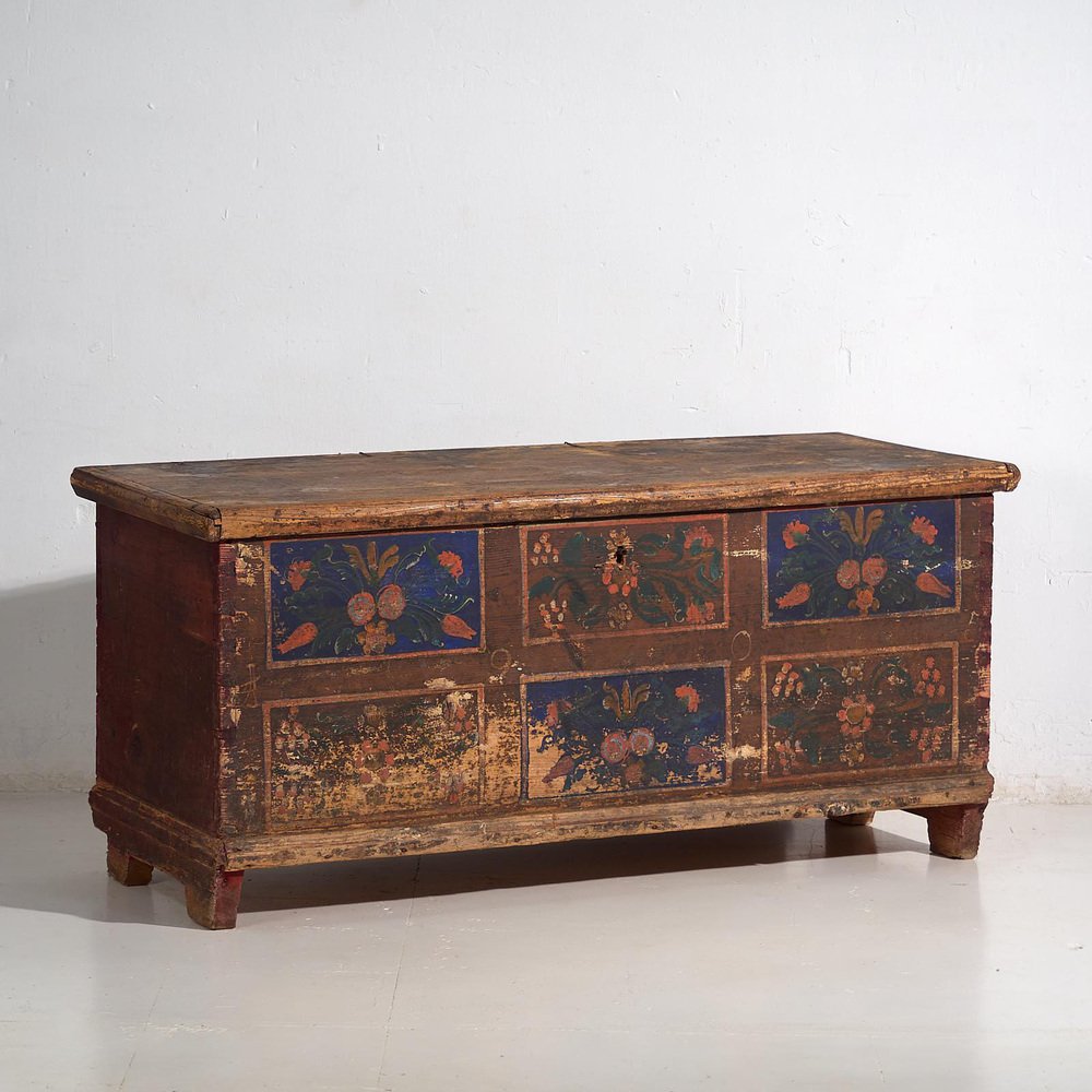 Antique Wooden Chest with Blue Floral Panels, 1905