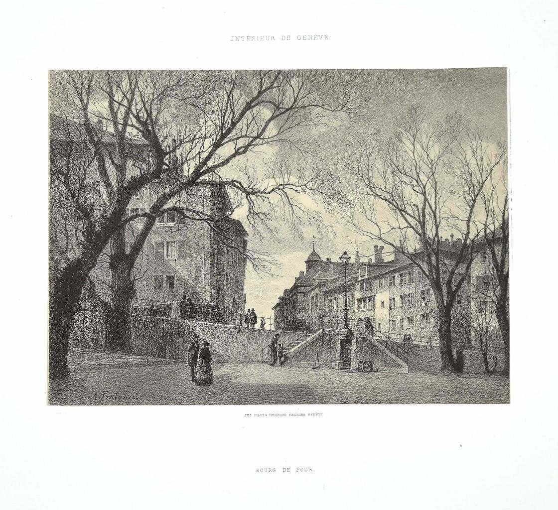 This splendid lithograph Interieur de Genève. Bourg De Four is part of the series of 20 prints dedicated to views of the city of Geneva, engraved by the Italian artist Antonio Fontanesi in 1854. The lithograph is applied on a cardboard. The state of preservation of the artwork is excellent, except for a tiny tear of the paper on the higher margin. The signature is engraved on stone on the lower left. At the top of the paper, the inscription “Interieur de Genève”, whilst at the bottom, right below the image, the inscription “JMP Pilet & Cougnard Editeurs Genève”. Below, the writing “Bourg De Four” is printed. Antonio Fontanesi (Reggio Emilia, 1818 - Turin, 1882) was an Italian painter, engraver, teacher, and soldier. He was one of the most important 19th-century Italian painters, though somewhat unknown. After fighting in the I Independence War, he moved to Geneva, where he met local painters that encouraged him to paint landscapes and to open to European artistic novelties. In Paris, he met Corot and Barbizon painters, whilst in London he was influenced by Turner and Constable’s works. He taught in Lucca, Turin, and then in Tokyo. His artworks are very suggestive, rich in lyricism and in melancholic, Romantic and, according to some scholars, Pre-Symbolist atmospheres. Fontanesi observed and studied natural reality to reach a deeper and more universal motive and to find, reflected, human feelings: for this reason, he is considered one of the most emblematic Italian Romantic painters of the European Romantic movement. He was also a fine draftsman and expert etcher: his etchings and lithographs, like in this case, are characterized by the same research on atmospheric values as in painting, with synthetic and essential light effects. This is a beautiful artwork, an excellent engraving, depicting a Romantic view on a peculiar place in Geneva.