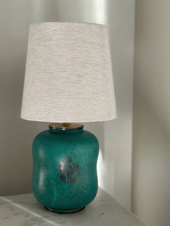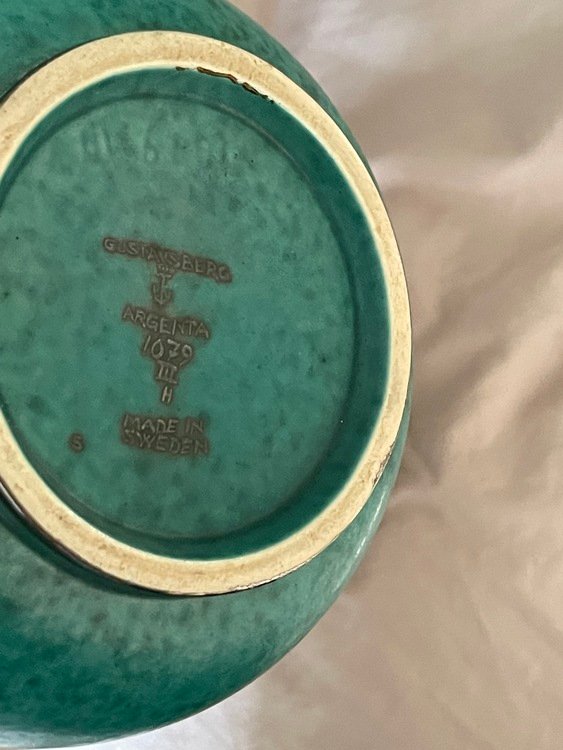 In 1930, Kåge exhibited his Argenta Series at the Stockholm Exhibition. This was his first successful foray in ceramics. The series, which included everything from ashtrays to urns, was glazed in red, brown and blue; but it was the pieces finished in a green glaze with silver adornments that really caught people’s attention. The earliest productions were handpainted by Kåge himself, but demand soon dictated that Gustavsberg expand, and by the late 1930s over 30 people were dedicated solely to the painting of Argenta. The most successful of all Kåge’s works, the series epitomizes the style that became known as Swedish Grace.