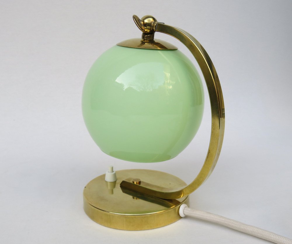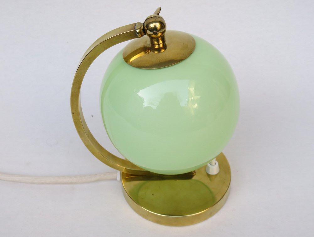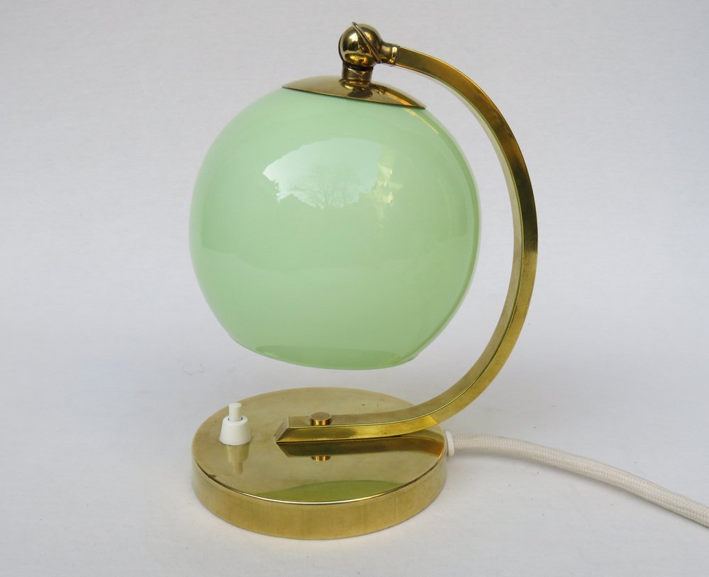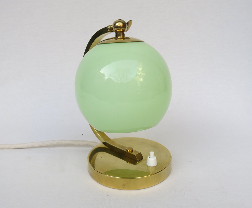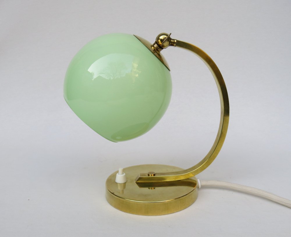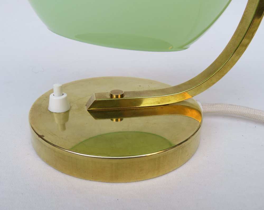 Art Deco Bedside Lamp in Brass with Green Cased Glass Shade, 1920s