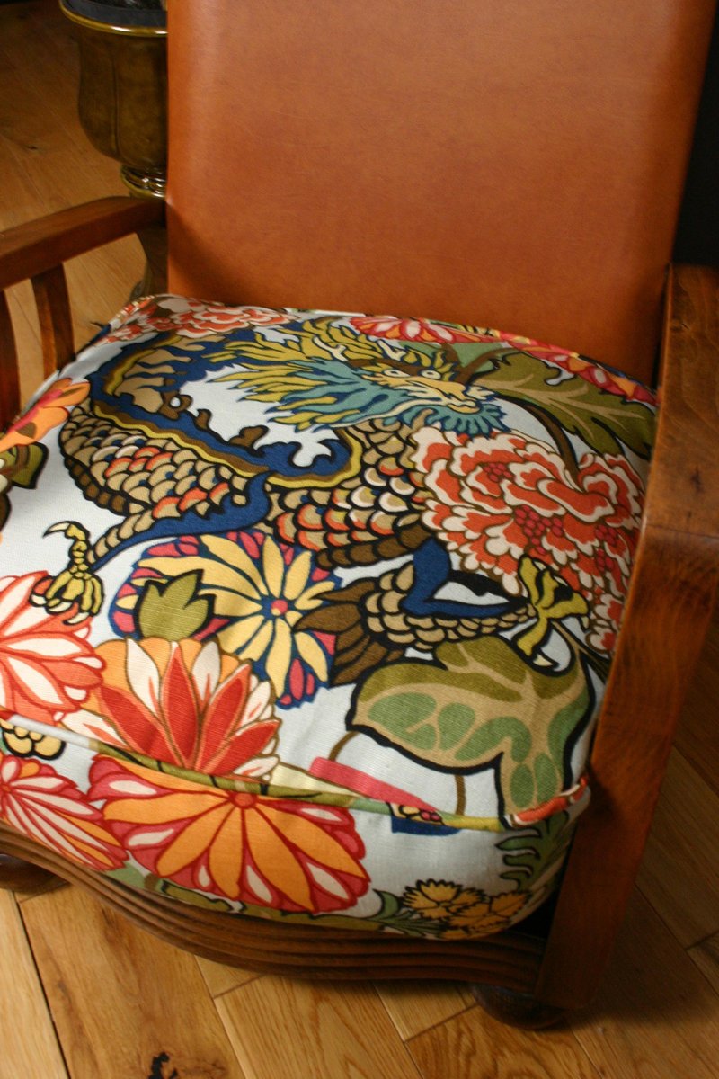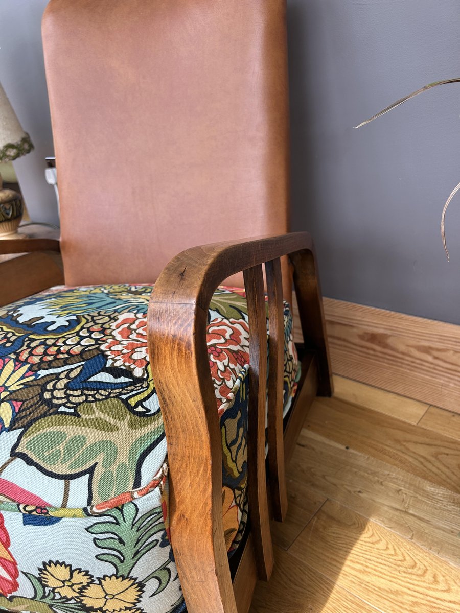 Art Deco Bentwood Armchair with Tan Leather and Chiang Mai Dragon Fabric Upholstery from Schumacher, 1930s