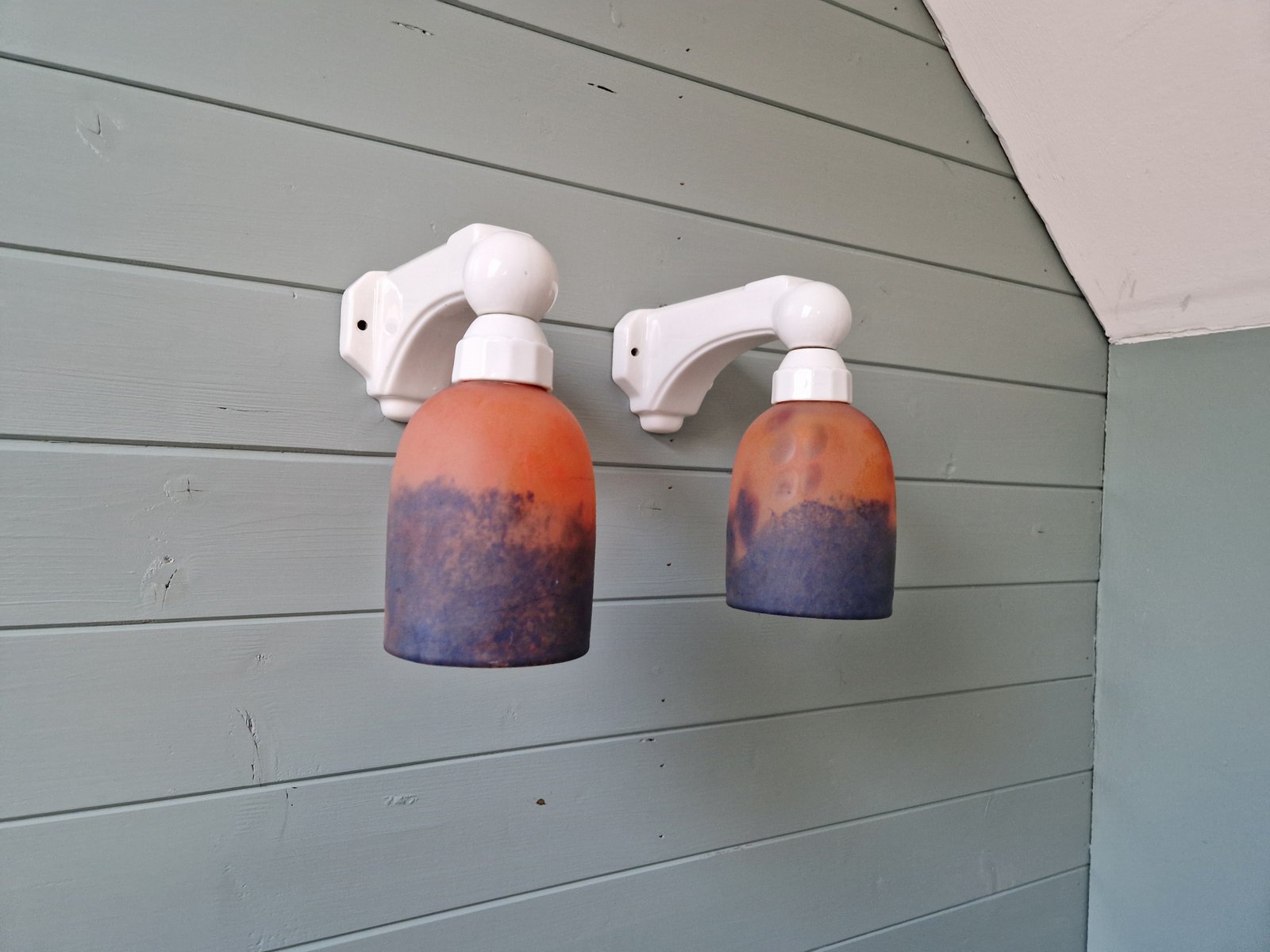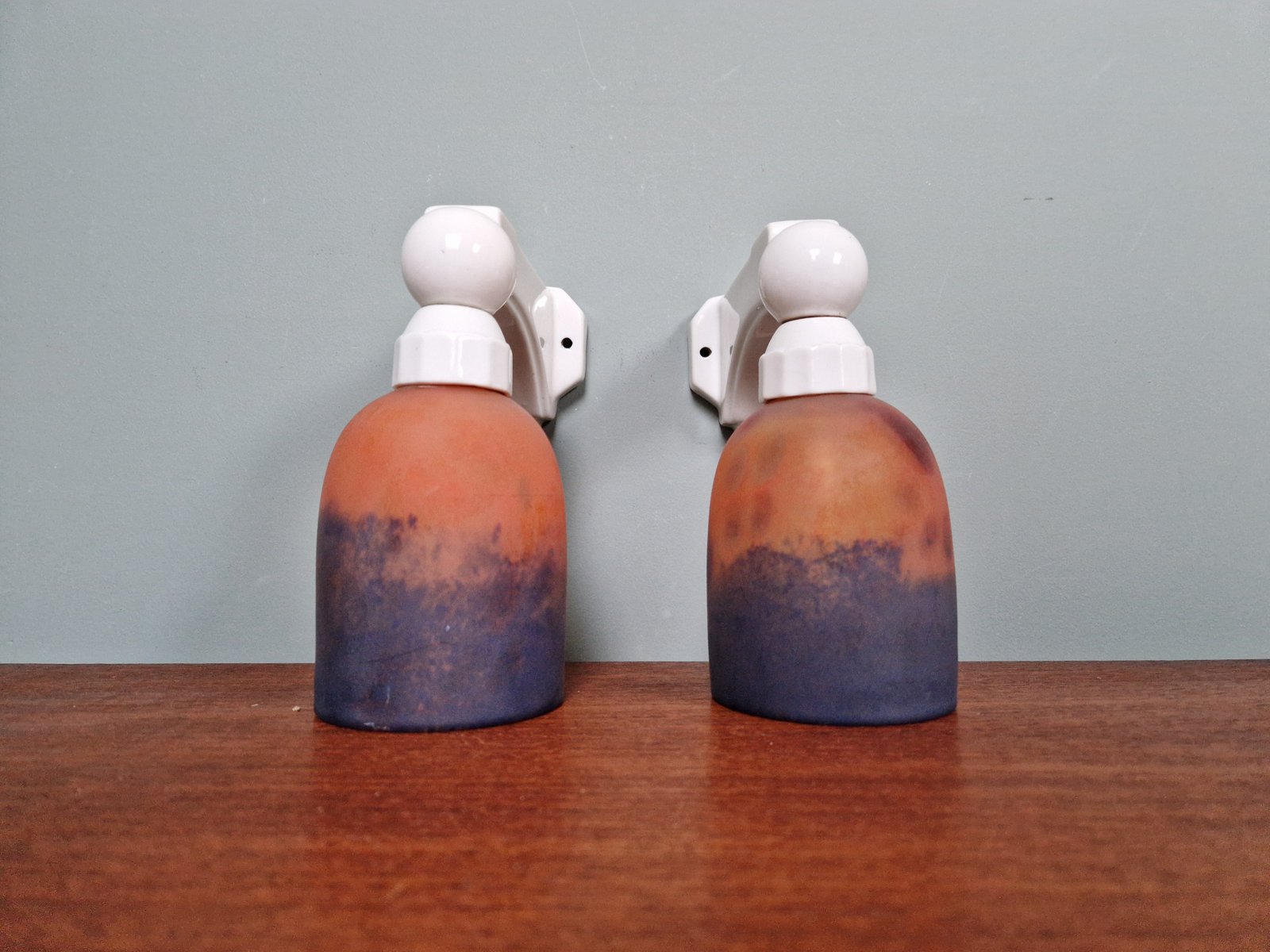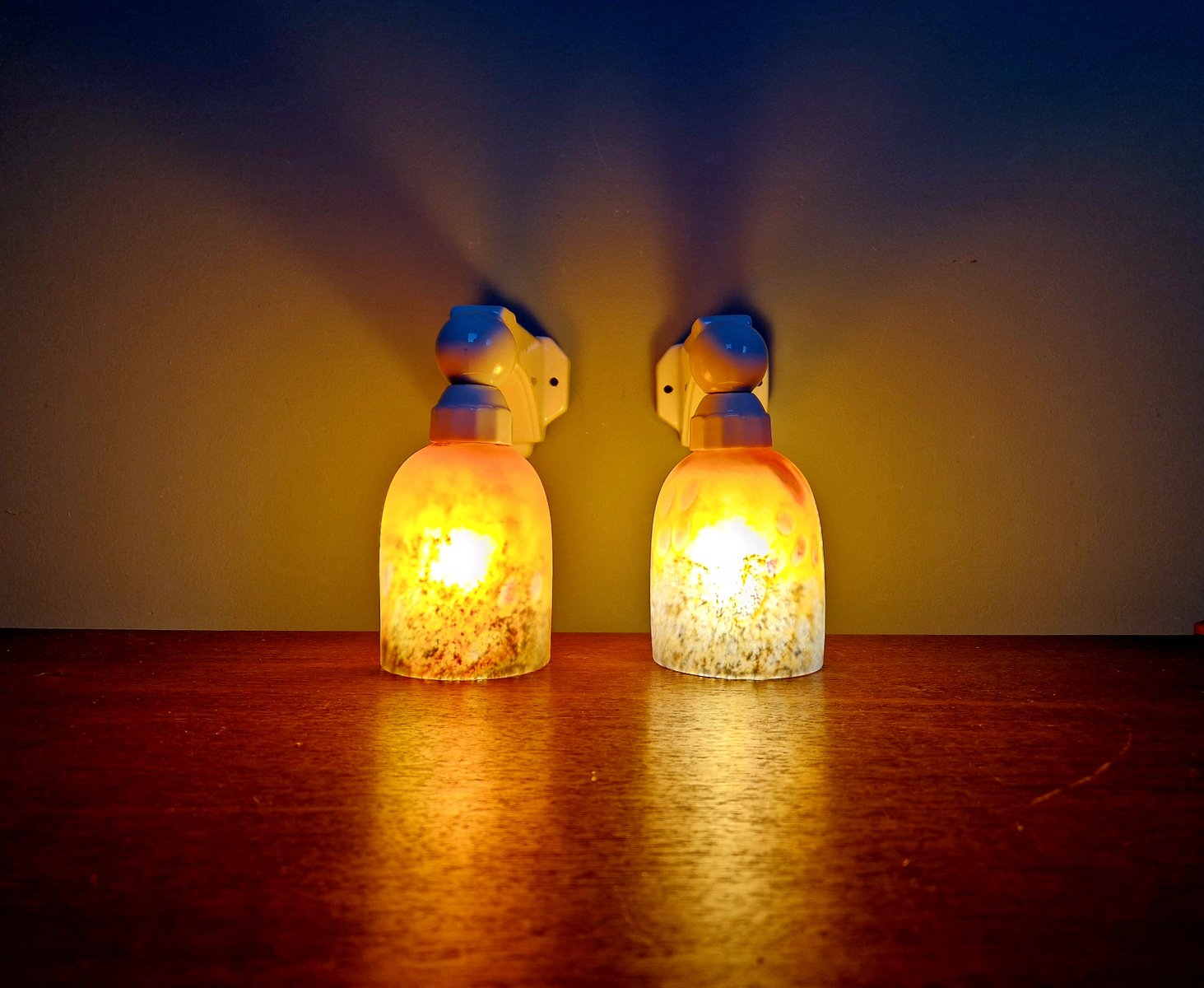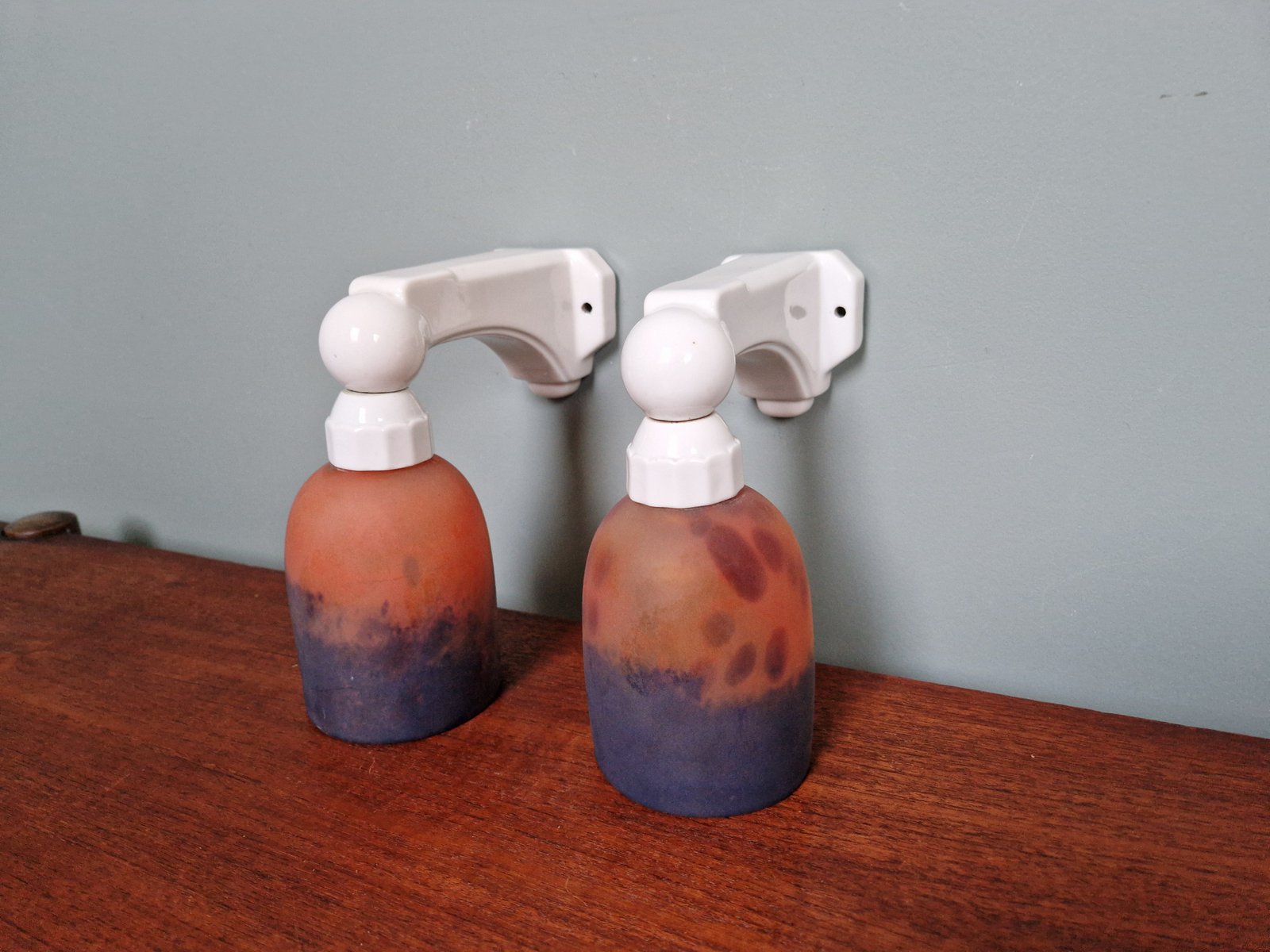 Art Deco Wall Sconces in Porcelain and Multicoloured Satin Glass, 1930s, Set of 2