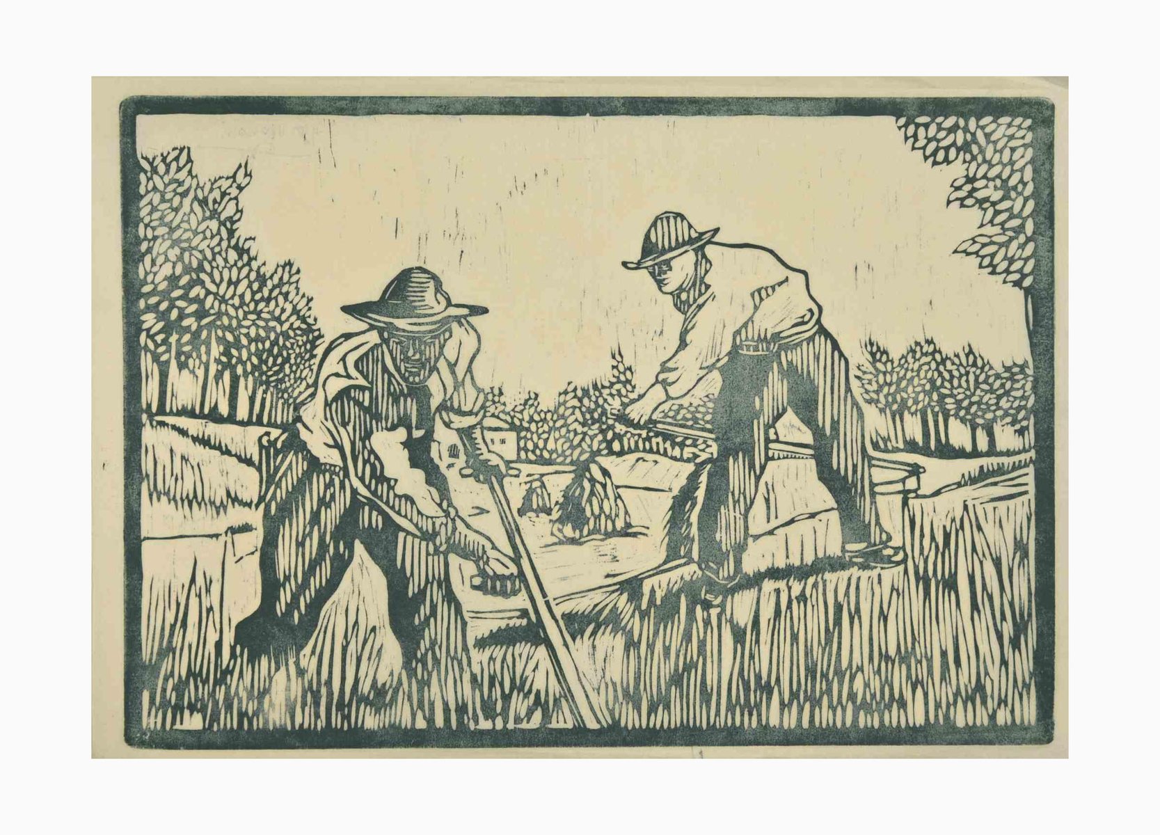 Augusto Monari, Peasants, Woodcut Print, Early 20th Century