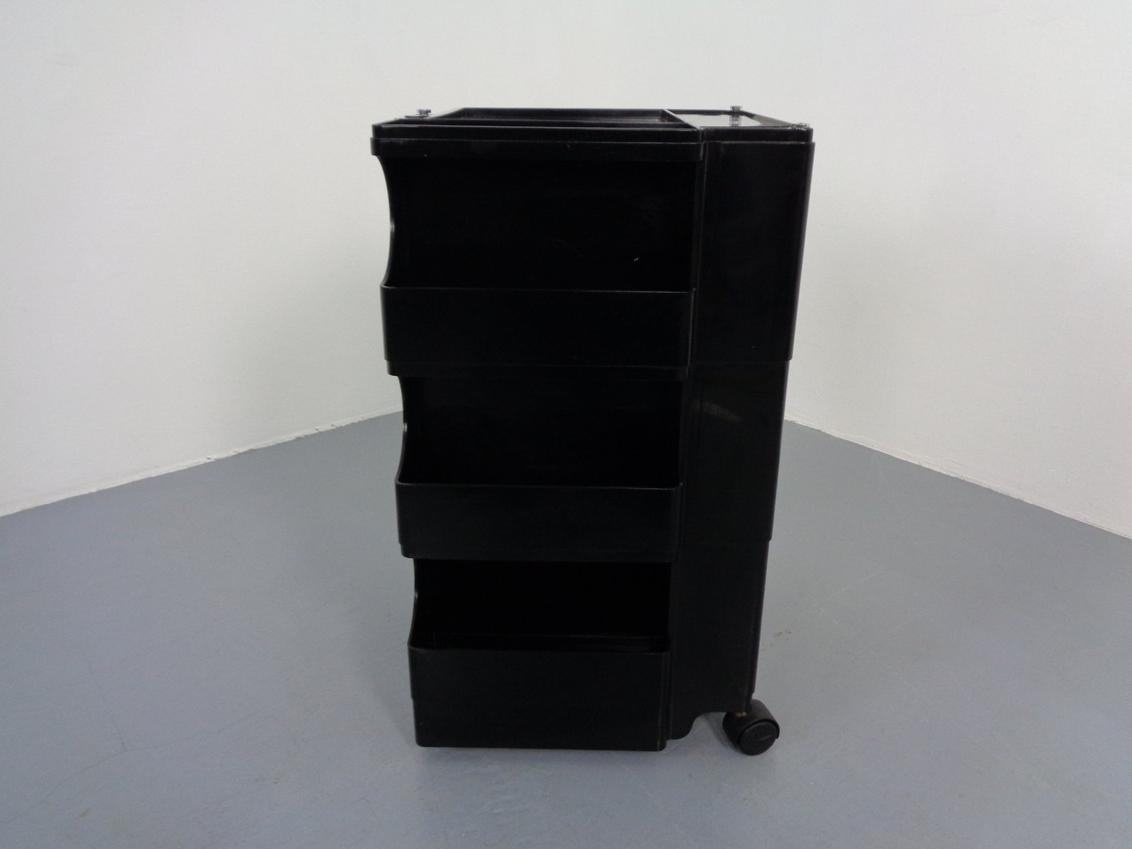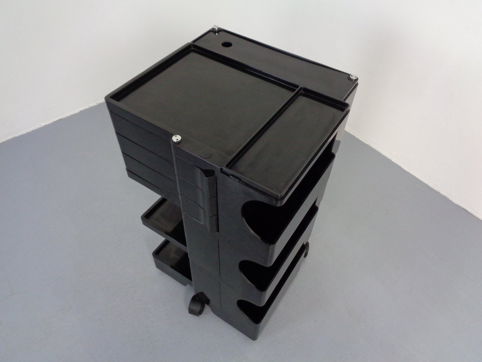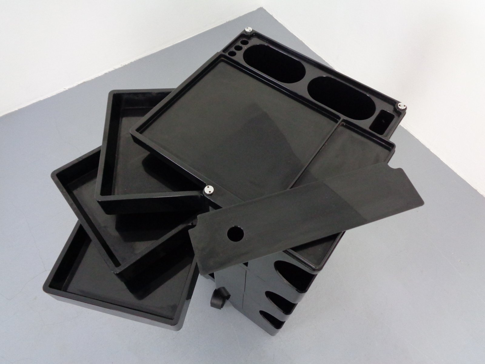 Colombo’s design career was cut tragically short in 1971 when he died of heart failure at age 41. However, he was remarkably prolific during his near decade as a designer. Notable projects include some of the most iconic designs of the 1960s, such as his 1963 Elda Armchair, made completely of fiberglass; the 1964 Ragno outdoor light, which doubled as a seat; the stackable Universale chair (1965/67), which came in varying heights and was created completely from polypropylene; his 1967 modular furniture series known as the Additional Living System, which was composed of different-size curved pieces that could be pinned together in various configurations to form chairs, sofas, or entire living areas, and which ultimately included the famous 1969 Tubo lounge chair; and the Optic alarm clock and Bobby trolley (both 1970).