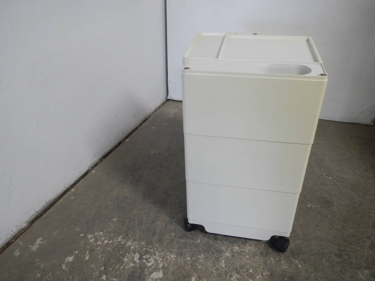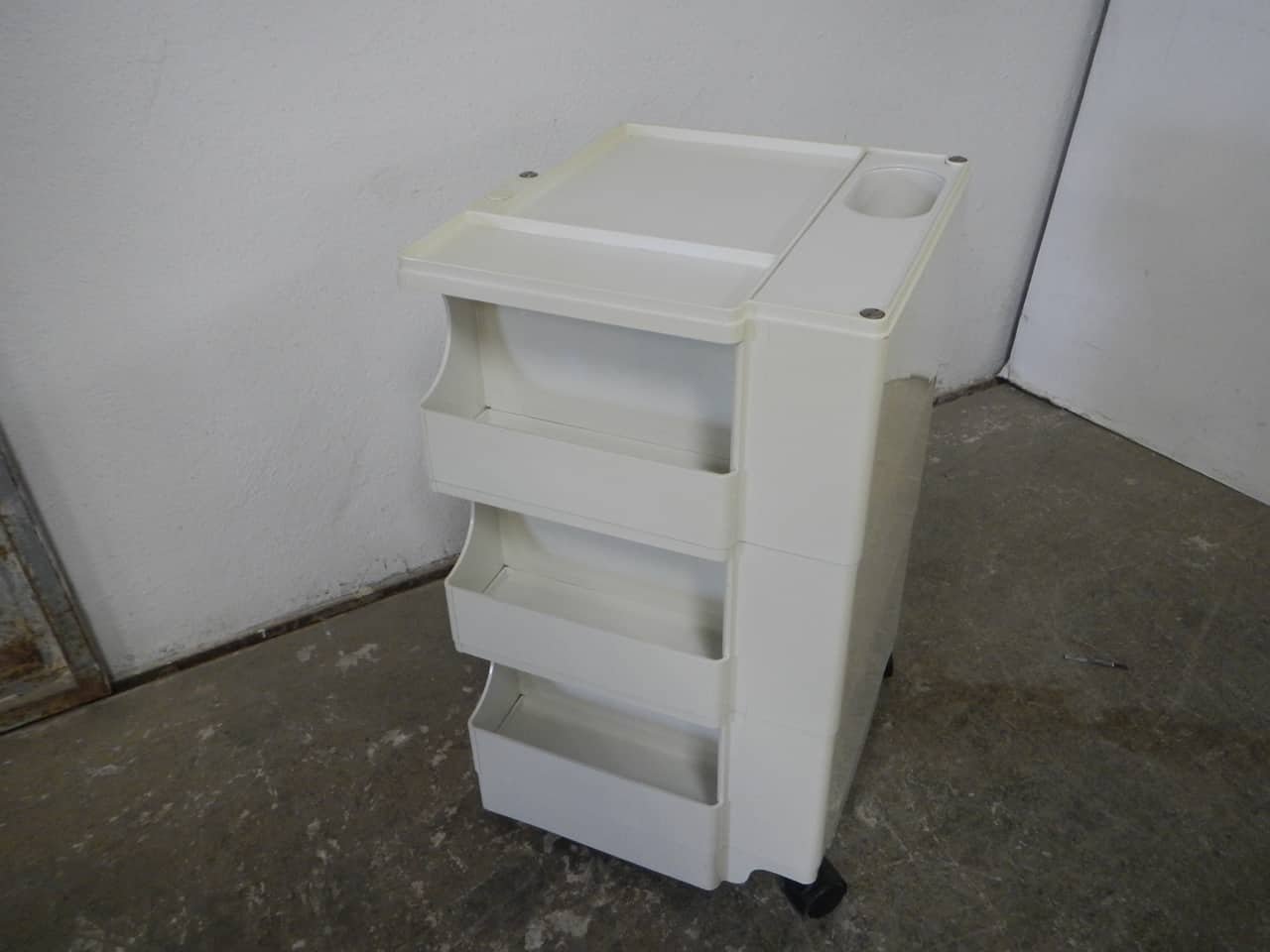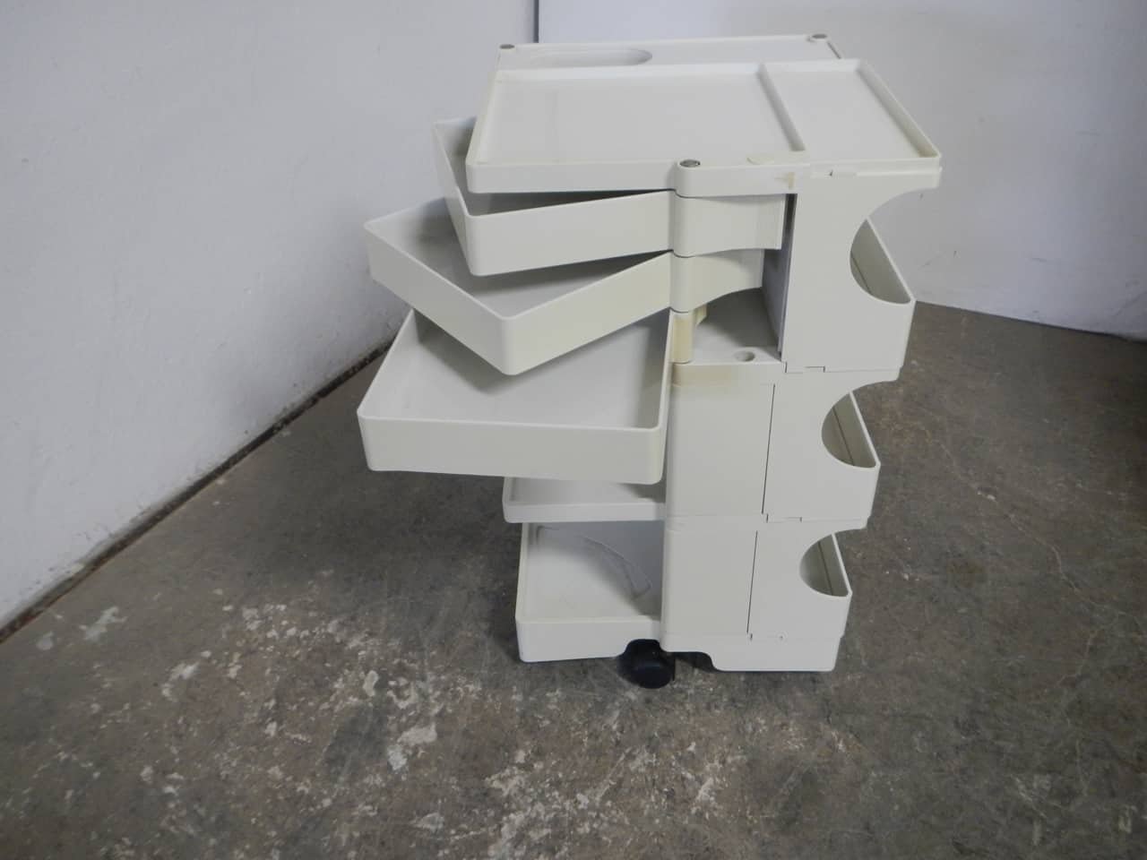Colombo’s design career was cut tragically short in 1971 when he died of heart failure at age 41. However, he was remarkably prolific during his near decade as a designer. Notable projects include some of the most iconic designs of the 1960s, such as his 1963 Elda Armchair, made completely of fiberglass; the 1964 Ragno outdoor light, which doubled as a seat; the stackable Universale chair (1965/67), which came in varying heights and was created completely from polypropylene; his 1967 modular furniture series known as the Additional Living System, which was composed of different-size curved pieces that could be pinned together in various configurations to form chairs, sofas, or entire living areas, and which ultimately included the famous 1969 Tubo lounge chair; and the Optic alarm clock and Bobby trolley (both 1970).