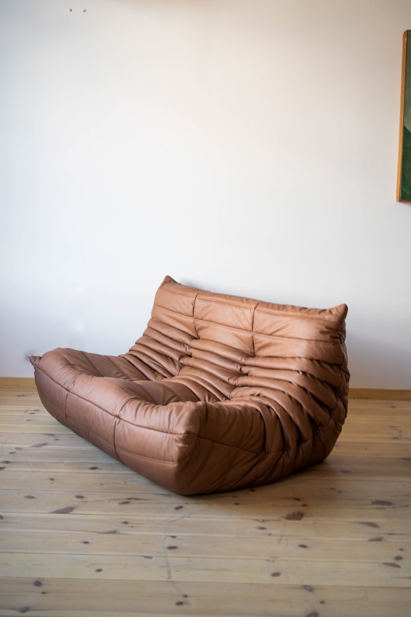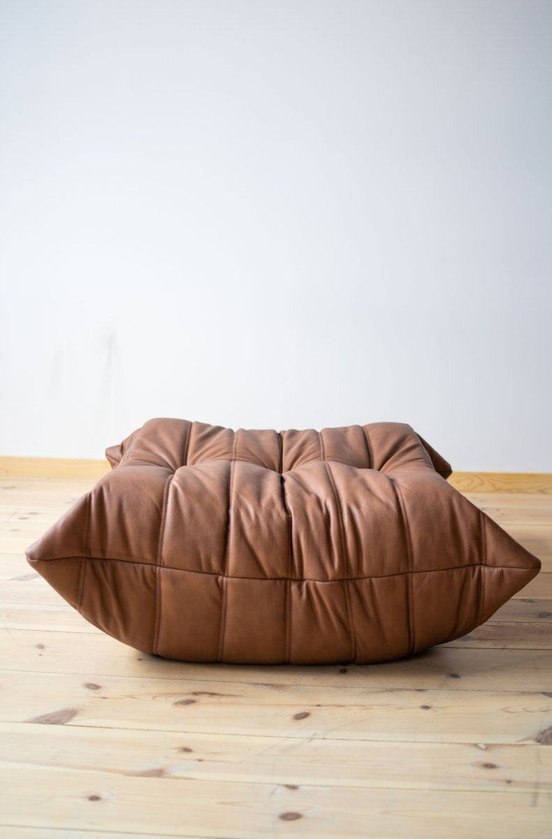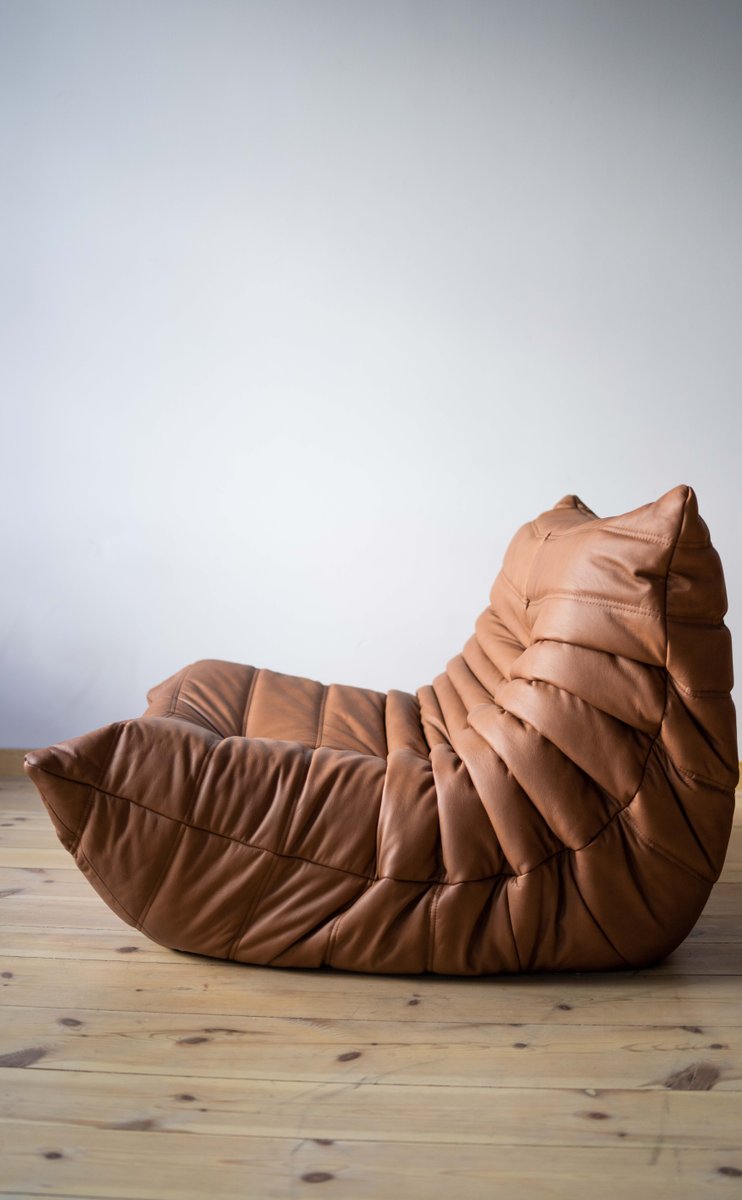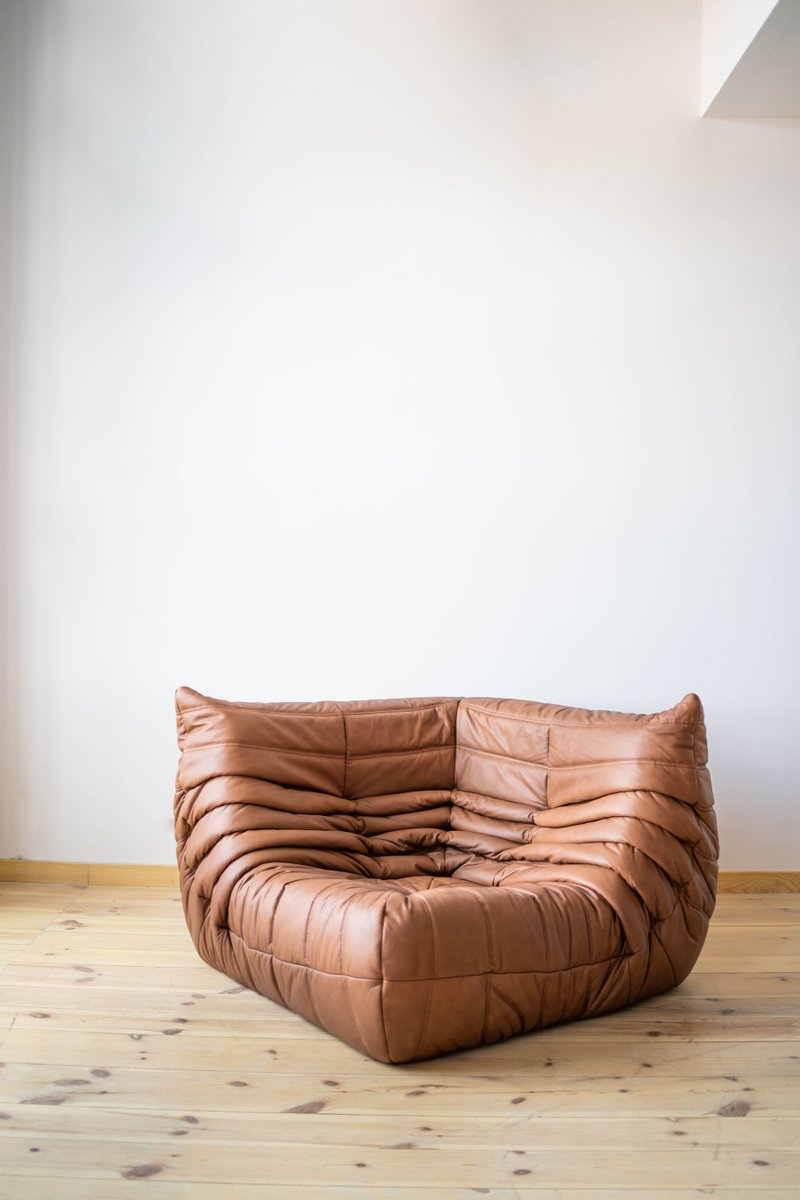 Camel Brown Leather Togo Lounge Chair, Corner and 2-Seat Sofa by Michel Ducaroy for Ligne Roset, Set of 3