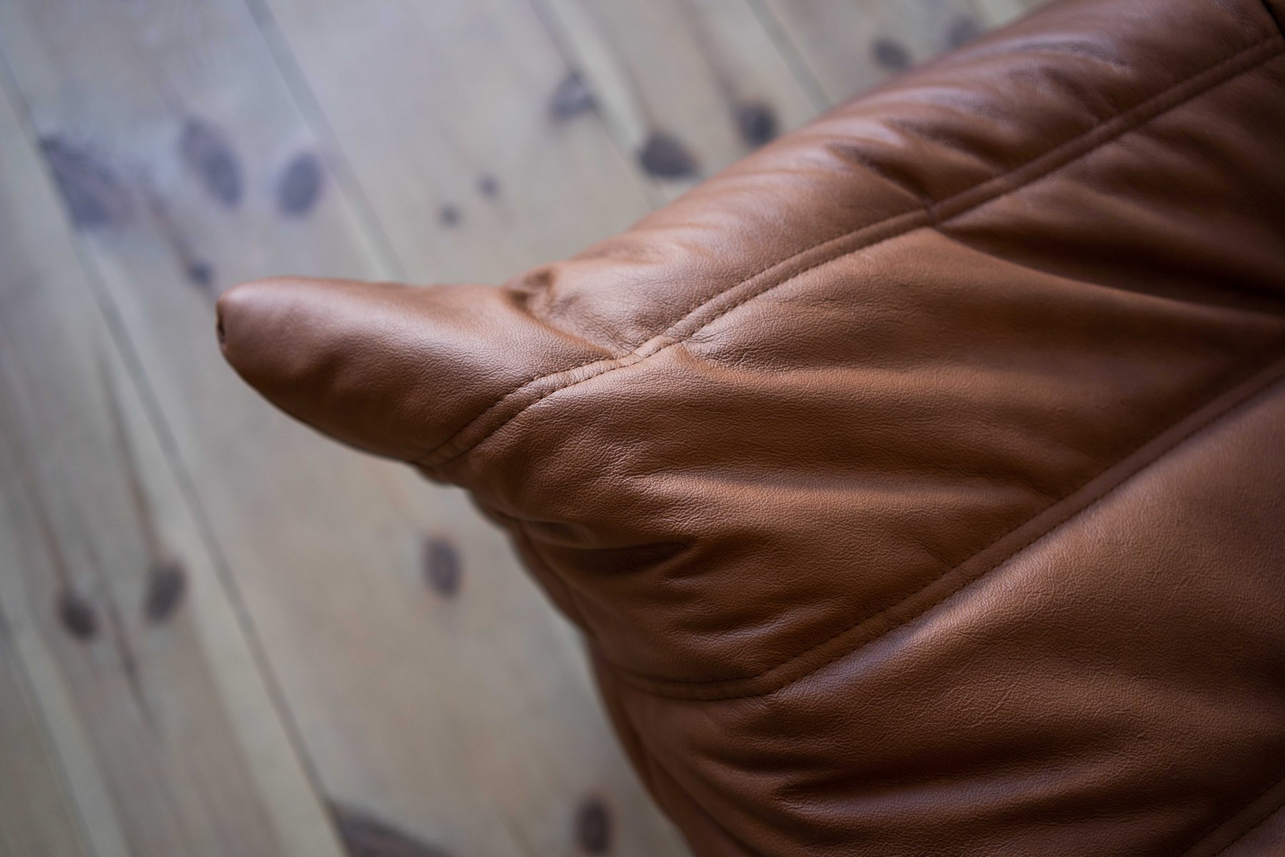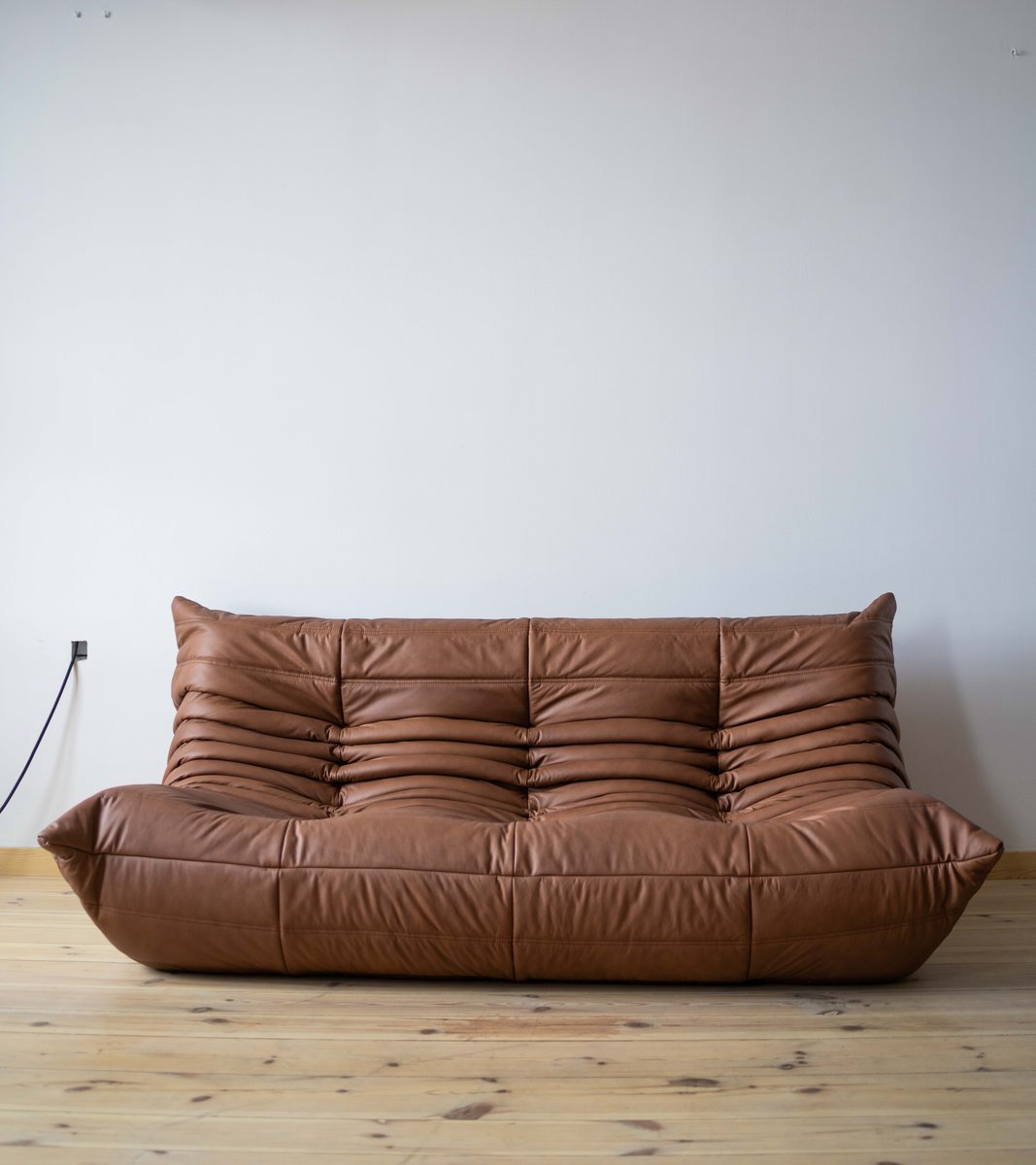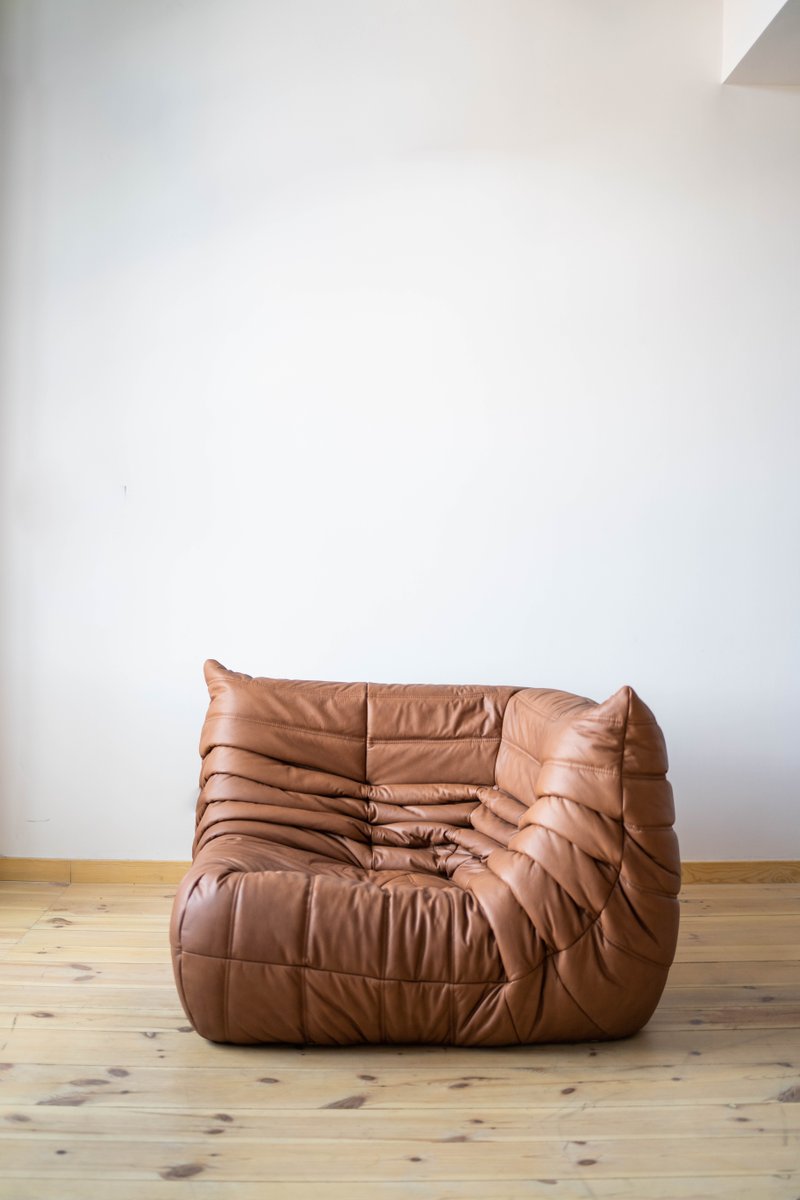 Camel Brown Leather Togo Lounge Chair, Corner and 2-Seat Sofa by Michel Ducaroy for Ligne Roset, Set of 3