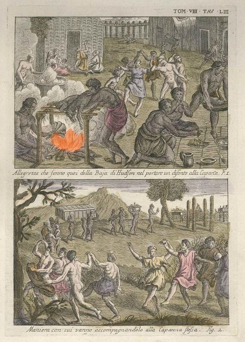 Joy in the Hudson Bay as they take a Difonto into a hut – Manner of accompanying him to the hut. Etchings, Hand-Watercoloured. Vol. VIII, Plate LIII Image Dim: cm 25.5 x 18; Sheet Dim: cm 37.5 x 23.8; Passepartout Dim: cm 49 x 34 Two wonderful etchings on the same matrix, hand-watercoloured, representing a typical rite of Hudson Bay. From “New Scientific and Curious Dictionnary concerning the Sacred and the Profane, by Gianfrancesco Pivati, Venice, Benedetto Milocco, 1746-1751. From the Volume VIII, a collection of 31 plates illustrating “Uses and Costumes, Religious Rites of American people”. In Perfect condition, including passepartout. Pivati Gianfrancesco Pivati's Nuovo dizionario is a bold contribution to Italian cultural debate in the middle of XVIII century. The wide, useful and interesting knowledge it contains is often taken from Hebrew, Greek, Latin, French, Spanish and English, as well as Italian. “The subjects treated are well researched and generally presented in a simple, direct style (…)”. Pivati’s liberal voice was out of the chorus in the context of the rigid conformity predominated troughout the Italian peninsula. “He appears to be committed to Reason and Science as opposed to simple Faith, but he tries to avoid any direct challenge to the dogmatic teachings of the Church”. Ref: Silvano Garafalo, in: Frank Kafker, Notable Encyclopedias, Oxford 1981. Italian Version: Allegrezze che fanno quei della Baja di Hudson nel portare un difonto alla capana - Maniera con cui vanno accompagnandolo alla Capanna stessa Acquaforte acquerellata a mano. Tom. VIII- Tav. LIII. Imag. Dim: cm 25.5 x 18; Foglio Dim: cm 37.5 x 23.8; Passepartout Dim: cm 49 x 34 Due meravigliose acqueforti su stessa matrice, acquerellate a mano, mostrano un rituale tipico degli indigeni della baya di Hudson. Dal Nuovo Dizionario Scientifico e Curioso Sacro e Profano di Gianfrancesco Pivati, Tomo VIII, Usi e Costumi, Riti religiosi popoli dell’America, Venezia, Benedetto Milocco Ed., 1746-1751. In Perfetto stato, incluso passepartout. This artwork is shipped from Italy. Under existing legislation, any artwork in Italy created over 70 years ago by an artist who has died requires a licence for export regardless of the work’s market price. The shipping may require additional handling days to require the licence according to the final destination of the artwork.
