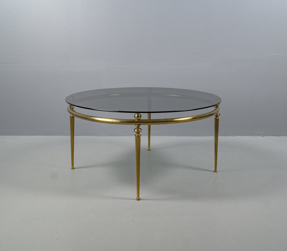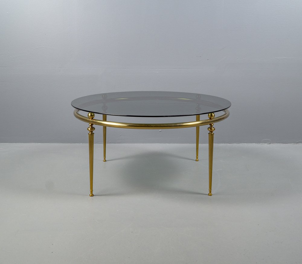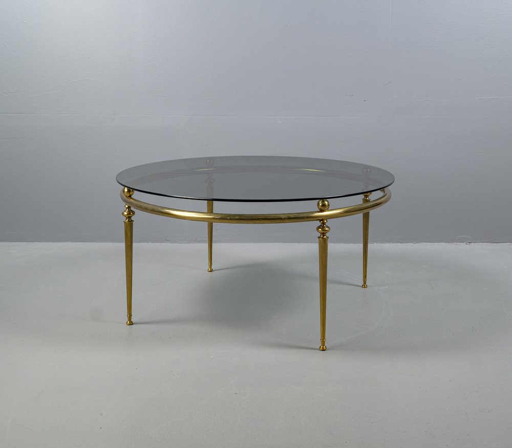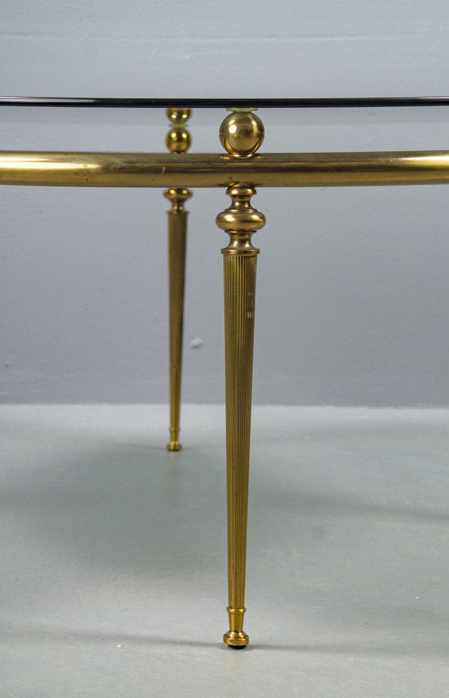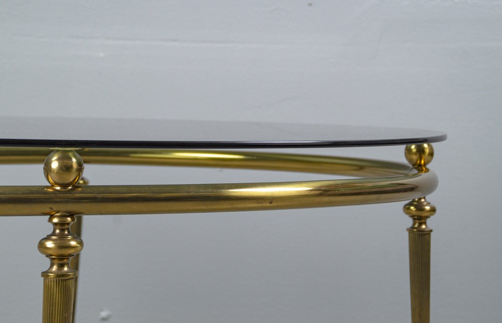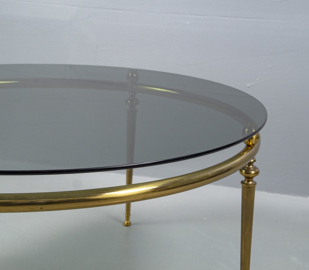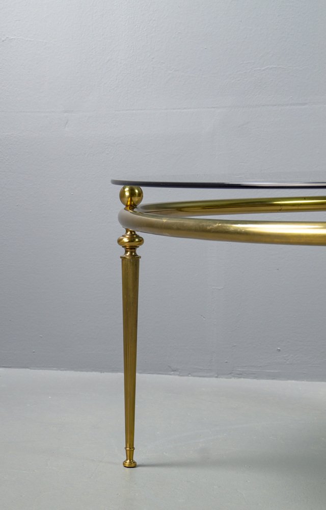 Classicist Coffee Table in Brass with Concave Fluted Legs and Smoked Glass Pane