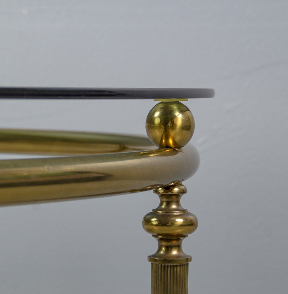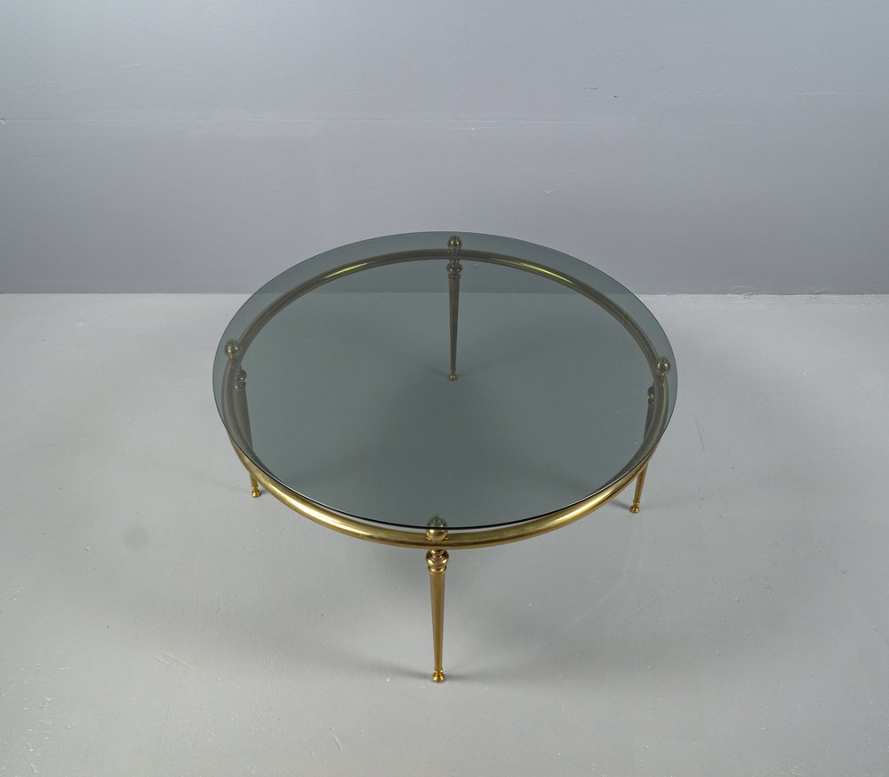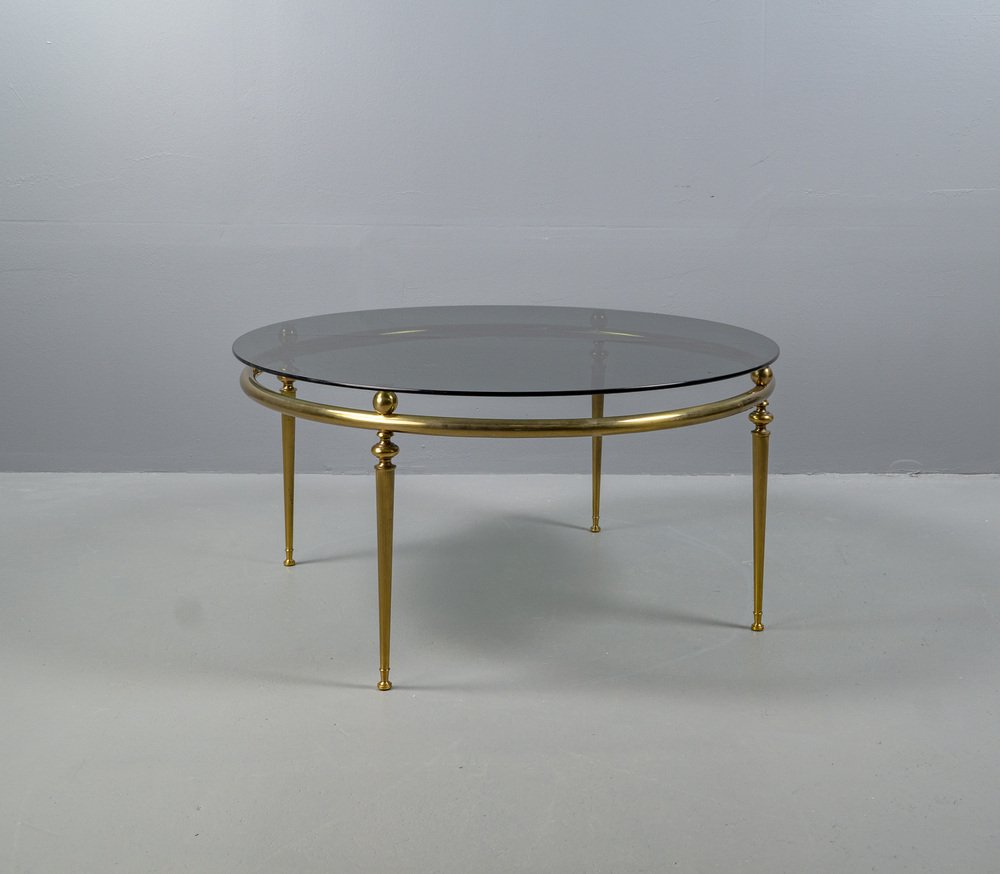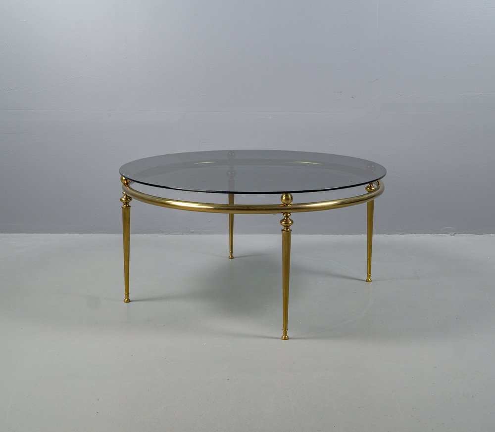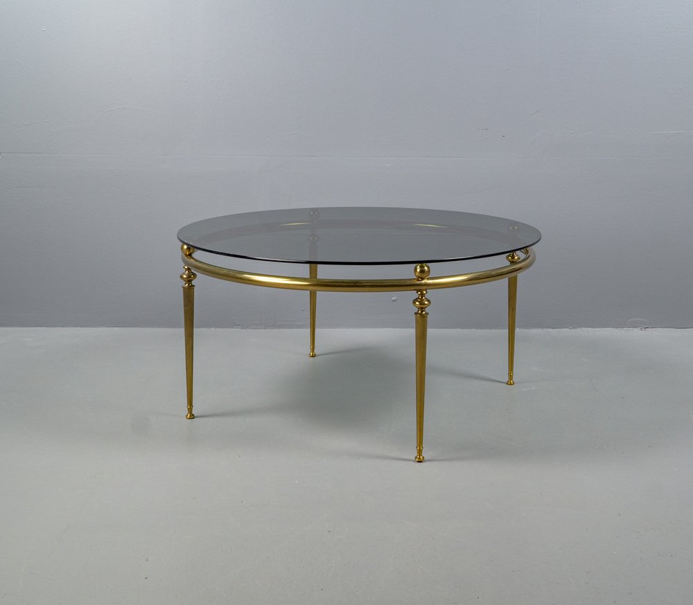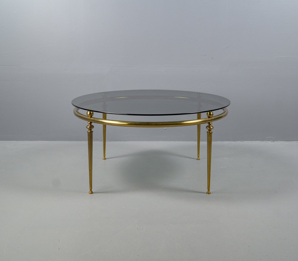 Classicist Coffee Table in Brass with Concave Fluted Legs and Smoked Glass Pane