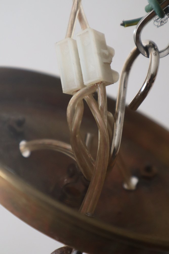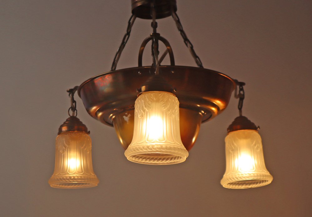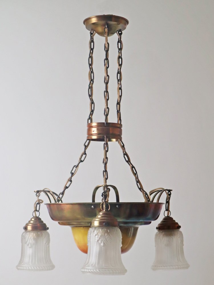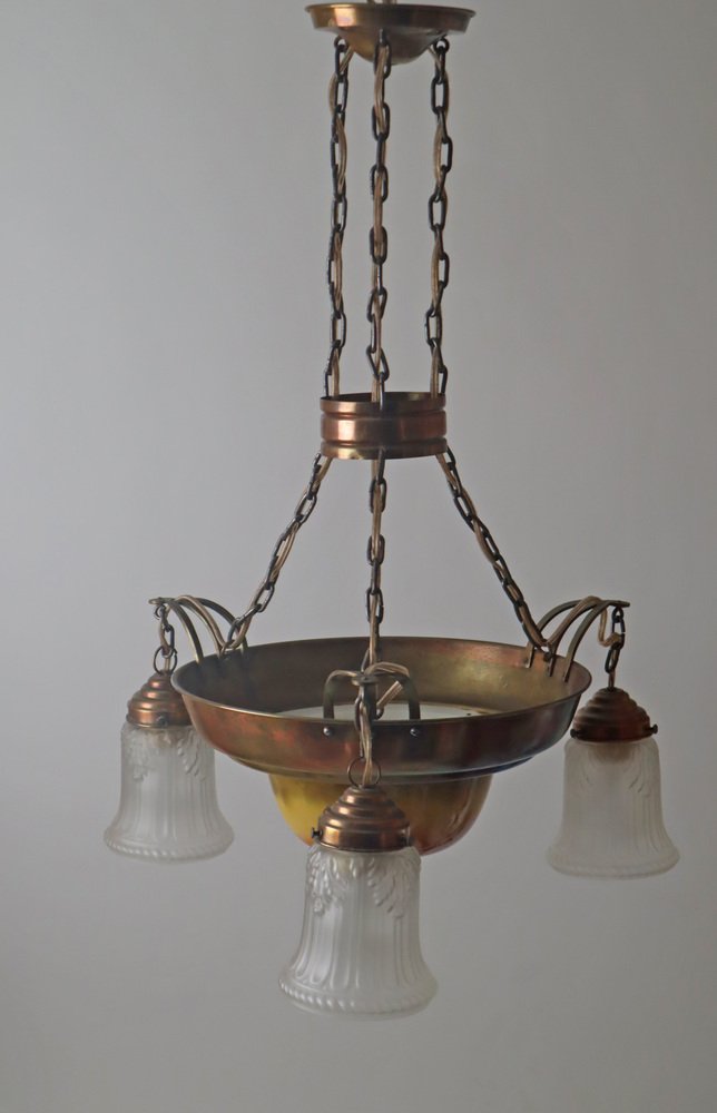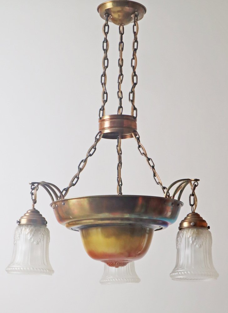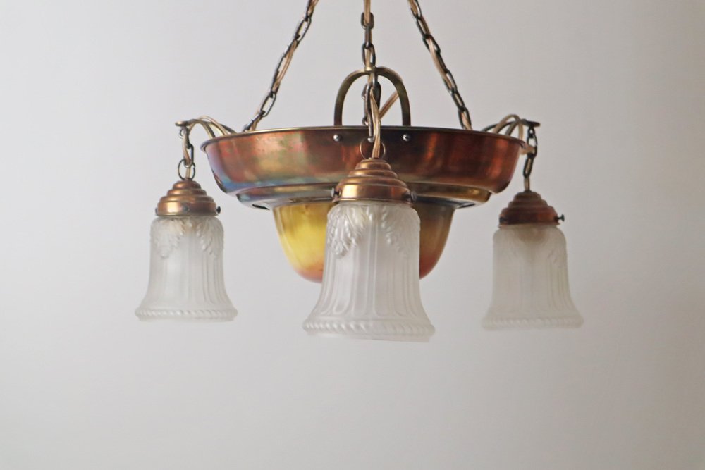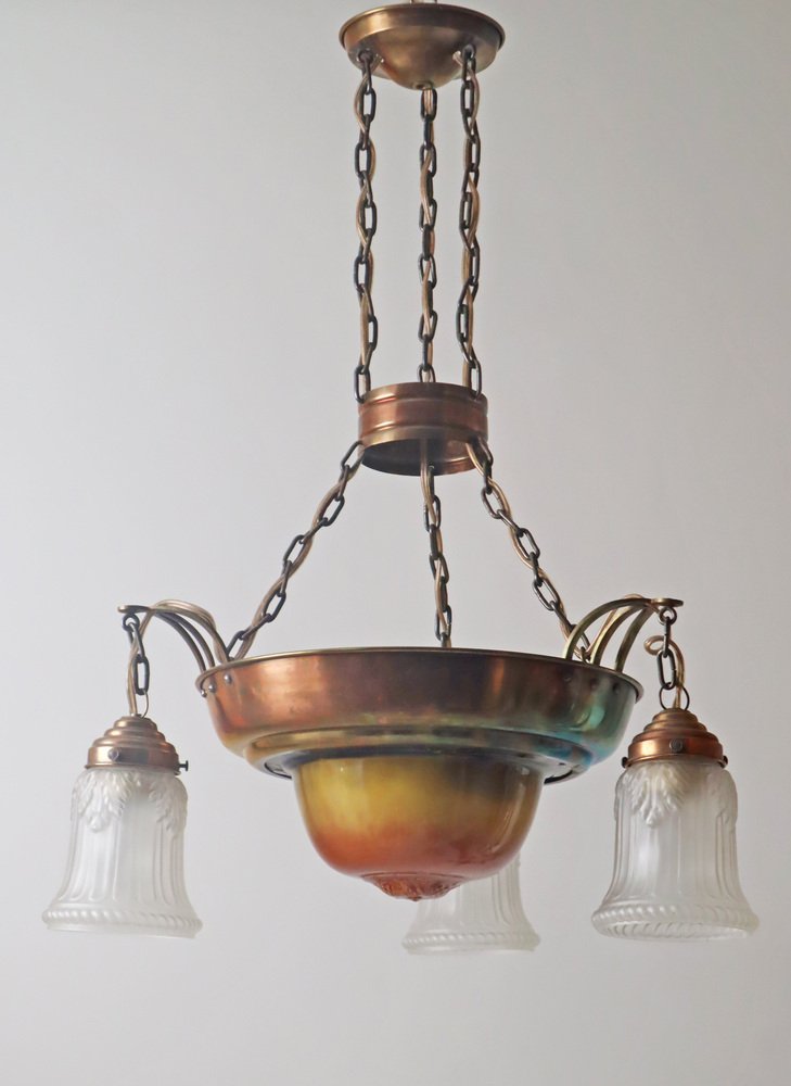 Danish Art Nouveau Chandelier in Brass, Copper and Ceramic, 1910s
