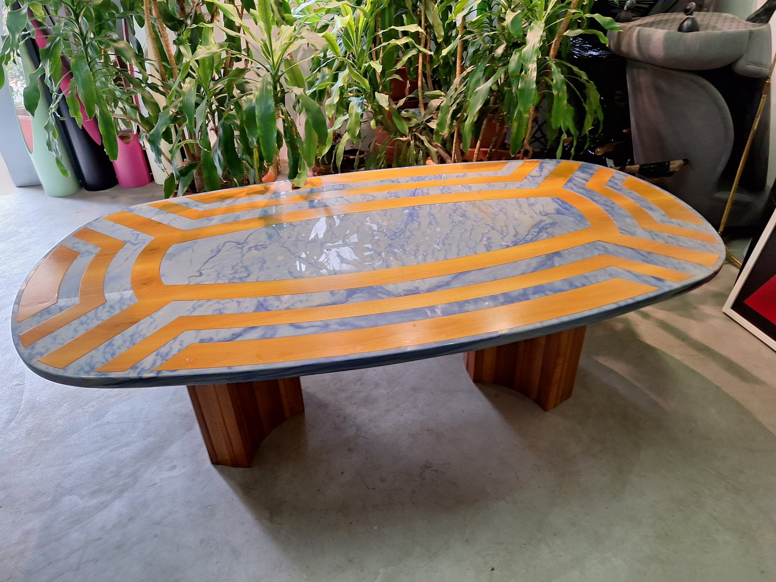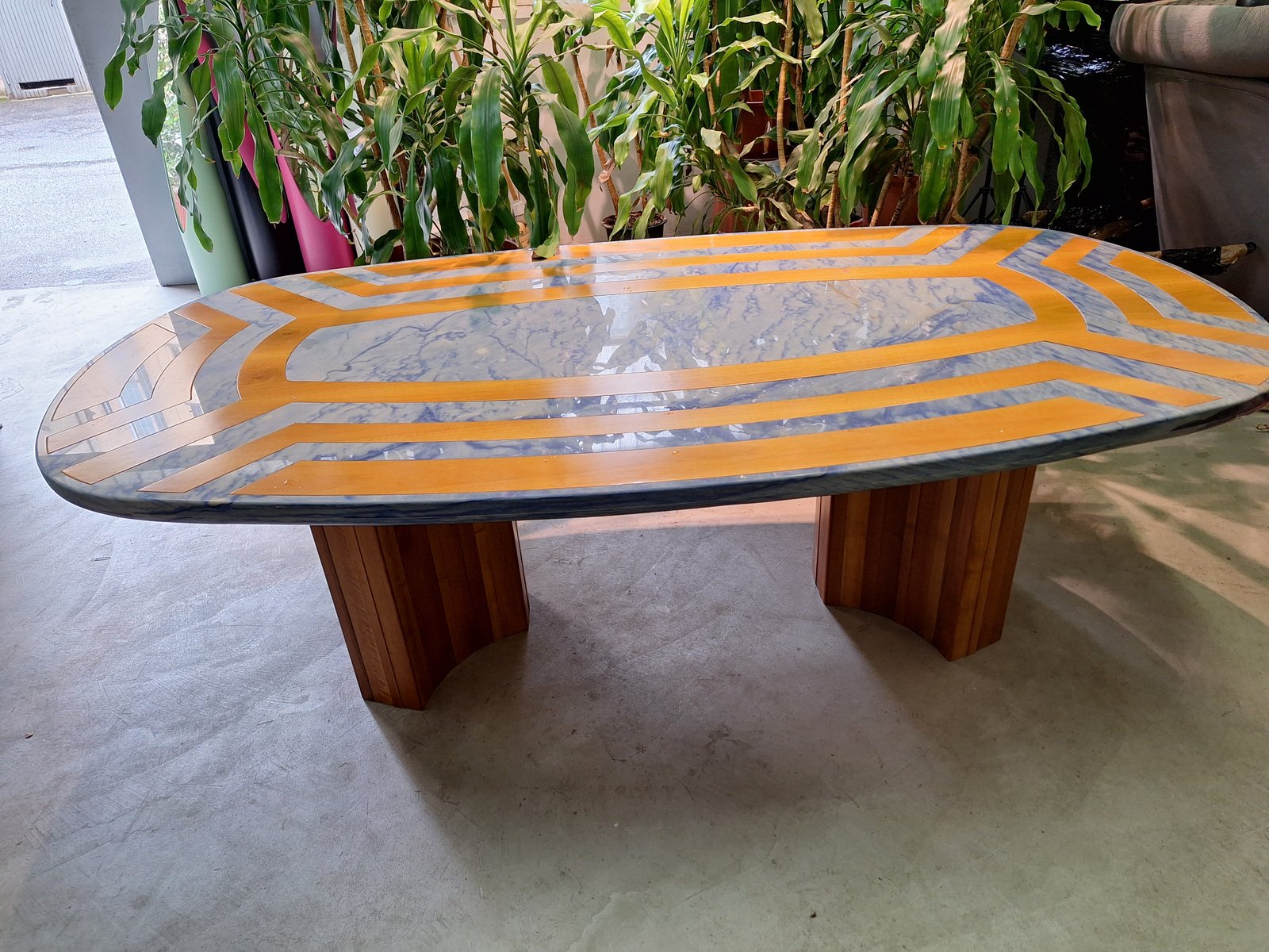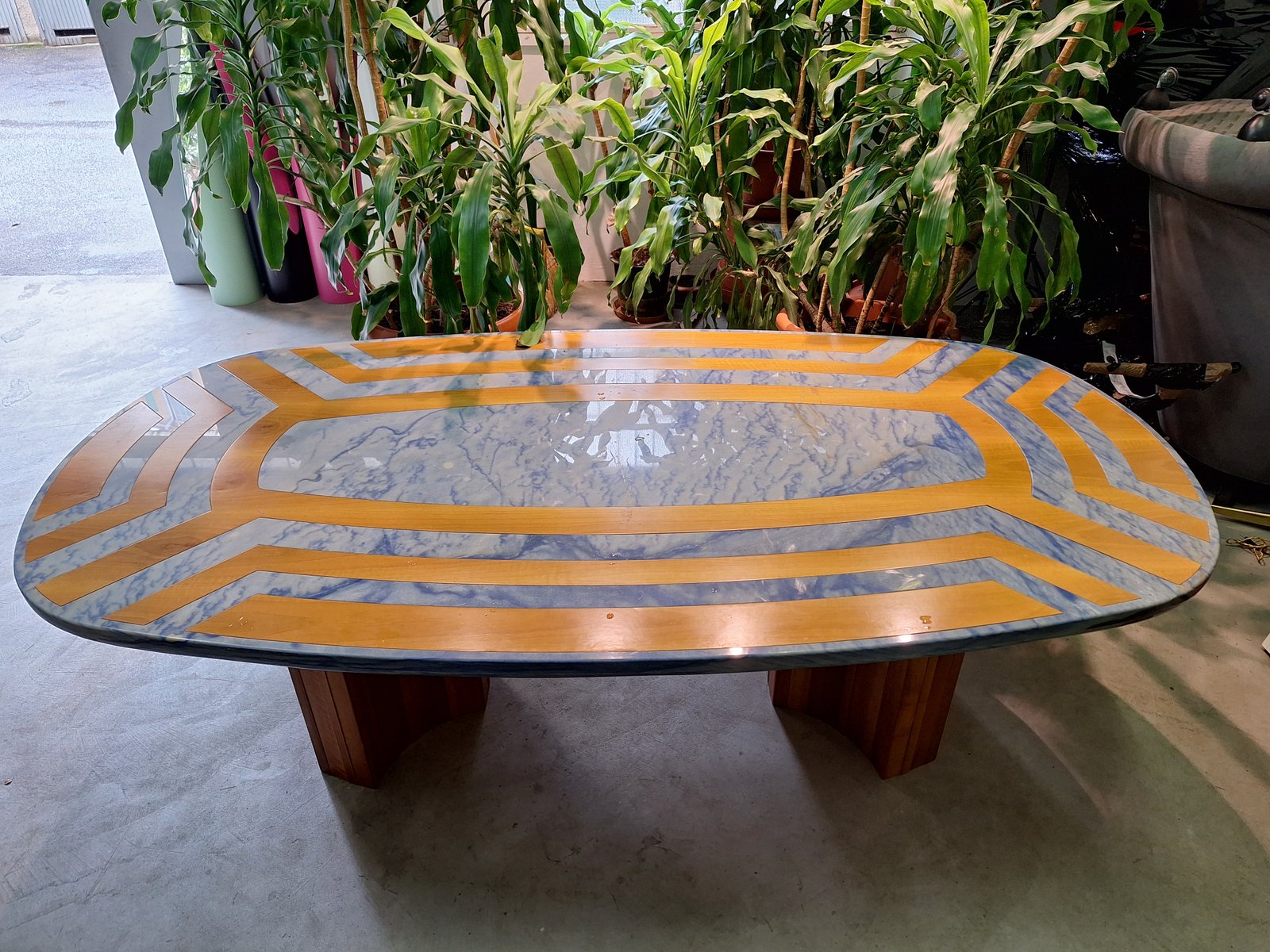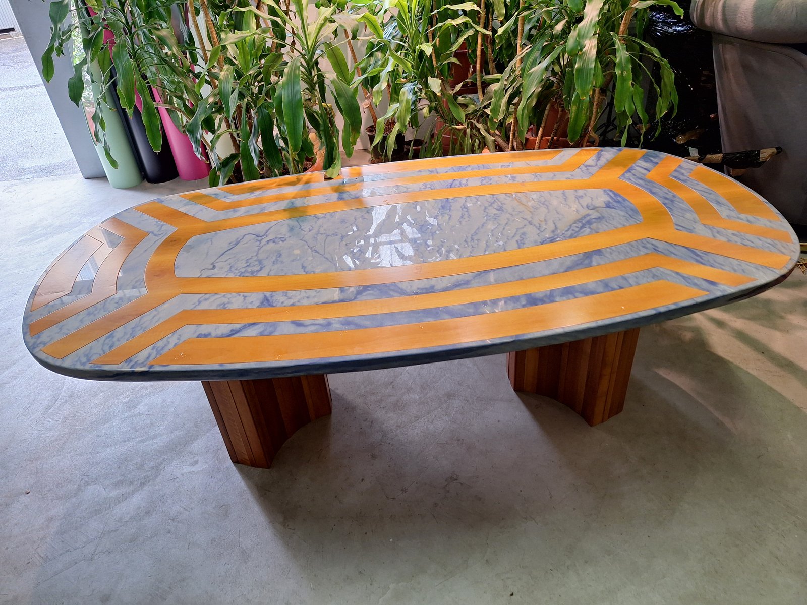 Dining Table in Azul Macaubas Blue Marble with Wooden Inlays and Wooden Base, 1980s