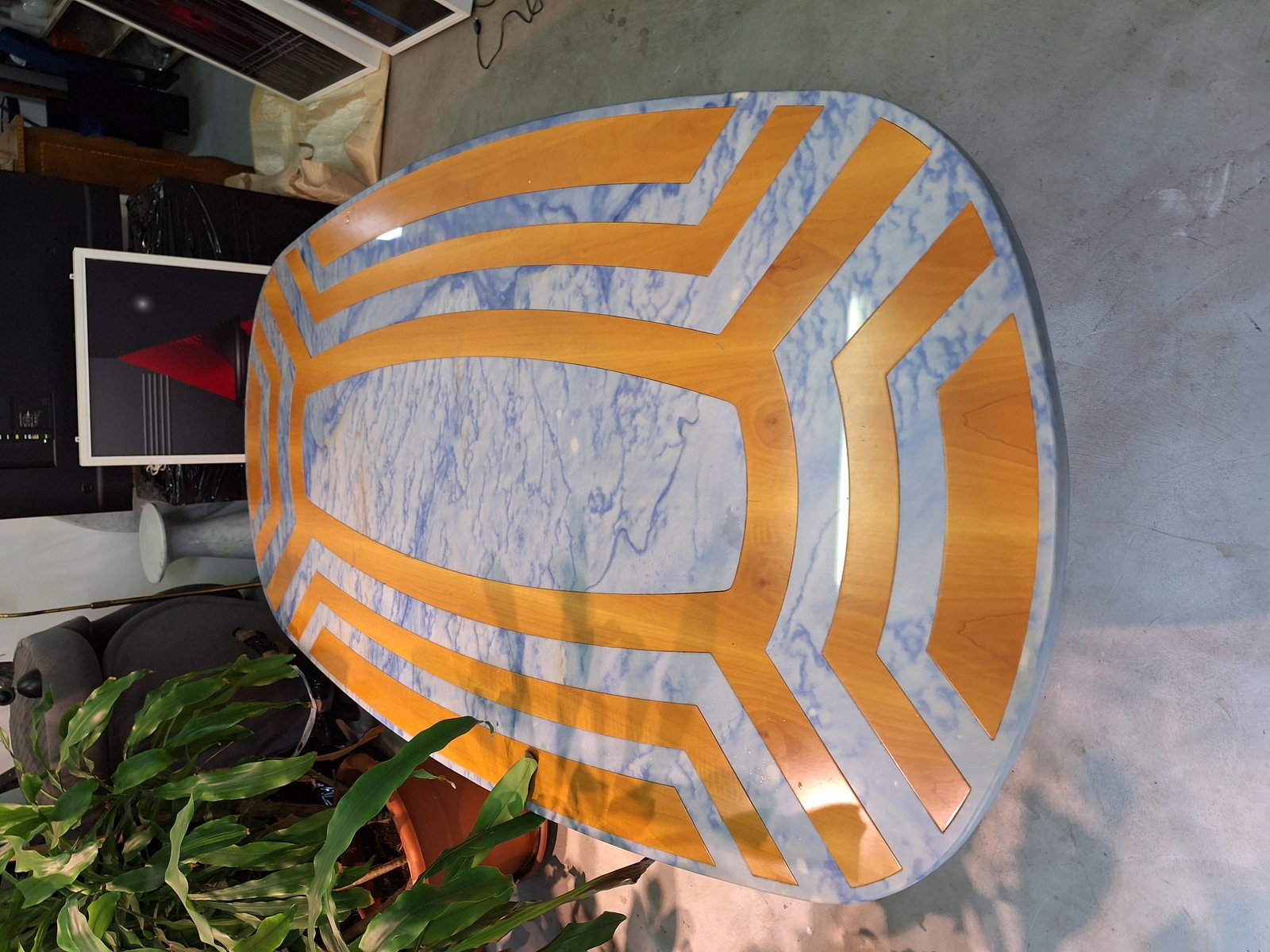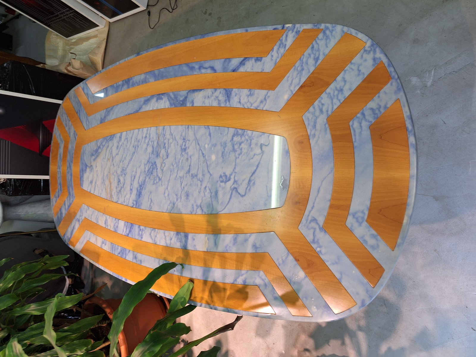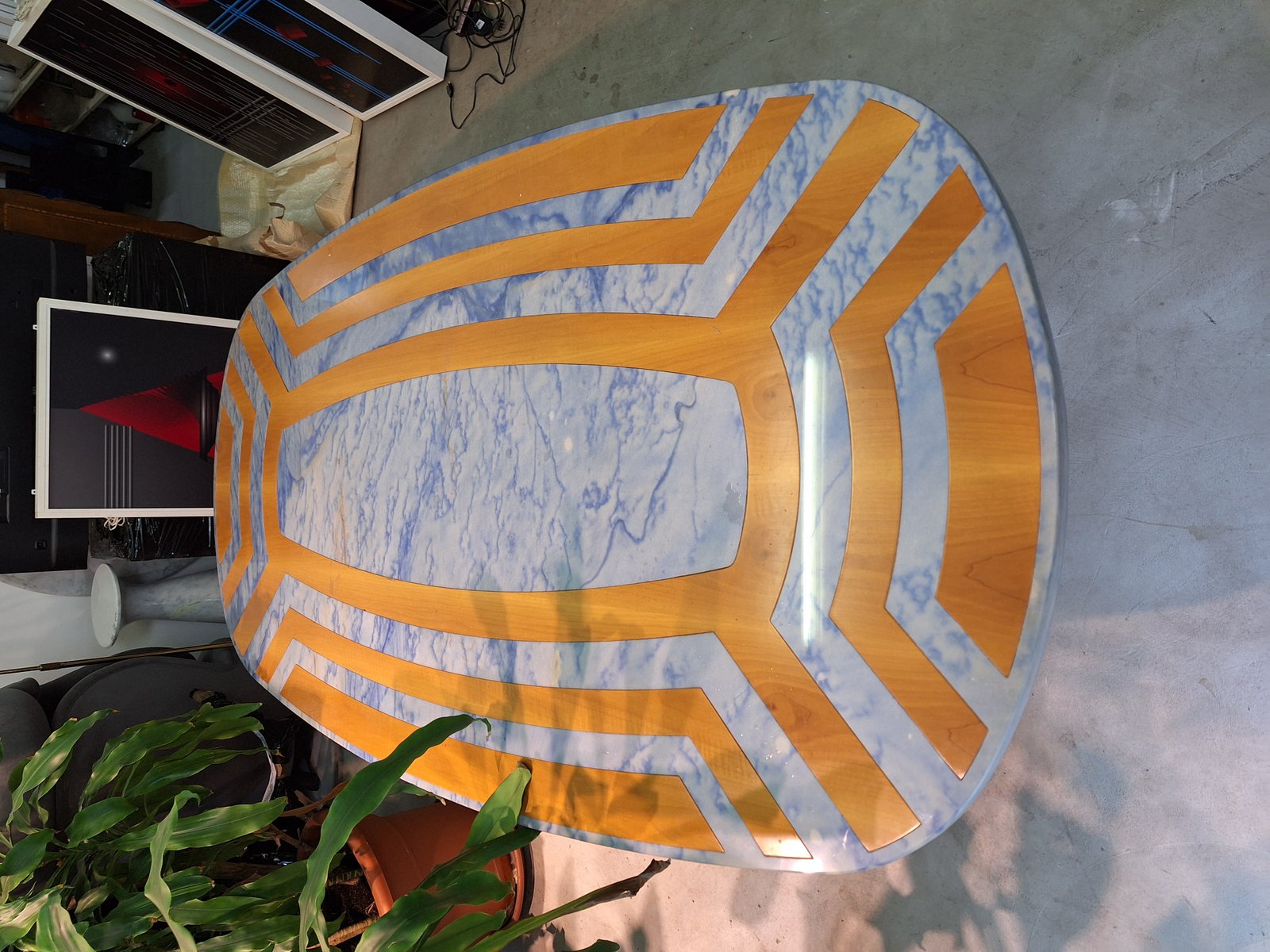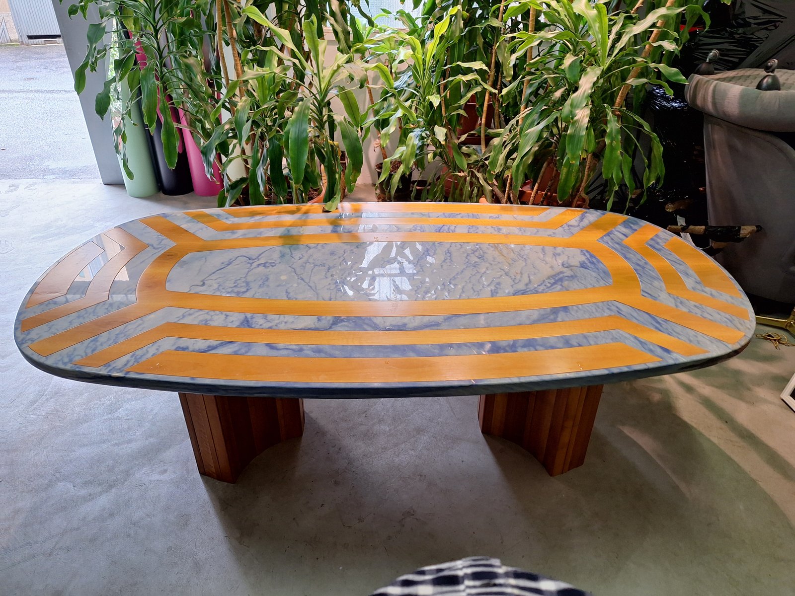 Dining Table in Azul Macaubas Blue Marble with Wooden Inlays and Wooden Base, 1980s