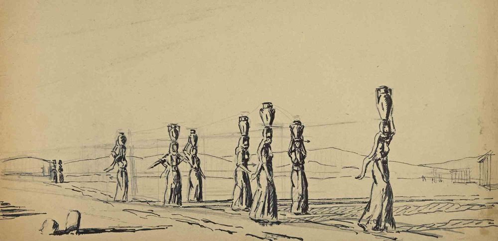 Edouard Dufeu, Water Bearers in the Desert, Pencil & Ink, Early 20th Century