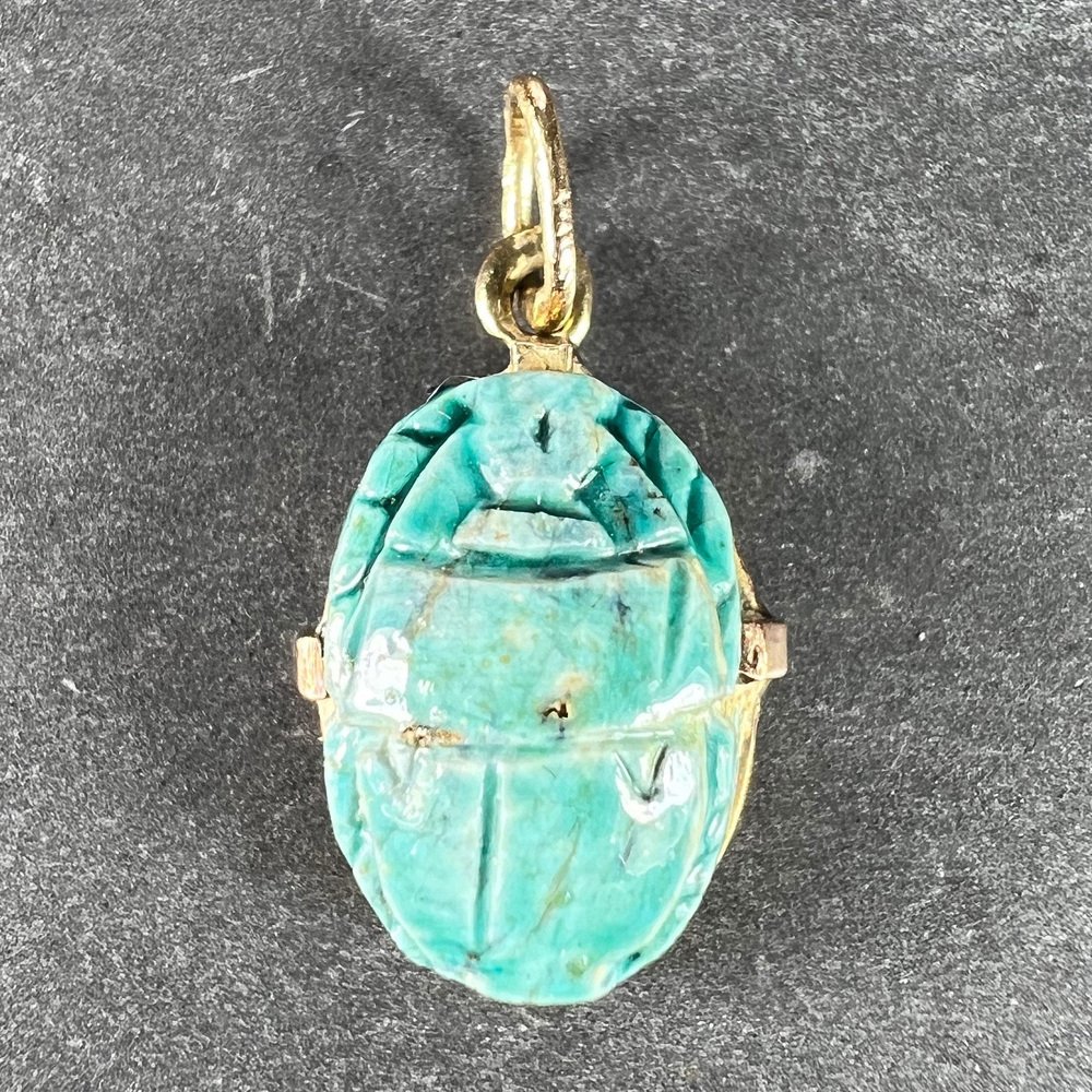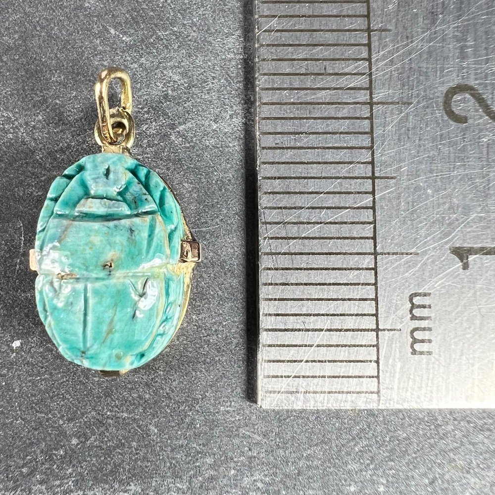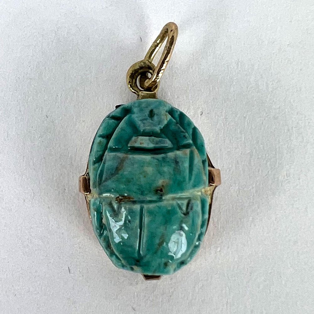Egyptian Faience Ceramic Scarab 18k Yellow Gold Charm Pendant, 1920s
