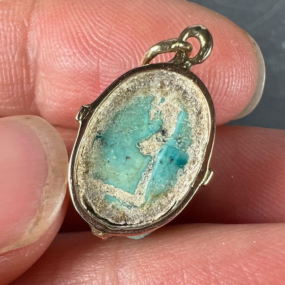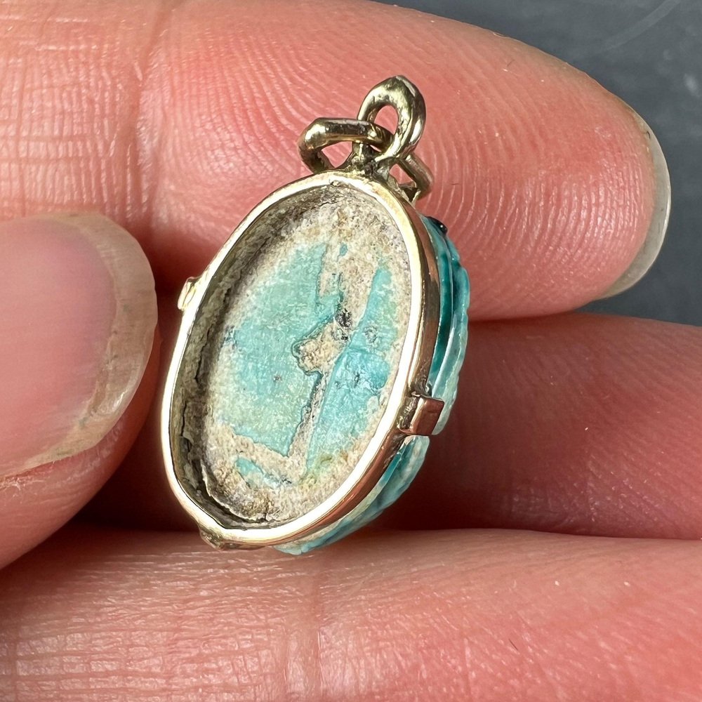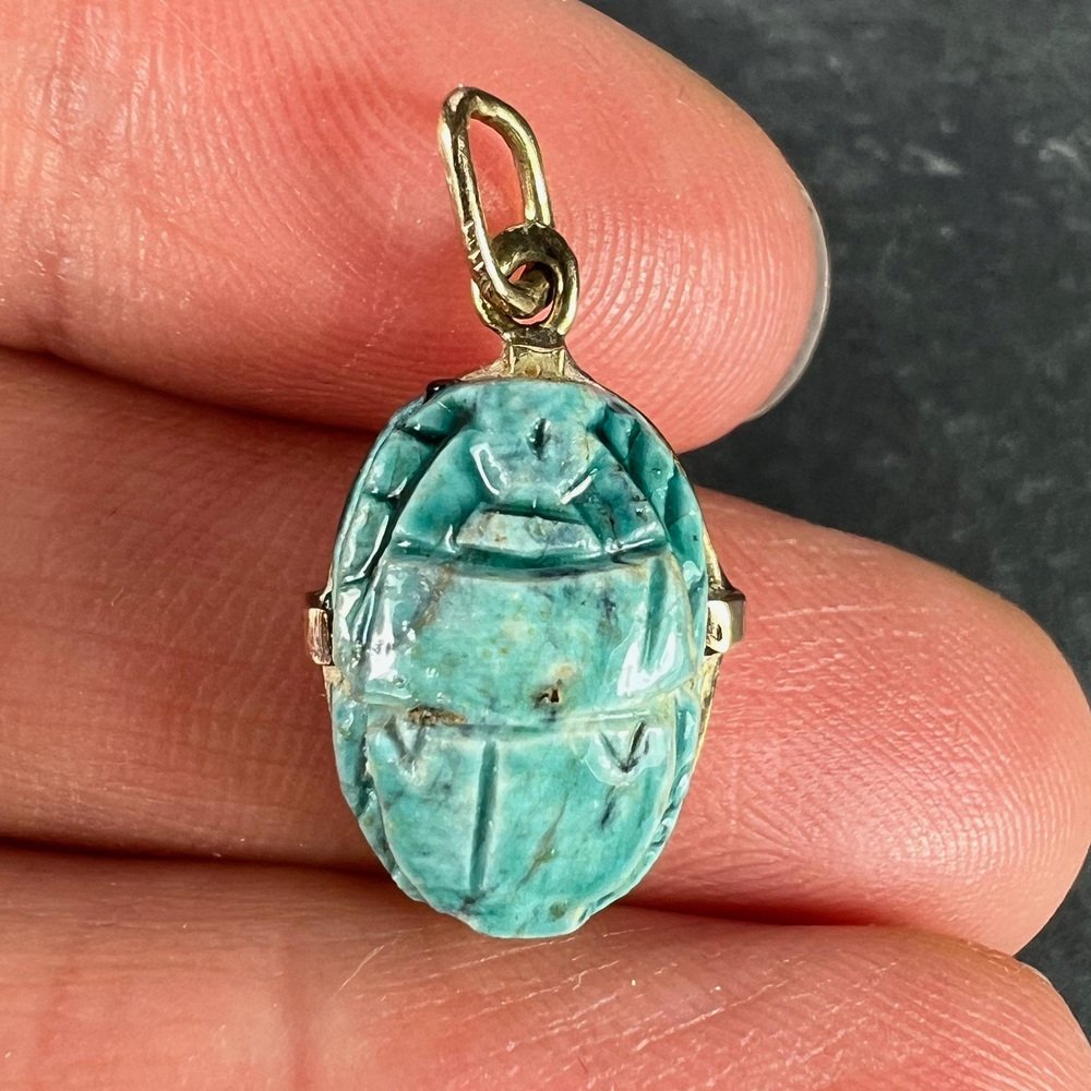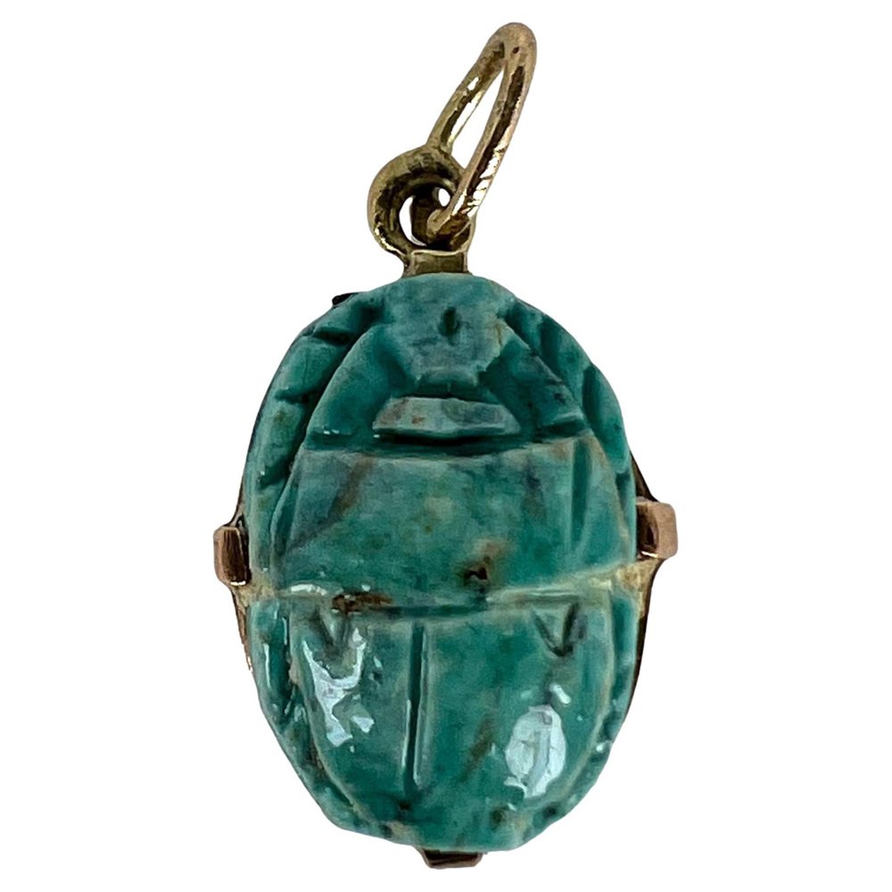 Egyptian Faience Ceramic Scarab 18k Yellow Gold Charm Pendant, 1920s
