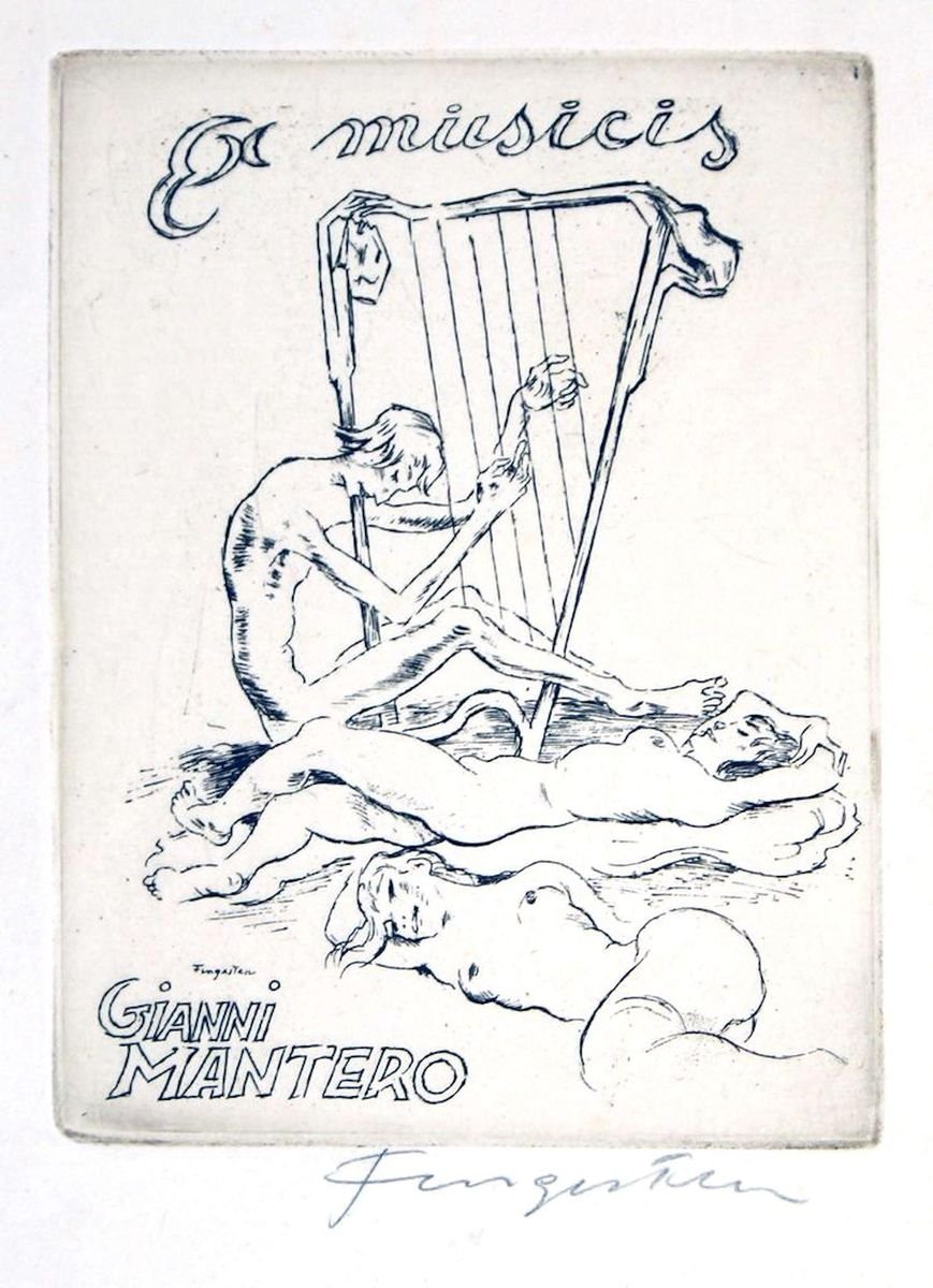 Image dimensions: 10x7 cm Original rare Ex Musici by Michel Fingesten, realized by the Artist for Gianni Mantero. Signed on plate and hand signed in pencil. Very good conditions. Michel Fingesten Michel Finkelstein, known as Fingesten, was born in 1884 in Buzkovice u Ostravy; he was a painter and engraver, who was famous particularly for his extraordinary production of Ex Libris (bookplates). After studying at the Academy of Fine Arts in Vienna, and in Monaco with Franz von Stuck, who addressed him to the caricature and to the graphics of small size, Fingesten left Austria; he travelled all over the world, visiting Europe, the United States of America and the Oriental countries. Fingesten’s stay in Berlin since 1913 was decisive for his contact with the world of the engraving. After his adhesion to the New Secession, Fingesten destroyed his previous pictorial production and he decided to dedicate himself to the dimension of the engraving; even if he preferred the graphics, he continued to see himself as a “painter”. The German city was characterized by a very dynamic artistic atmosphere that stimulated Fingesten. The engravings of this artist were published since 1915 in files and books in limited edition. Fingesten’s works were published also in the famous periodicals of the expressionist avant-garde, like “Genius” and “Marsyas”, with the artists and the writers most important of his age. Considered as a genius of the Ex Libris, that became with him a big art of small size, Fingesten realised more over than 1.500 of these brands of property since 1915. Fingesten’s Ex Libris were nourishment for the bibliophiles, who glued the bookplates on the first page of theirs books to indicate the property and who traded these Ex Libris. The Ex Libris is a genre that doesn’t have confines and that can’t be reduced to indicate the name of the owner on the book, on which it is glued. It left his old function of simple heraldic sign of property, and it became almost the projection of the bibliophile’s personality. Even if he didn’t fall in the eclecticism, Michel Fingesten used generously the medium of the quote, in the subject, in the form and in the style. In the 20s, for example, his art oscillates between Otto Dix and George Grosz, of which he overcomes the social critique and the erotism, and Karl Arnold of which he beats the irony. The Great Depression of 1929 and the rapid advance of the Nazism contributed in a significant way to the progressive isolation of the Czech painter and engraver. In the spring of the 1935, Fingesten left Germany and went to Italy, where he settled in Trieste and Milan. The collector Mantero remembers about Fingesten’s Italian stay that “he lived in a home without furnitures” in Via Chiaravalle 11. Mantero, who was one of the most important Fingesten’s customers of Ex Libris, wrote: “I understood he had a difficult and poor life for absence of money, but he didn’t have ambition of a rich life, indeed he told me that the earnings to buy some bread and a glass of wine were enough for him”. In that period, the main means of subsistence were the commissions of the collectors of Ex Libris, especially the collectors of Milan and Como, members of the circle of friends of the art merchant Luigi Filippo Bolaffio. Also known as “Picasso of the Ex Libris”, Fingesten explored this artistic medium and he elevated it with new and powerful expressive resources. When the Ex Libris was detached from its practical function, the Artist began to create Ex Libris also for fake customers, for “famous contemporary people”, poets, musicians, and since 1928, for political men. The Ex Libris, realised with a lot of graphic techniques, like the etching, the drypoint and the lithography, has always (with the graphics of occasion) the signature of the Artist, that underlines the awareness of his valour. An important chapter of the production of this Artist was dedicated to the erotic Ex Libris, that for their irony were understood with difficulty by people that didn’t belong to the circle of the Artist. Some of the most secret and rare erotic works by Fingesten are linked to the commissions of Gianni Mantero. The dominant element of these engravings is the sarcasm, that is sometimes connected to a gloomy irony, and to the presence of the death, that coincided with the war, particularly in the last years of the Artist existence. In his compositions, Fingesten was a narrator of life and death, of sex and love, of nightmares, hopes, art and poetry. His narration wasn’t without the time and the space, but it was at the center of the contemporary dimension, in the 20s and 30s of the anguished Europe that was going to the ruin. We can underline that the relationship between the Artist and the customer had an important role in the definition of the power of these graphic works; actually the creative energy, that was born from the contact between the Artist inspiration and the customer personality, generates a strong expressive freedom. After his death, Michel Fingesten and his works were forgotten; today there is a new attention to this very important artist and to his visionary sign. Bibliography • N. Nechwatal, Michel Fingesten – Das graphische Werk, Coburg 1984 • A. Tomasetig, Michel Fingesten: dalla collezione Cauti una mostra di ex libris e grafica d’occasione, 2005 • A. Parik, The unknown Michel Fingesten, Praha 2008 This artwork is shipped from Italy. Under existing legislation, any artwork in Italy created over 70 years ago by an artist who has died requires a licence for export regardless of the work’s market price. The shipping may require additional handling days to require the licence according to the final destination of the artwork.