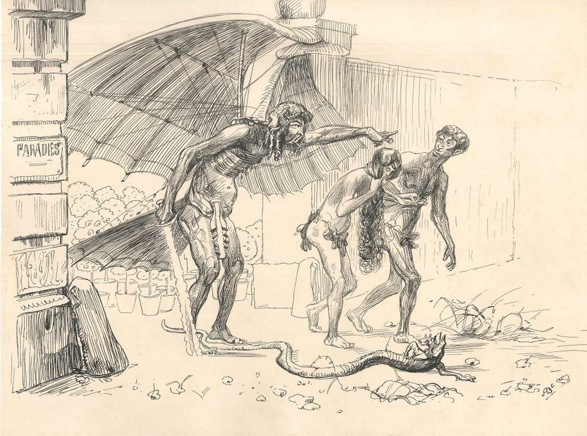 Expulsion from Paradise - Original Ink Drawing by Lac Man Early 20th century
