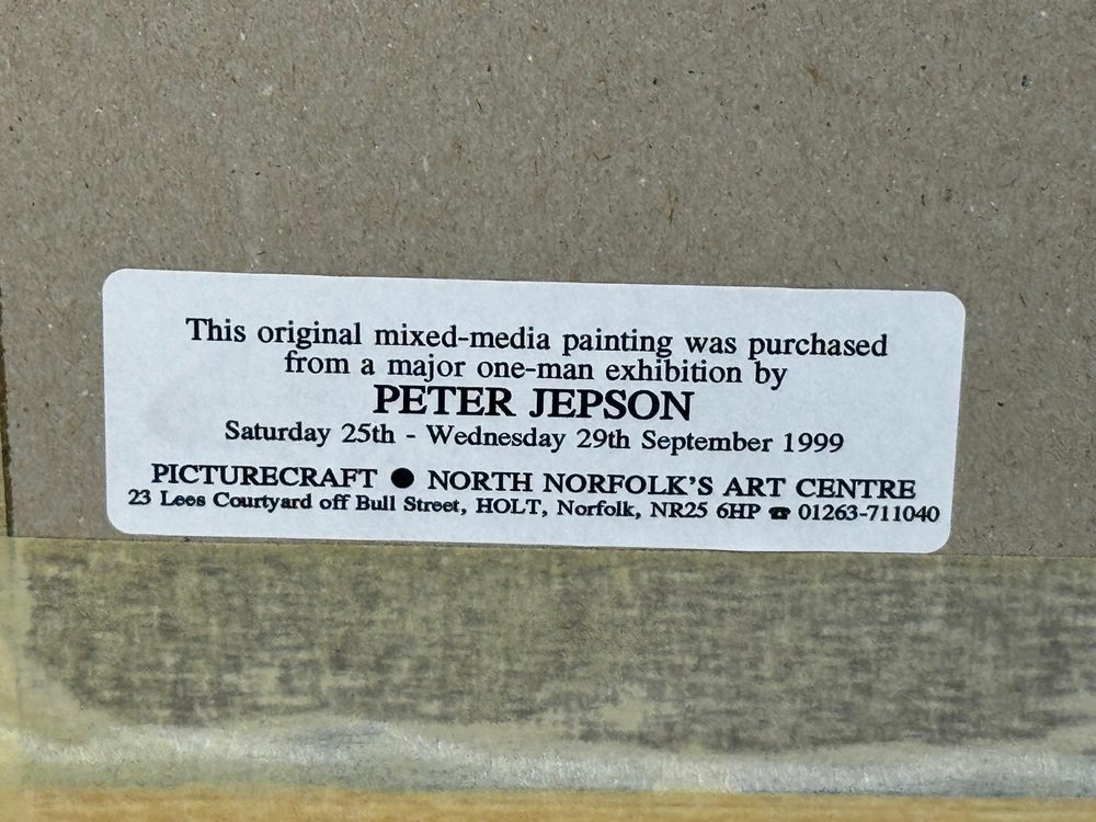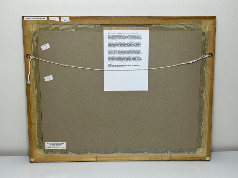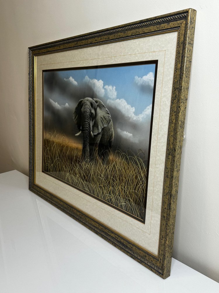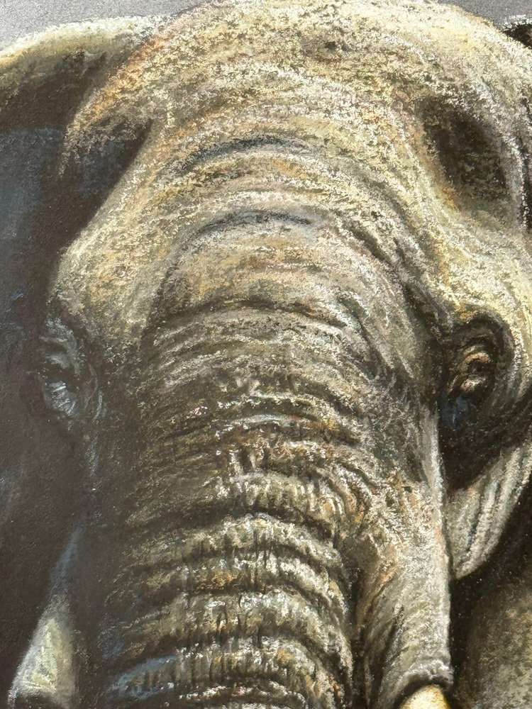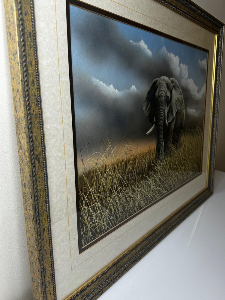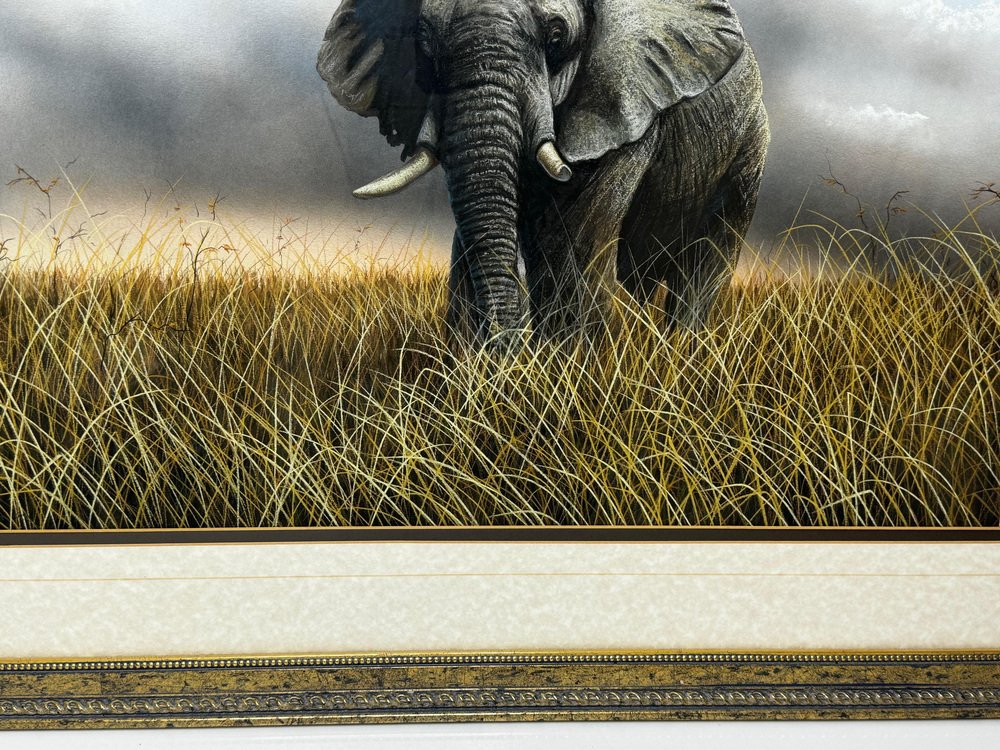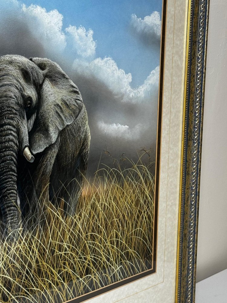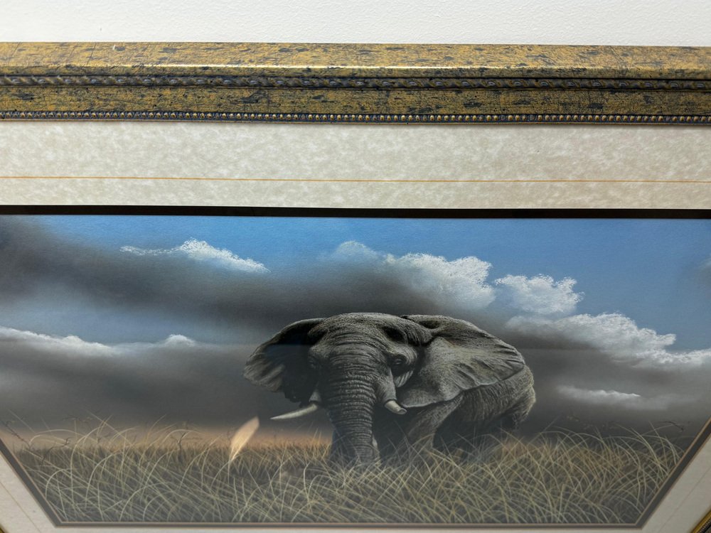 Follower of David Shepherd, Large British Painting Gray Bull Elephant About to Charge, Kruger National Park, 1990s, Mixed Media, Framed