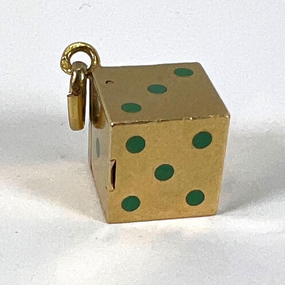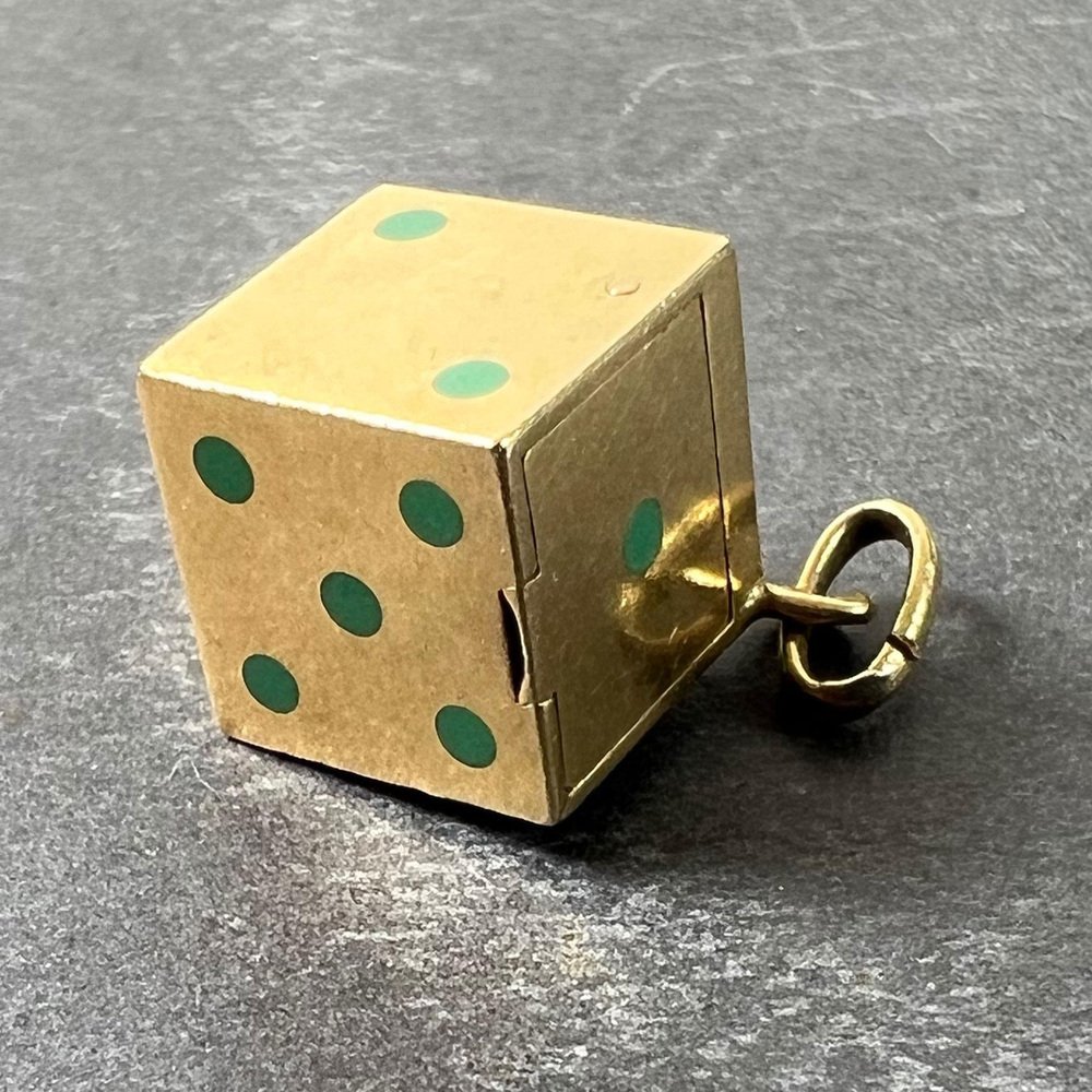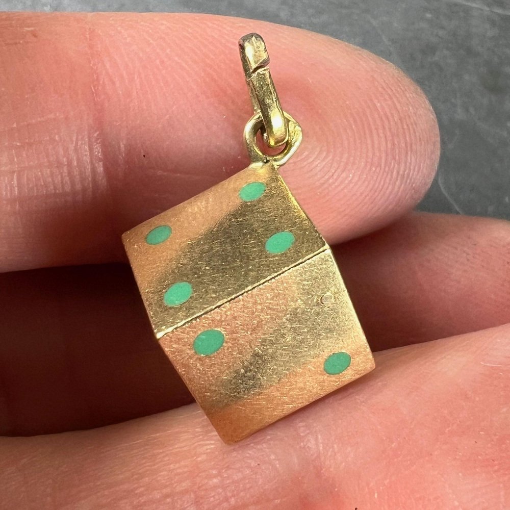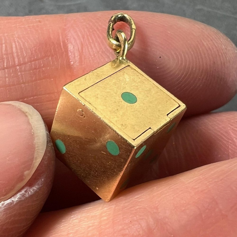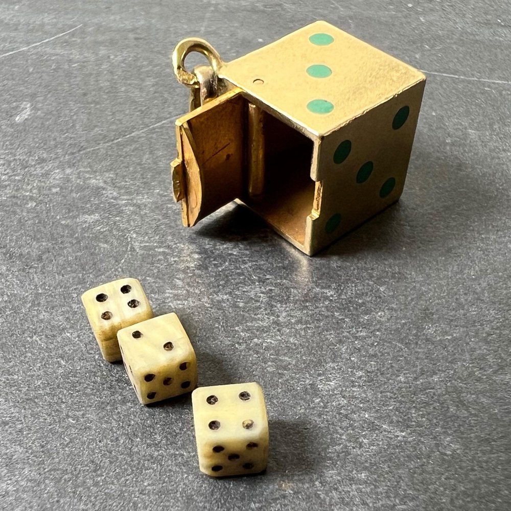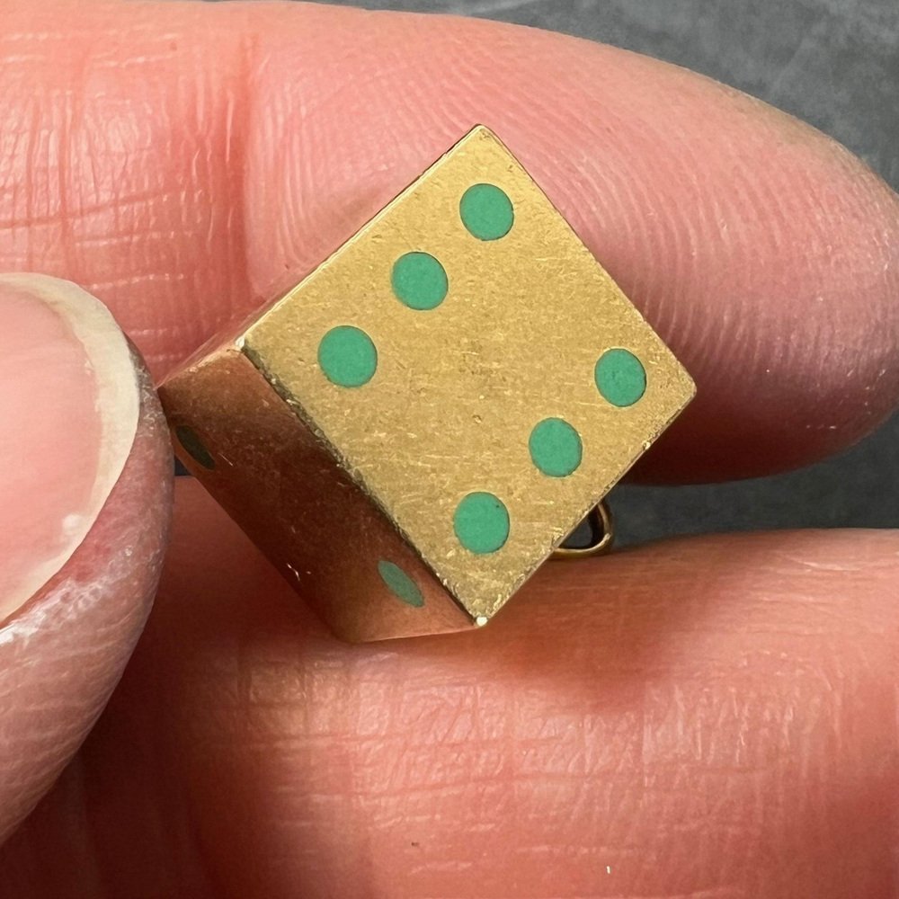 French Art Deco Die with Miniature Dice 18k Yellow Gold Enamel Charm Pendant, 1890s