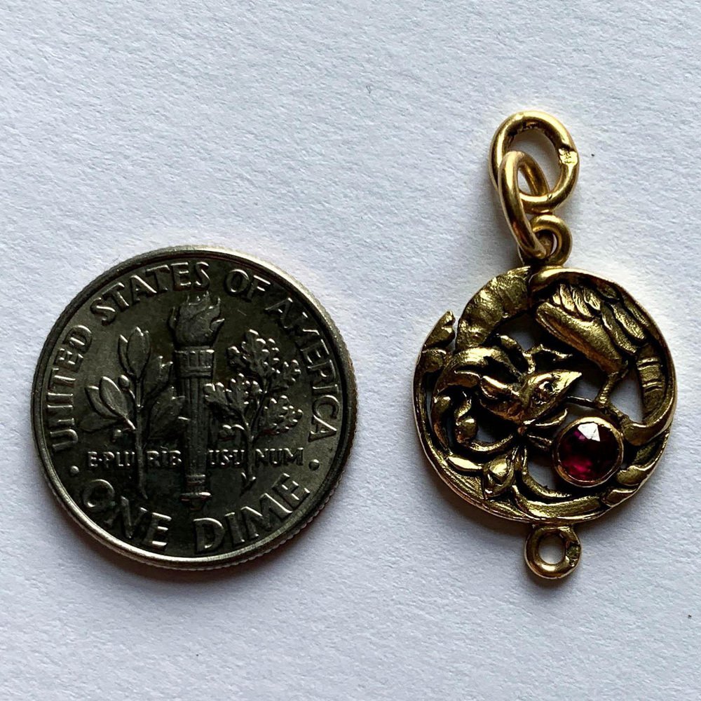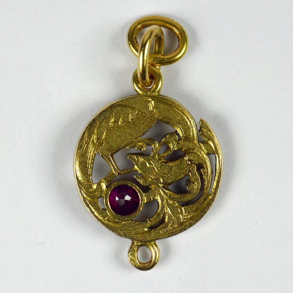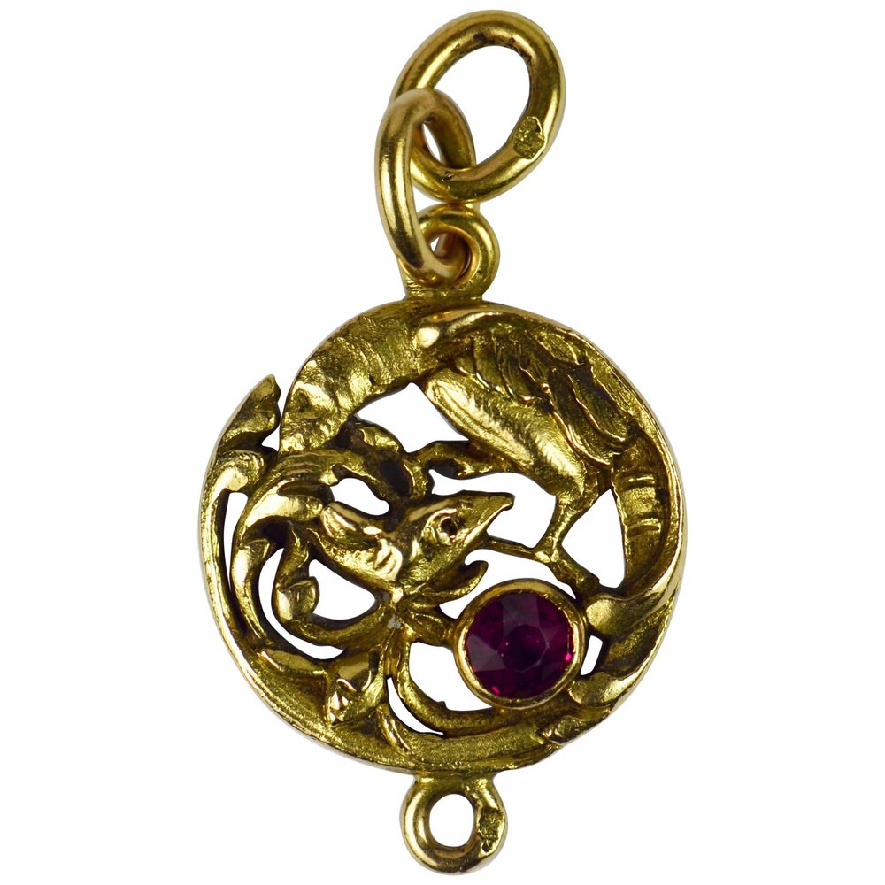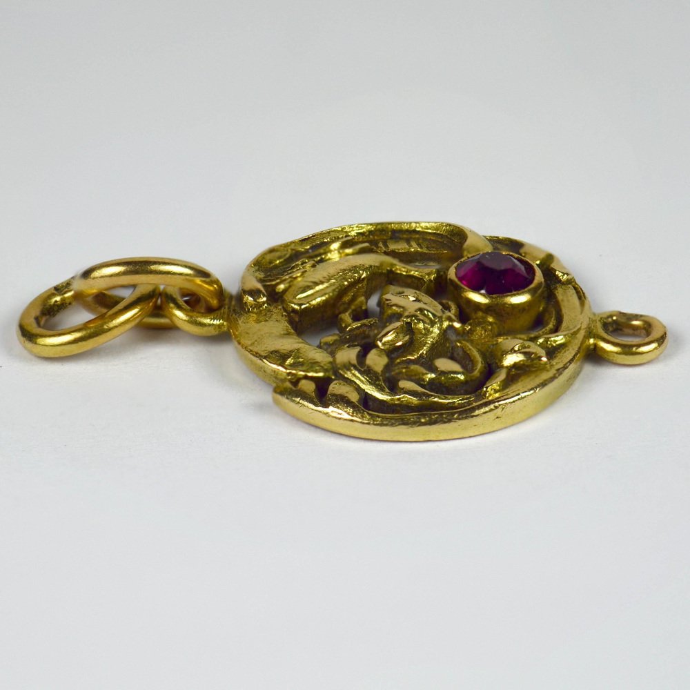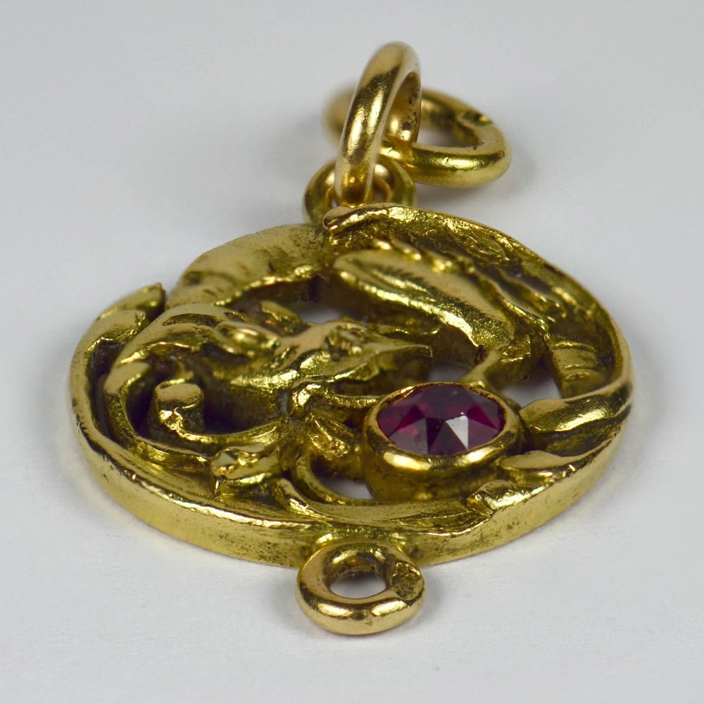 French Art Nouveau 18 Karat Yellow Gold Red Ruby Griffon Charm Pendant, 1890s