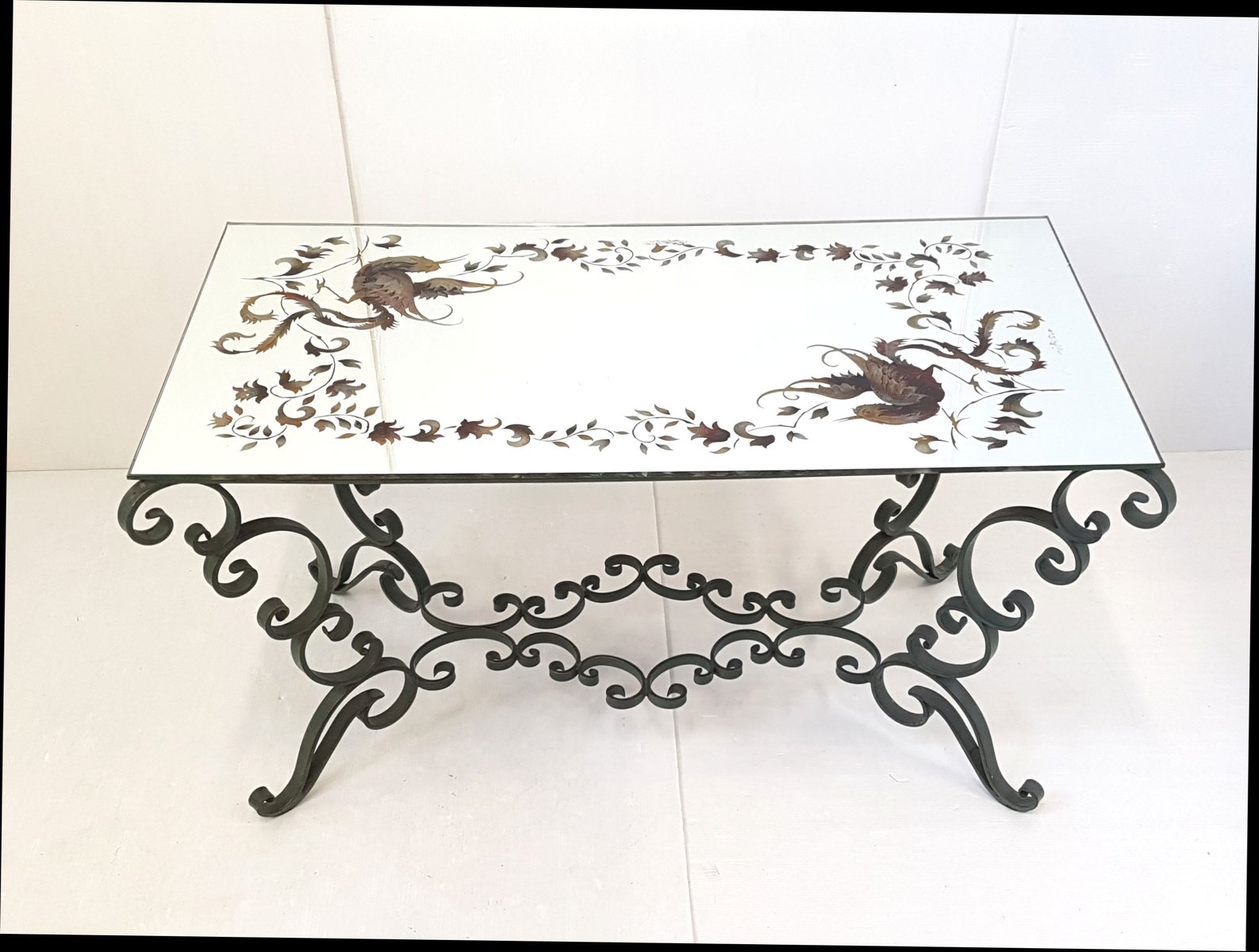 French Green-Lacquered Steel & Mirrored Top Coffee Table, 1940s