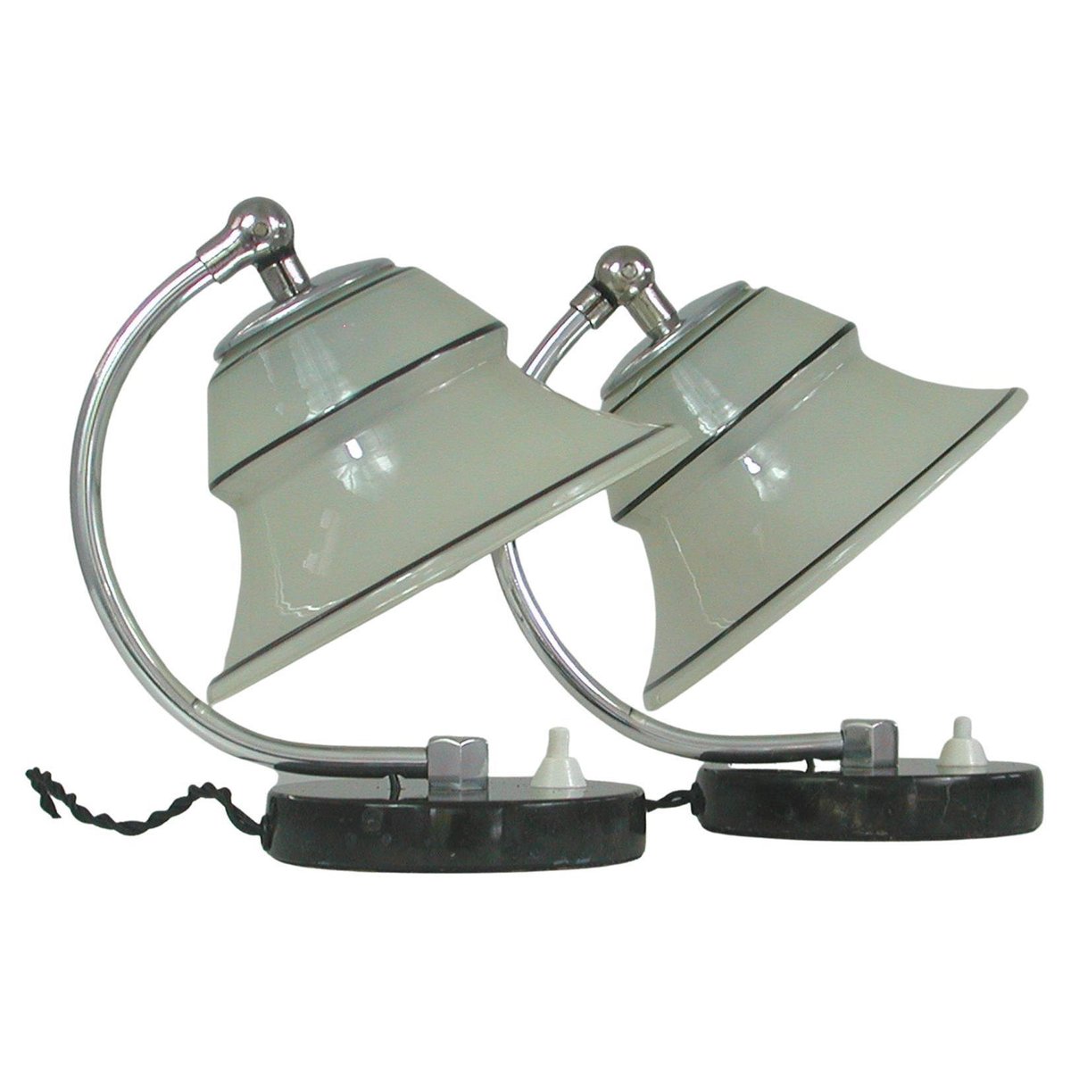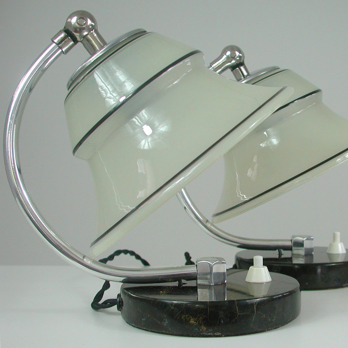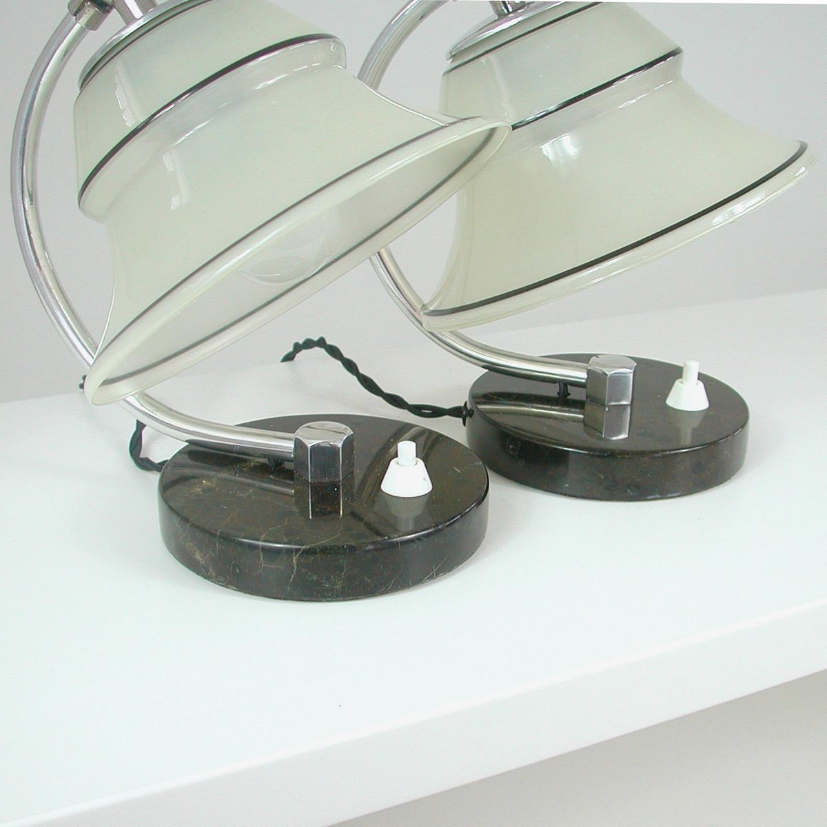 German Art Deco Enameled Satin Glass, Marble and Aluminum Table Lamps, 1930s, Set of 2