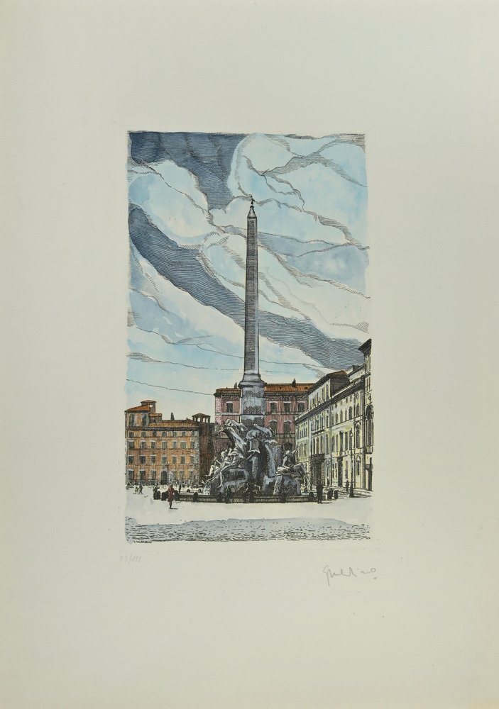 Giuseppe Malandrino, Fontana dei Quattro Fiumi, Etching, 1970s
