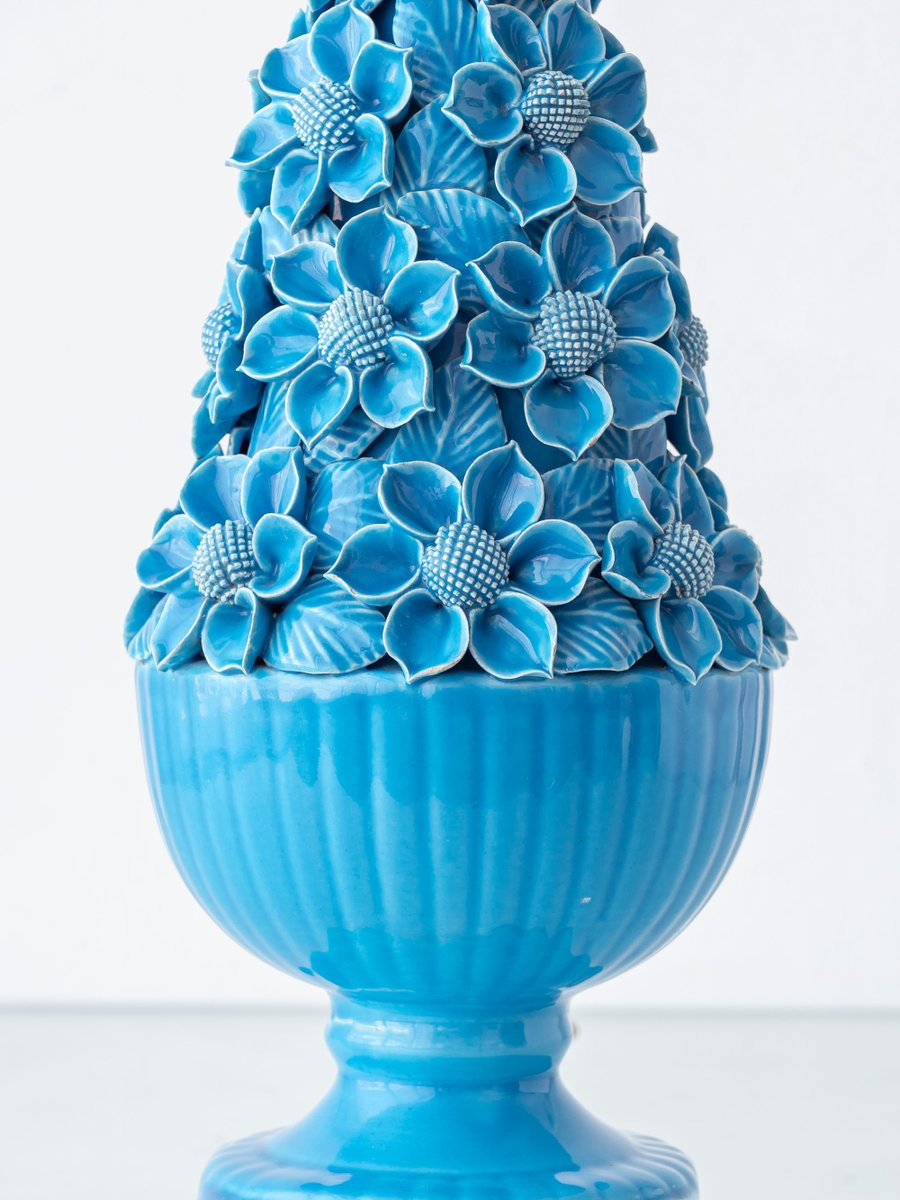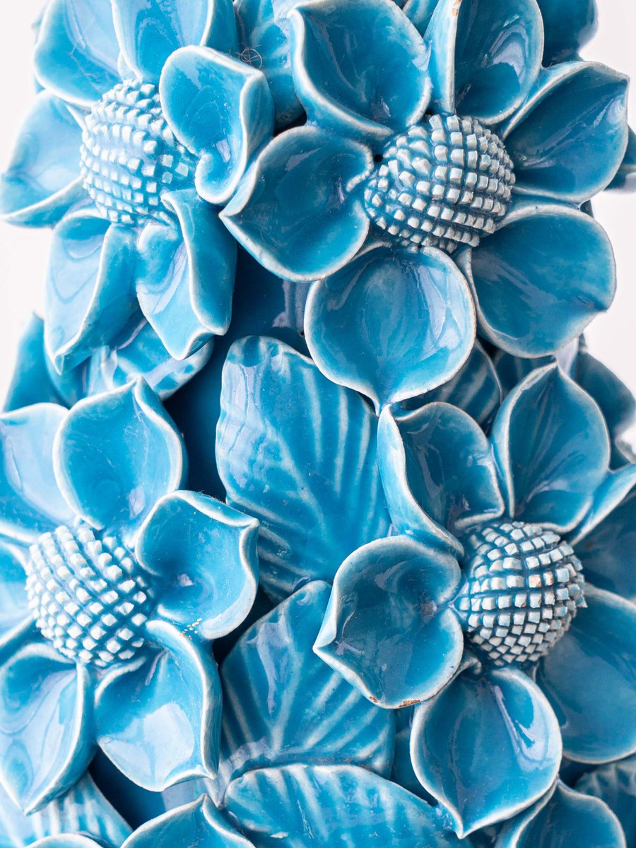 Hand-Carved Turquoise Floral Ceramic Table Lamp with Silk Lampshade from Manises, Spain, 1960s
