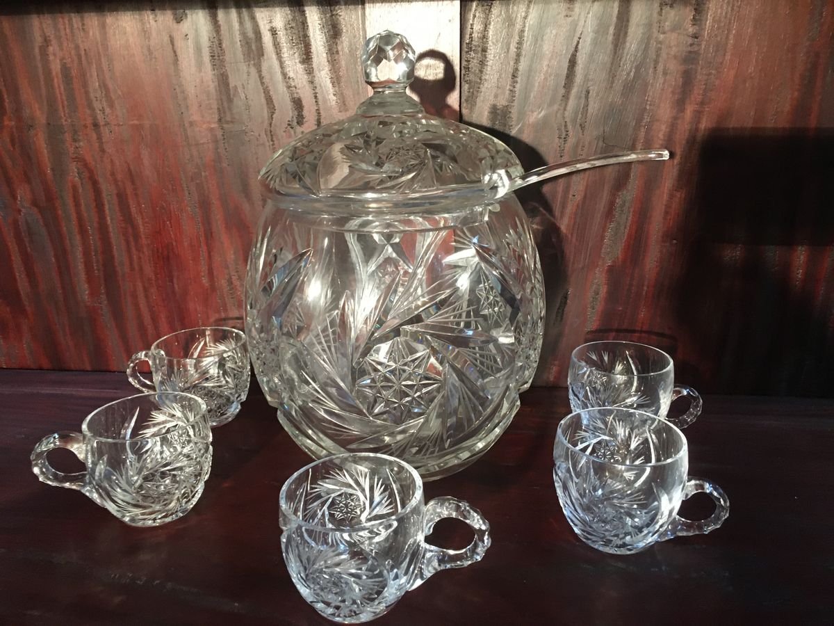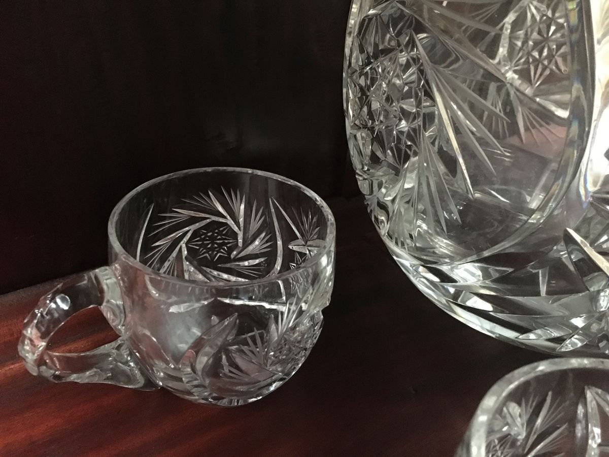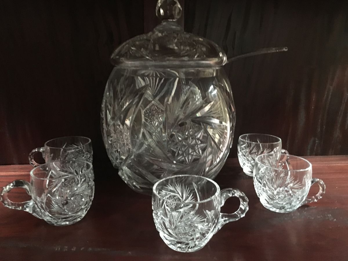 Hand-Cut Crystal Vase Set with Lid and 5 Cups, 1970s, Set of 8