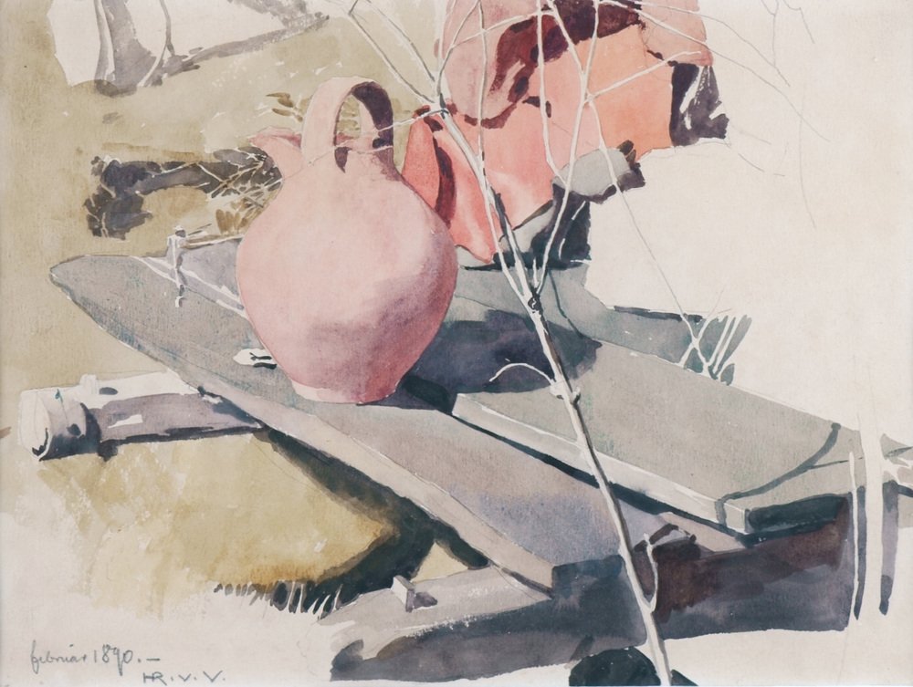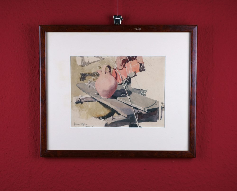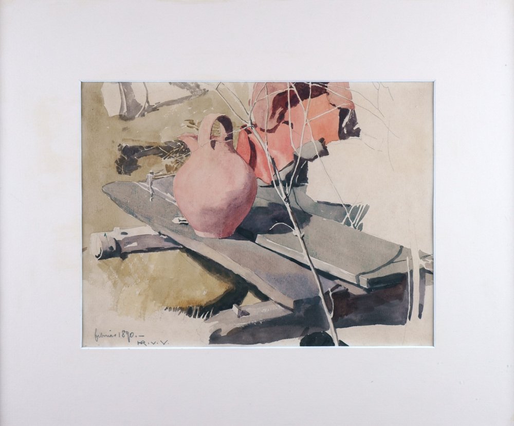 Hans Richard von Volkmann (1860 Halle (Saale) - 1927 ibid.), Clay jug on a bench. Pencil and Watercolour on paper. 20 x 26,7 cm (visible size), 37 x 45 cm (frame), dated and monogrammed lower left "Februar 1890 - HR. V. V."