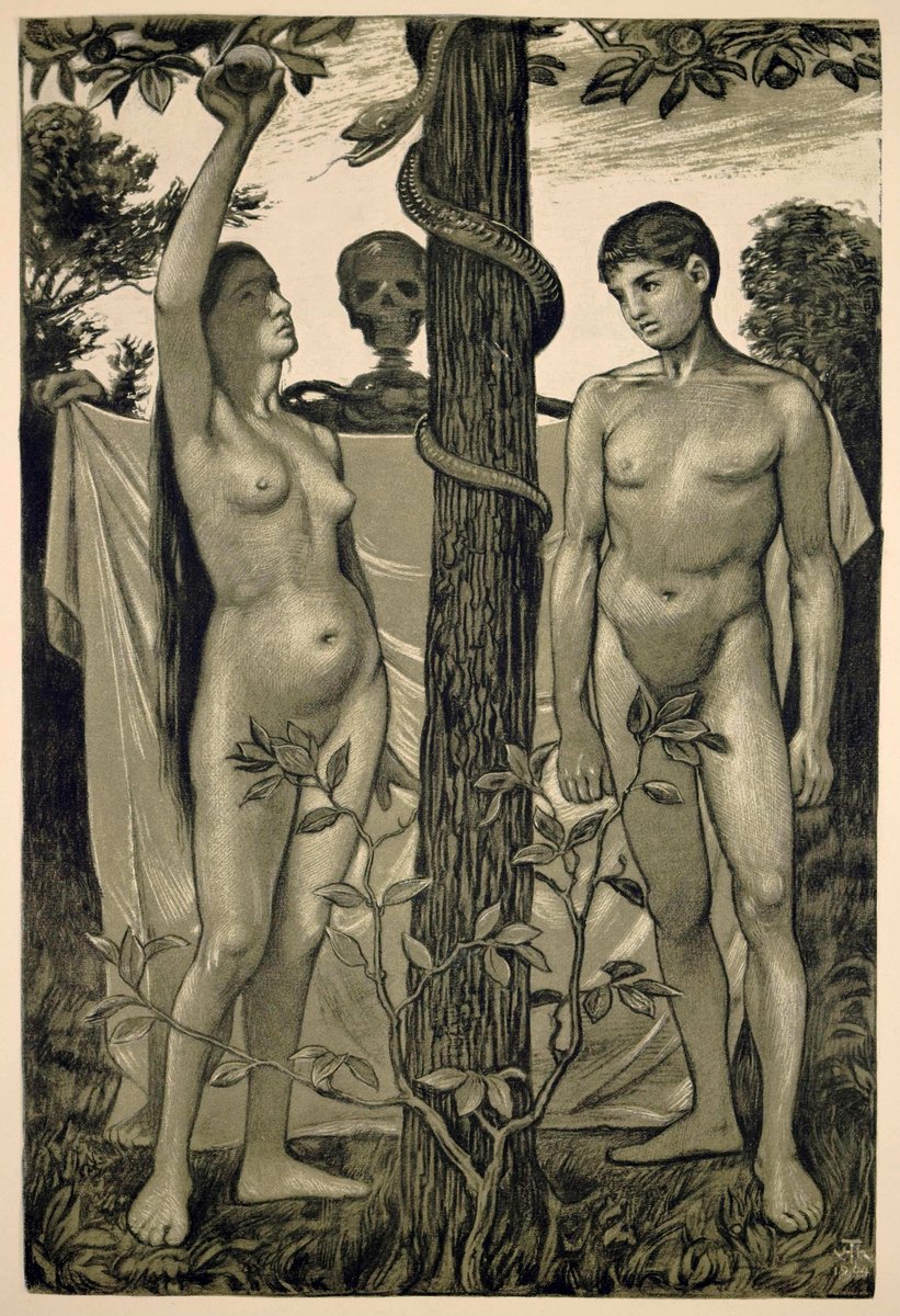 with his depiction of the Fall of Man, Hans Thoma addresses one of the most significant themes in Western art history. This subject was often portrayed, especially during the Renaissance, due to the depiction of naked bodies. If the Fall of Man is a turning away from God, Thoma emphasizes what separates and connects Adam and Eve. The tree and its branches physically separate them, as reflected in their body language. While Eve reaches for the apple and looks at the serpent as a temptress would, Adam stands introverted, seeming to look inward with a melancholy gaze at the consequences of the Fall of Man. However, Eve also appears sad and serious. Beyond their shared mood, the symmetrical positioning of their feet and the bush growing toward both of them connect the first human couple. Most importantly, however, it is the death behind them that unites Adam and Eve with the stretched cloth. They are united in their mortality.