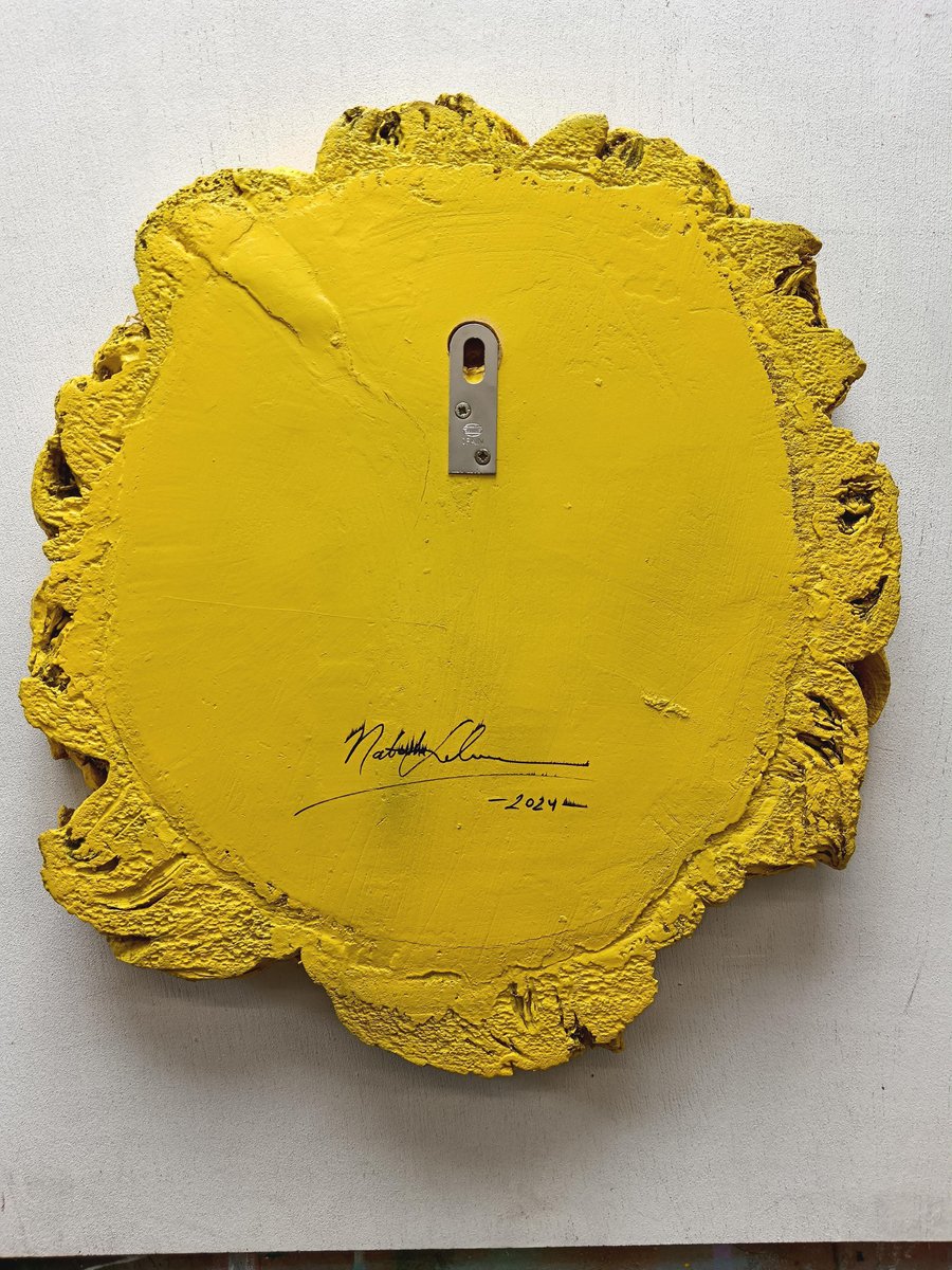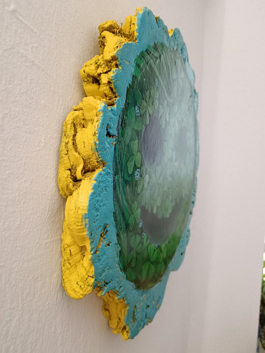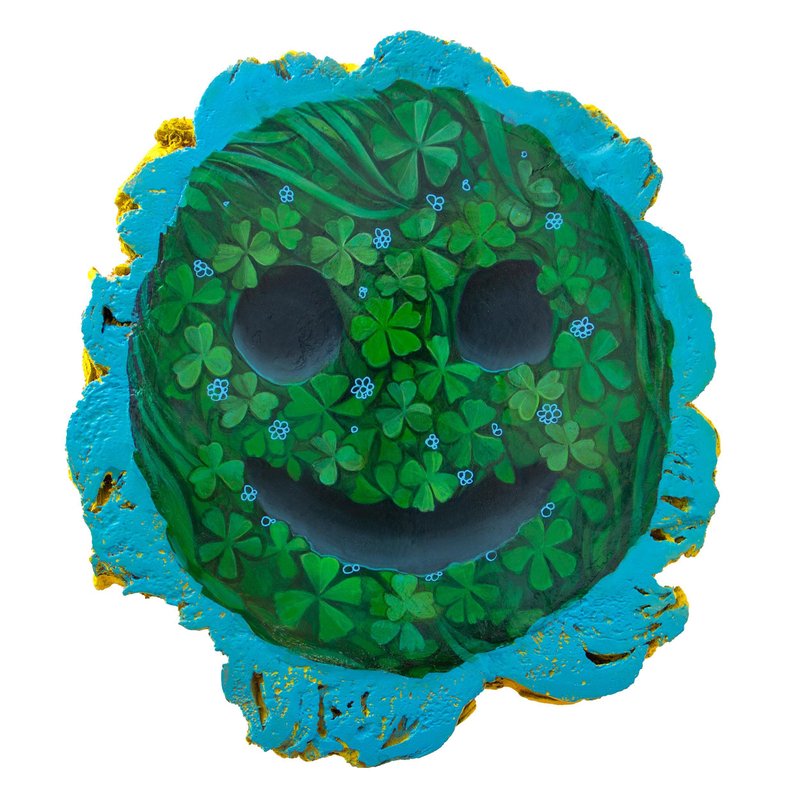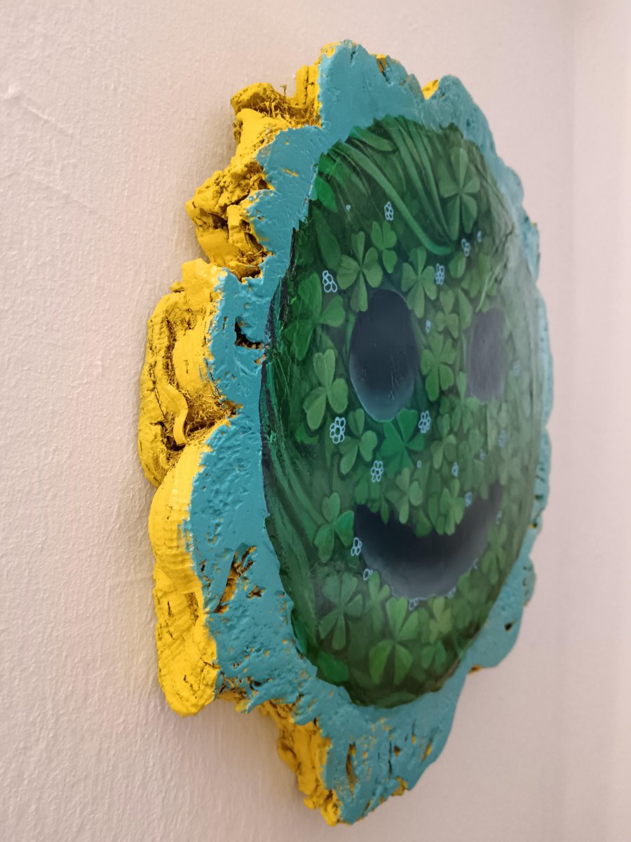 This original artwork, titled "nombre no válido 2", is part of Natasha Lelenco’s "nombre no válido" series, created on a tondo of reclaimed cork wood from tree cuttings in Galicia. The painting features a cheerful happy face emoticon, crafted from vibrant green clover leaves and small blue flowers, all meticulously painted in acrylic. The combination of these natural motifs with the universally recognized emoticon creates a dynamic interplay between nature and digital communication. The smooth, rounded shape of the smile and eyes emerges from the textured surface, blending with the organic patterns of the clover. The edges of the cork wood, painted in bright yellow and blue, accentuate the piece's natural irregularities, adding a sculptural dimension that enhances its presence. The integration of the emoticon with clover leaves, symbols of luck and nature, highlights the contrast between the natural world and modern symbols of happiness. The bright color palette and natural elements, such as the clover and small flowers, evoke a sense of harmony between the organic and the artificial. Natasha Lelenco’s use of acrylic on cork wood allows for sharp detailing and vibrant colors, with the clover leaves carefully layered to add depth and texture to the surface. This work, like the others in the series, reflects on the evolution of language, where emoticons have become naturalized in our daily communication. By merging these symbols with elements of the natural world, Lelenco invites the viewer to explore the intersection of nature, art, and digital expression. Keywords: Cork Wood, Happy Face Emoticon, Original Acrylic Painting, Clover Leaves, Nature and Technology, Green and Blue Painting, Natasha Lelenco, Sculptural Painting, Abstract Art, Wooden Tondo, Contemporary Art.