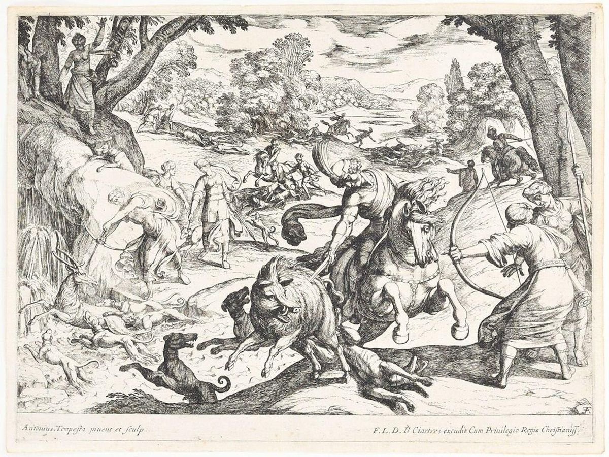 Image dimensions: 20.4 x 27.5 cm. Hunting Scene is a wonderful black and white etching on thick laid paper, realized by the Italian master, Antonio Tempesta (1555-1630). Monogramm on plate on lower right corner. On lower margin there the Latin inscriptions on plate: ''Antonius Tempesta invent et sculp. / F.L.D. Il Ciartres excudit Cum Privilegio Regis Christianiss''. As the inscription reports, this etching was printed and published by Ciartres, an Italianisation of the French Chartres, referring to François Langlois (1588-1647), a French publisher and merchants of prints. This original print with lifetime impression describes an incredibly detailed hunting scene in the perfect Baroque style: an Oriental chevalier riding on his horse is wondering with his sward a big boar, already torn by hunting dogs. At the same time some arches are pointing a deer hunted by dogs. Not ever the women escape hunting and they are not mere spectators but active protagonists. In excellent conditions although visible signs of time, light foxing on lower margin, some minor defects on the edges and a usual yellowing of the paper at the edges. On the verso, on lower-left corner a blue ink stamp ''Collezione Pugliese''. Including a cream colored cardboard passepartout, cm 50 x 35. An exciting original print has the dignity of a mythological or epic story, represented with an incredible balance of black and white, light and shadows and a typical baroque dynamism. Antonio Tempesta known as Il Tempestino (Florence, 1555 - Rome, 1630) was an Italian painter and engraver of the early Baroque period. Antonio Tempesta trained in the culture of the late Mannerism, with a naturalistic but also calligraphic taste, acquired from the frequentation of Giovanni Stradano, with whom he collaborated in the decoration of Palazzo Vecchio. Moving to Rome in 1573, he worked for Pope Gregory XIII, frescoing some maps of the Romm of geographical maps in the Vatican, including the famous Map of Rome (1593). In the pontifical capital he worked for many noble families and for important cardinals such as Alessandro Farnese and Scipione Borghese. His works are in San Giovanni dei Fiorentini, at the villa in Caprarola, in Tivoli. He returned to Florence for a brief stay, where he collaborated with Alessandro Allori, Ludovico Buti, Giovan Maria Butteri and Ludovico Cigoli on the decoration of the ceilings of the Uffizi Gallery on the east side, executed with grotesque drawings. When he returned to Rome he devoted himself more and more to engraving, with which he achieved a wide reputation and spread throughout Europe. The 150 Old Testament illustrations known as the Tempest Bible are famous. He was also a talent draftsman, endowed with a particularly scenographic vein, and other artists printed and spread his work in the drawing. This artwork is shipped from Italy. Under existing legislation, any artwork in Italy created over 70 years ago by an artist who has died requires a licence for export regardless of the work’s market price. The shipping may require additional handling days to require the licence according to the final destination of the artwork.