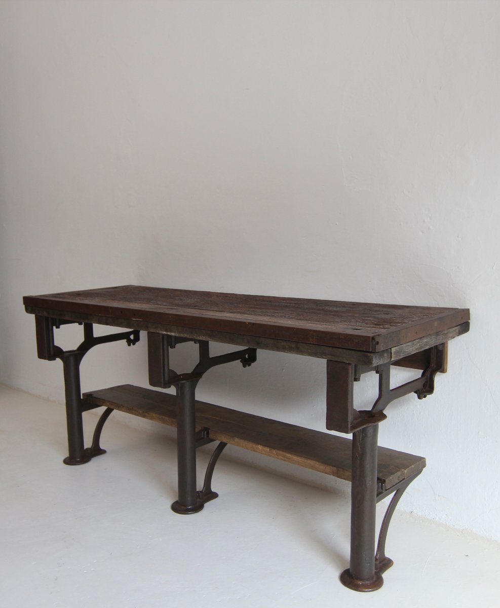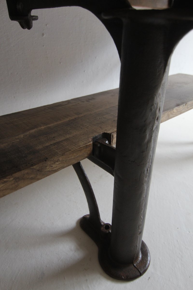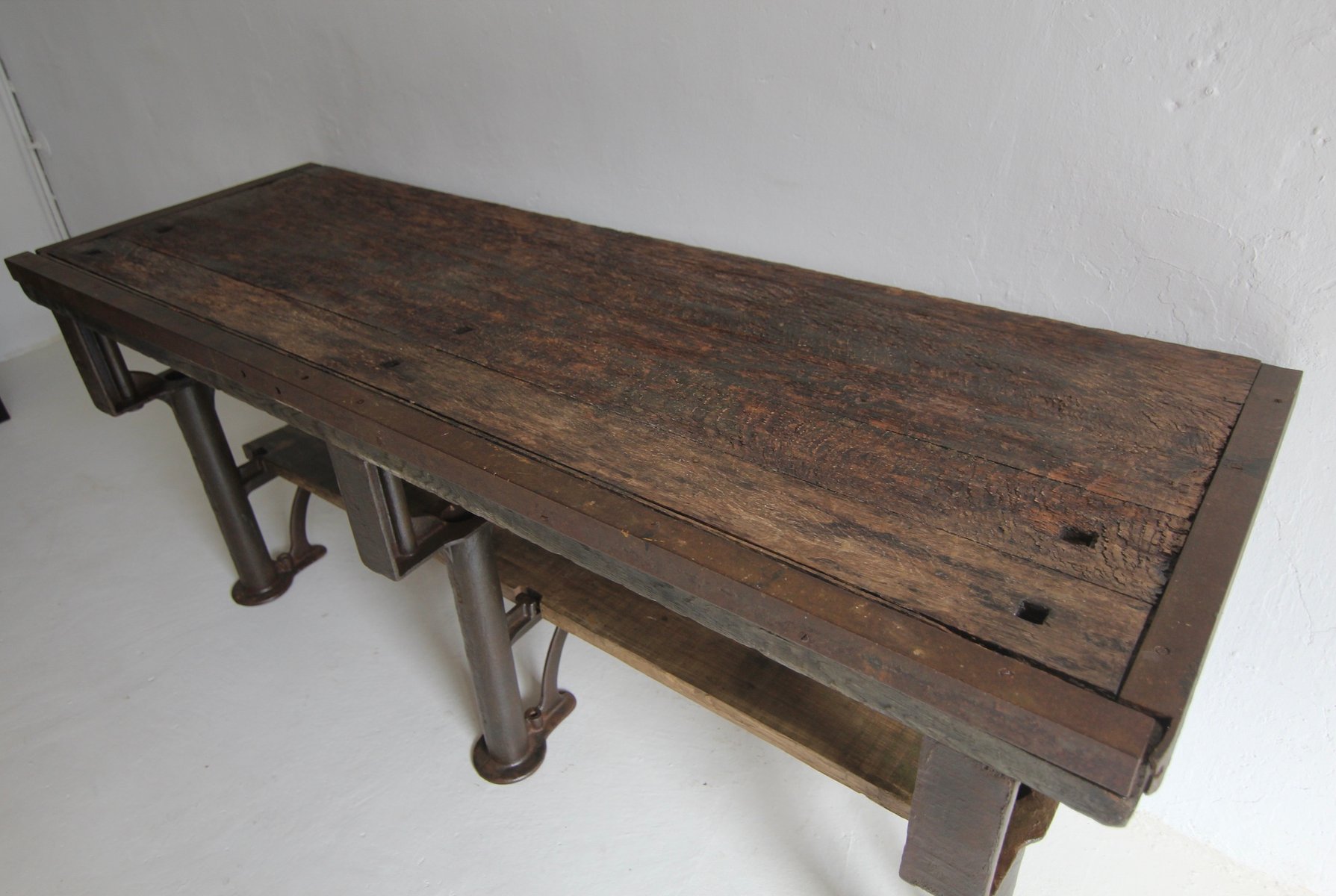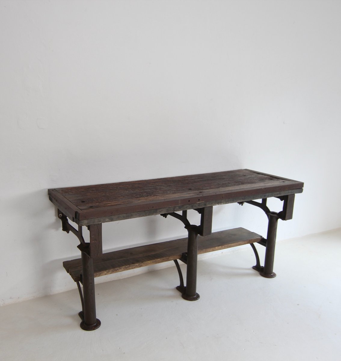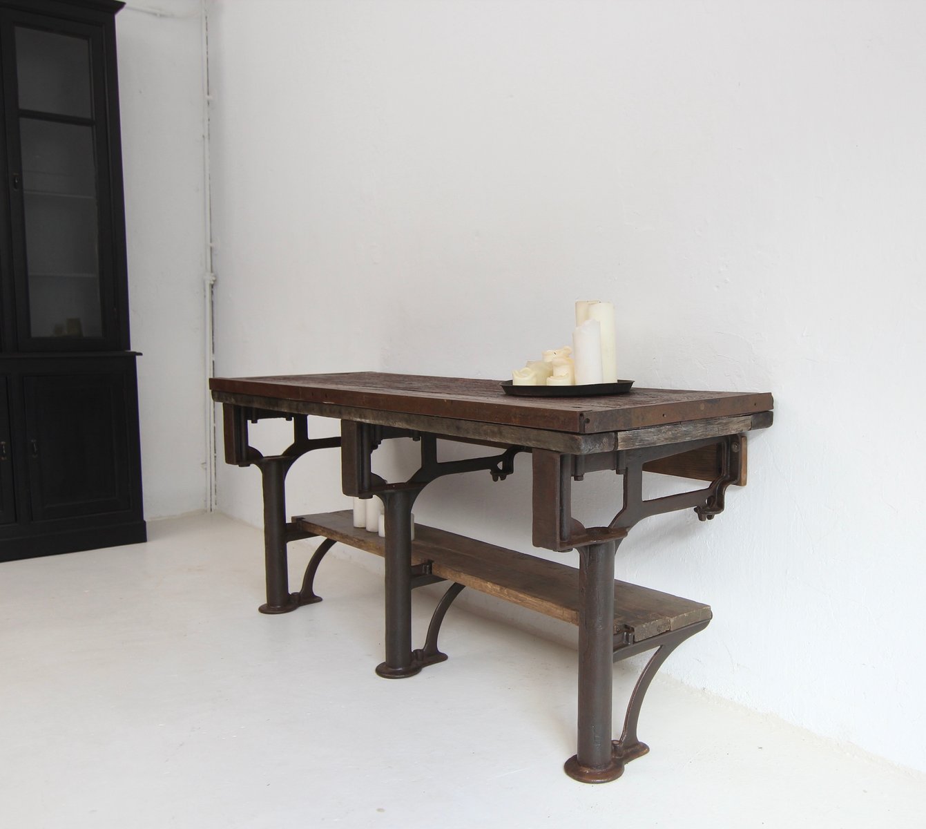 Industrial Wabi-Sabi Cast Iron and Wood Console Worktable, 1920s