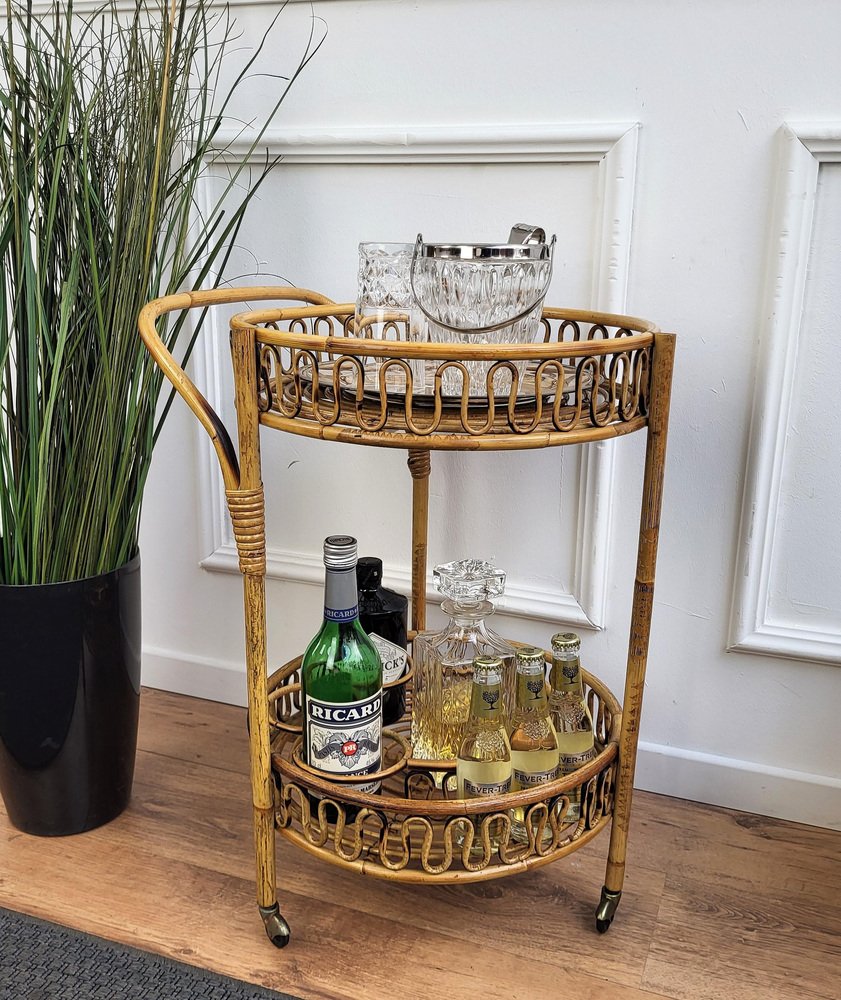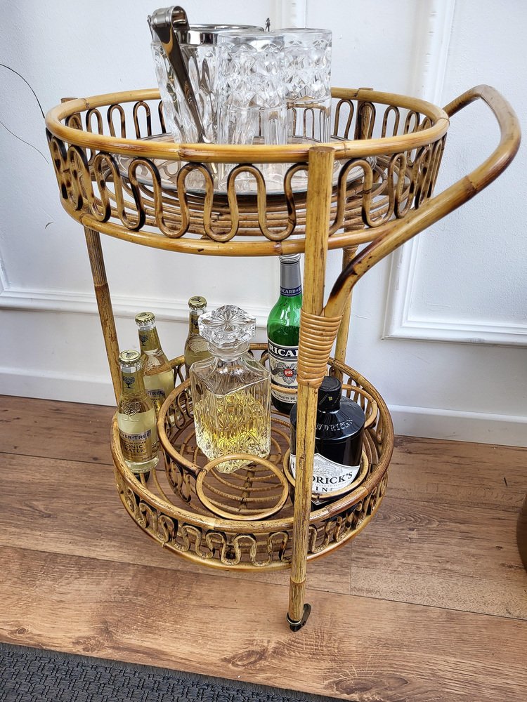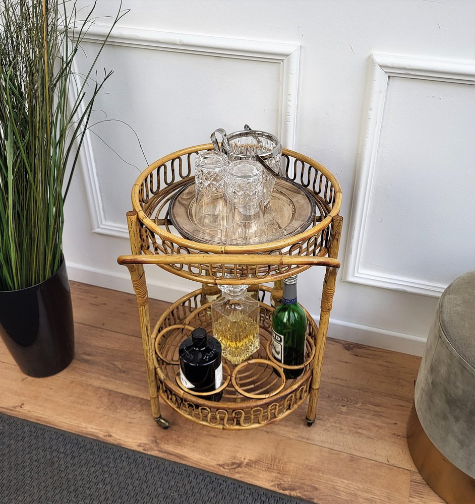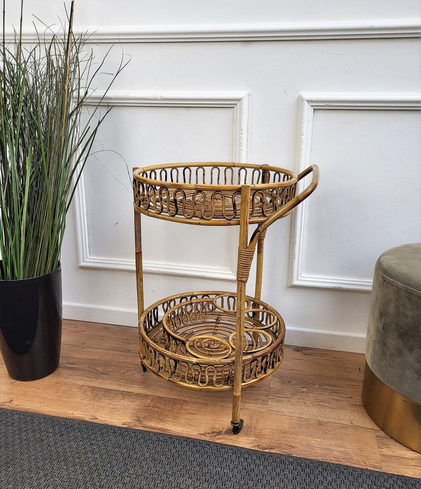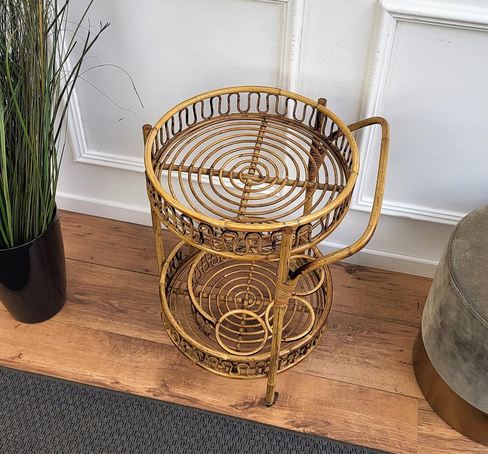 Italian Bohemian Round Serving Bar Cart in Bamboo and Rattan by Franco Albini, 1960s