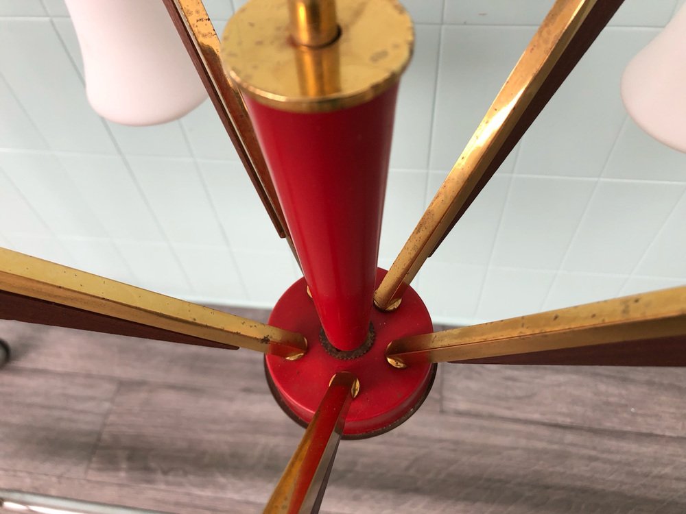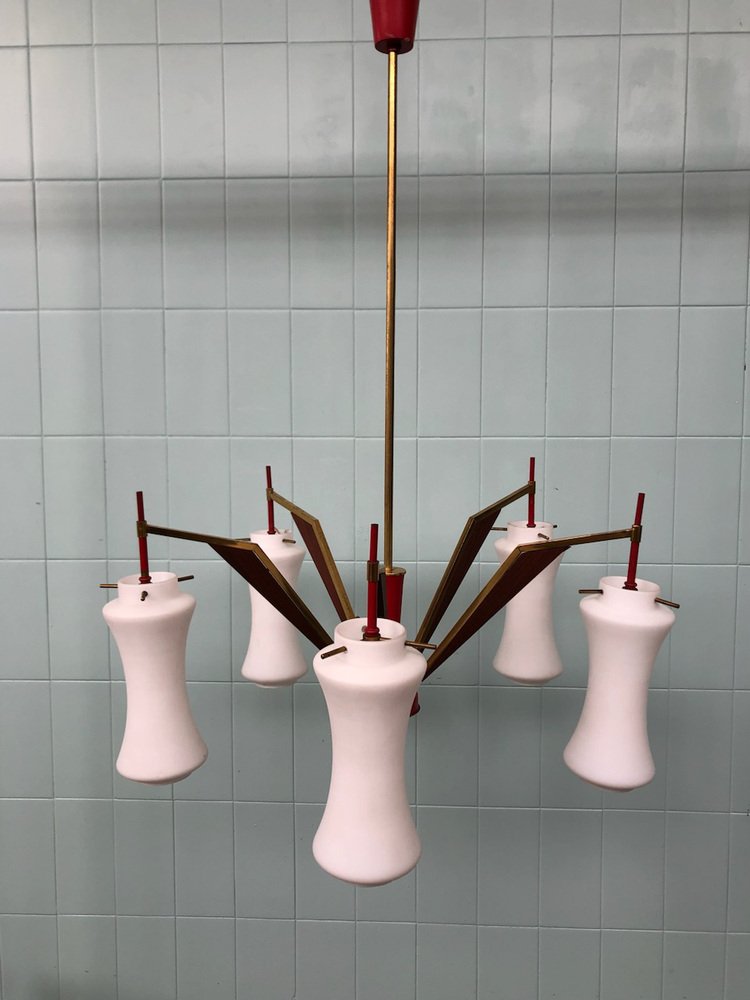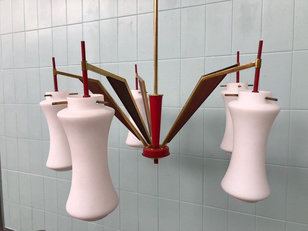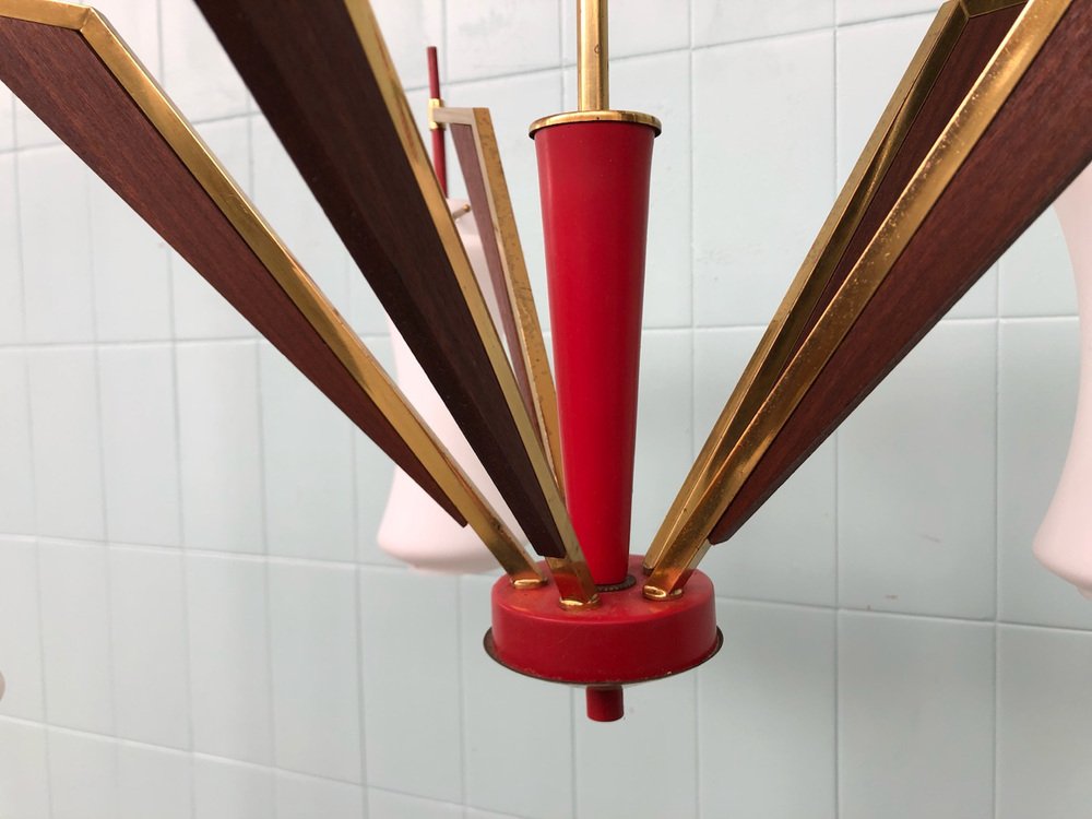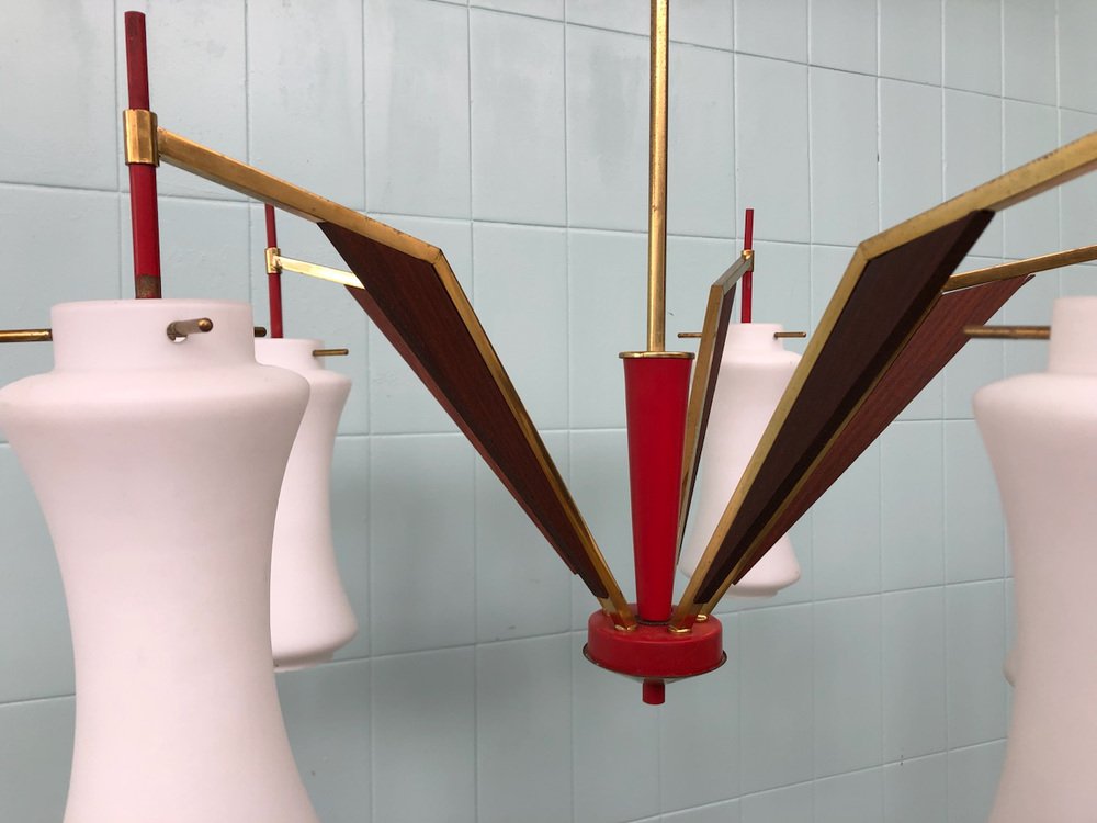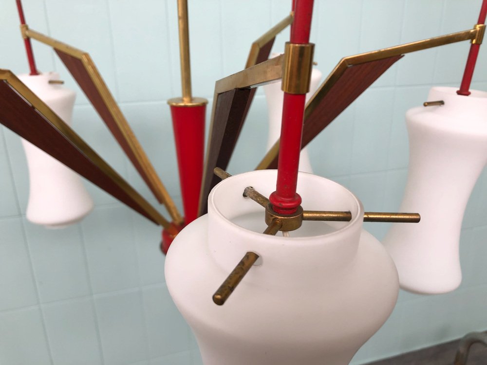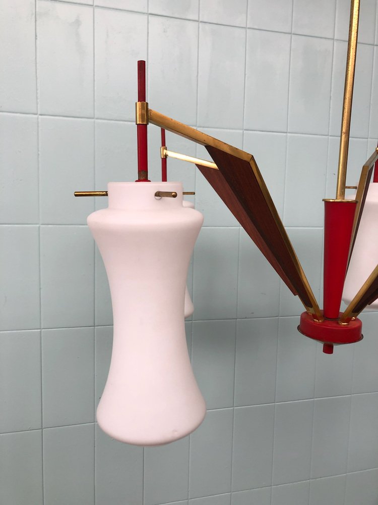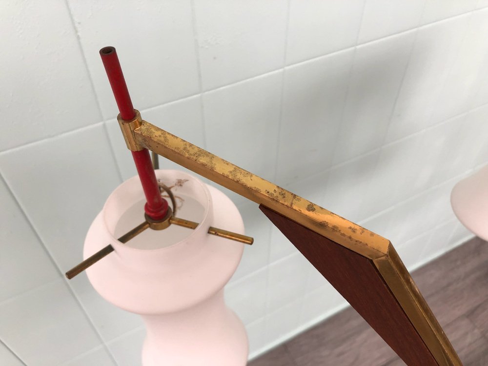 Italian Brass Hanging Lamp in Metal and Teak with Opal Glass Lampshades from Stilnovo, 1950s