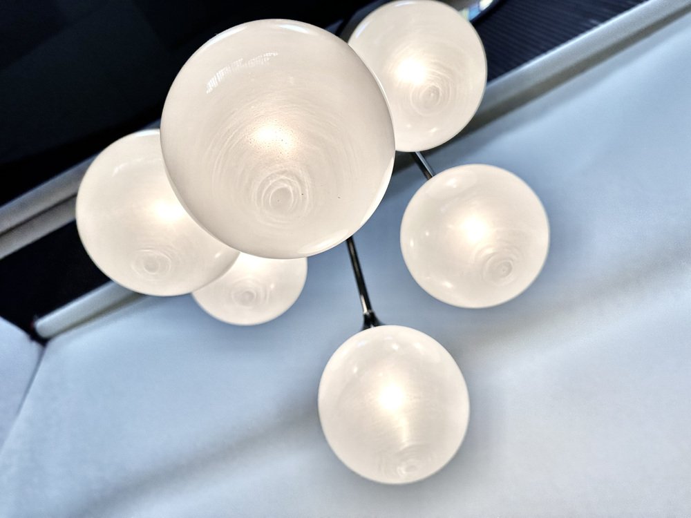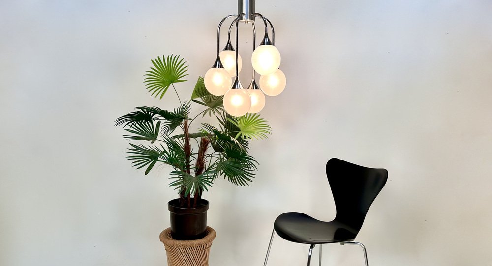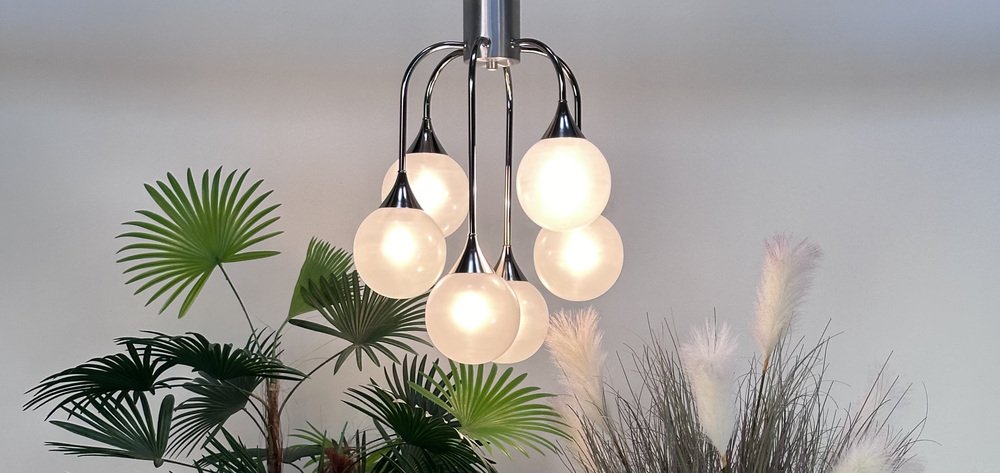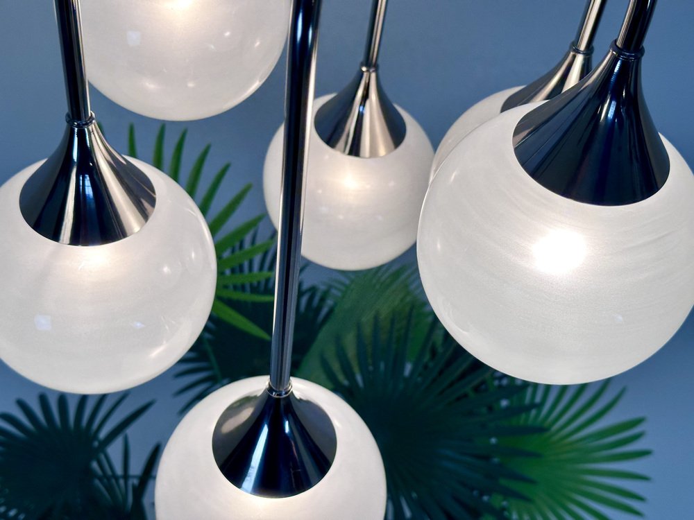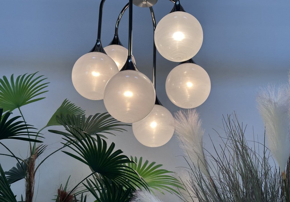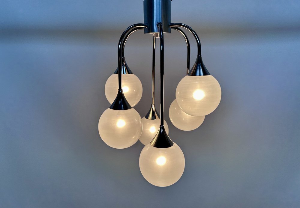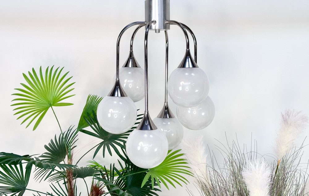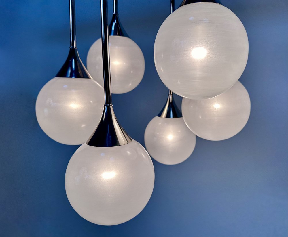 Italian Space Age Chromed Steel and Globe Milk Glass 6-Light Chandelier, 1960s