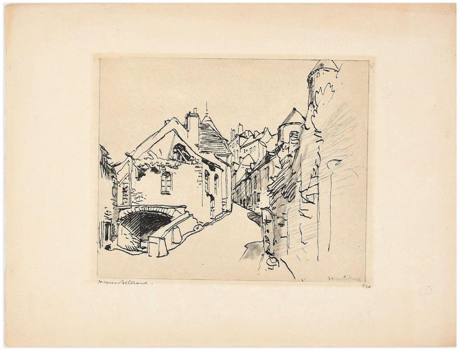 Jacques Beltrand, The Village, Original Etching on Paper, Early 20th Century